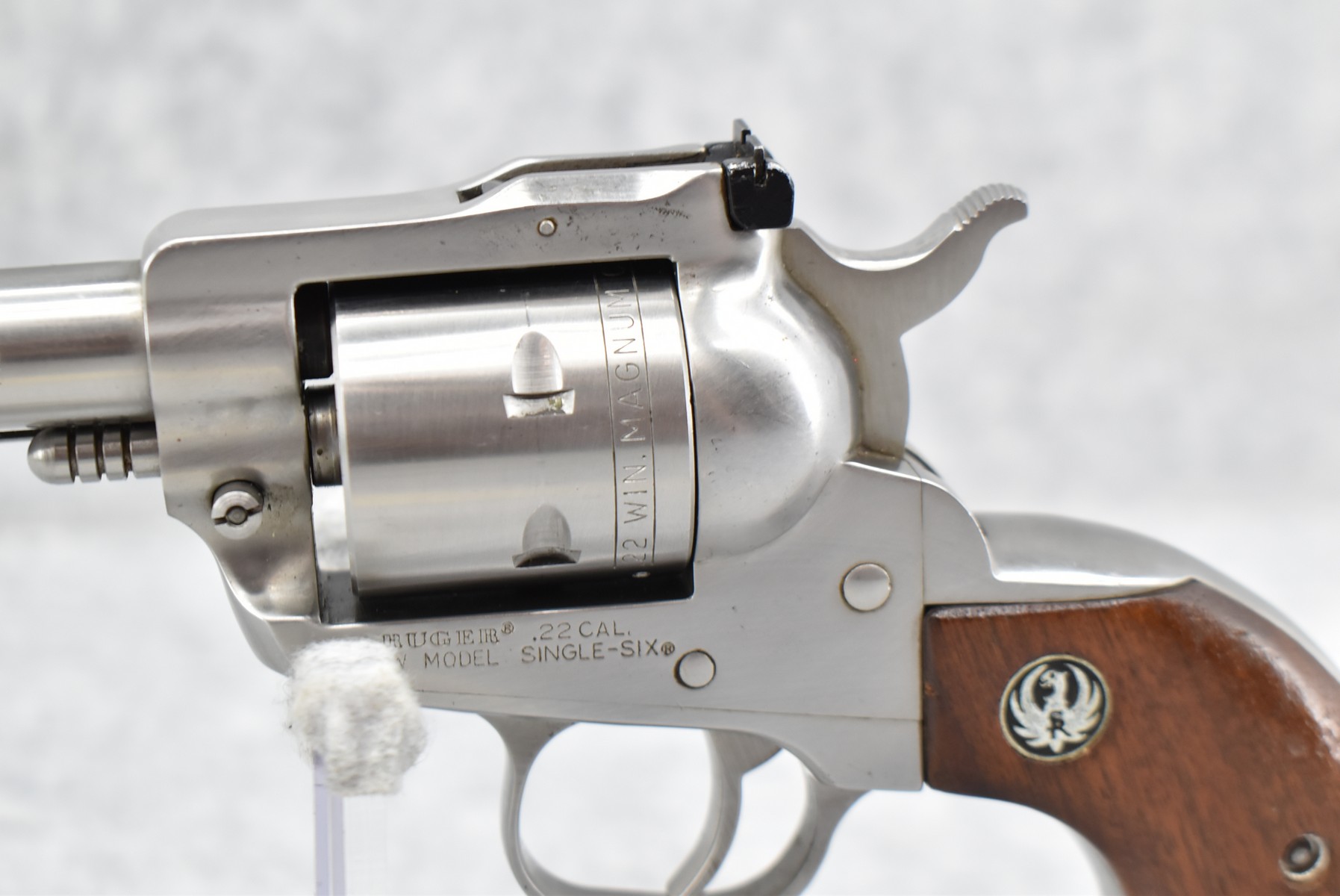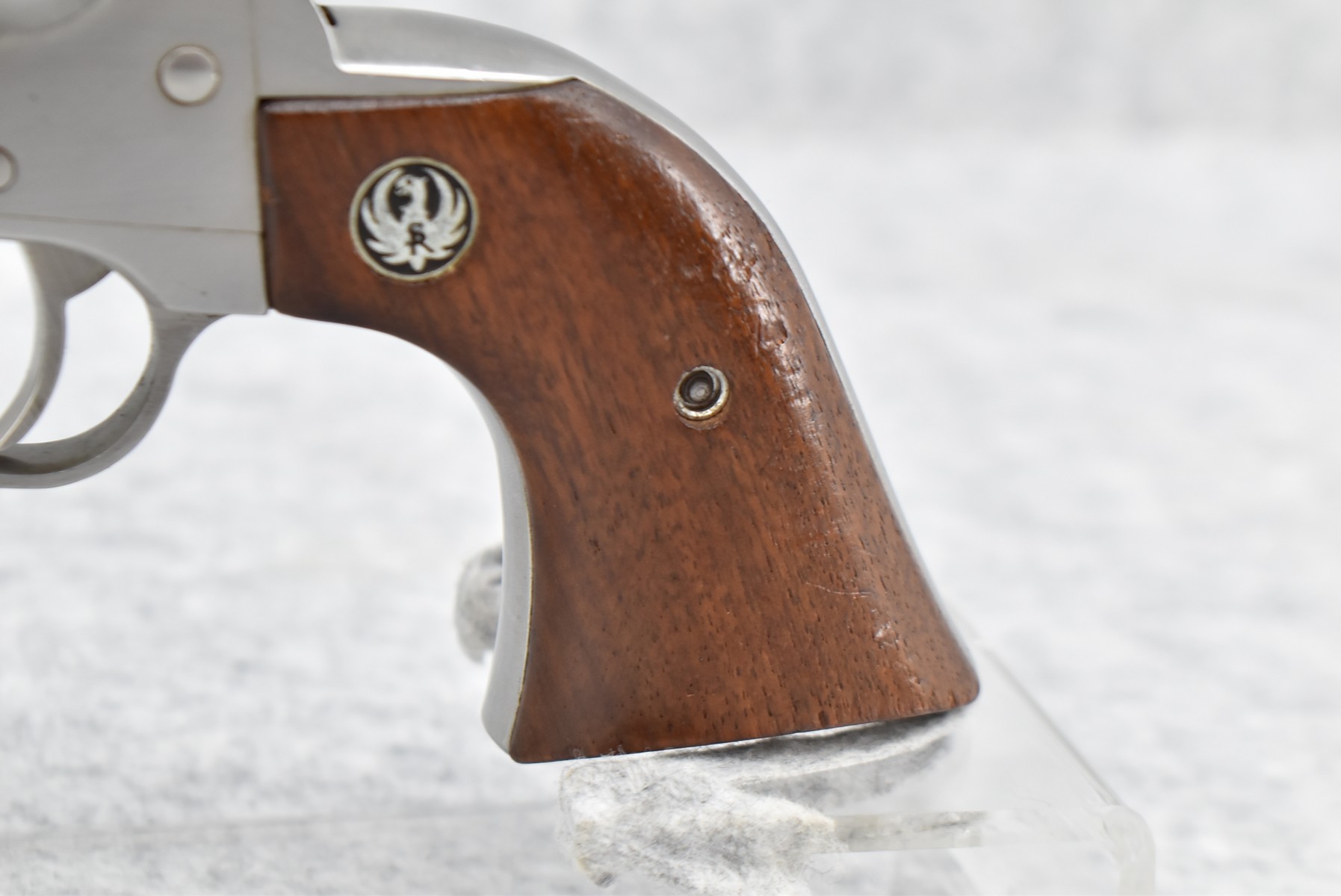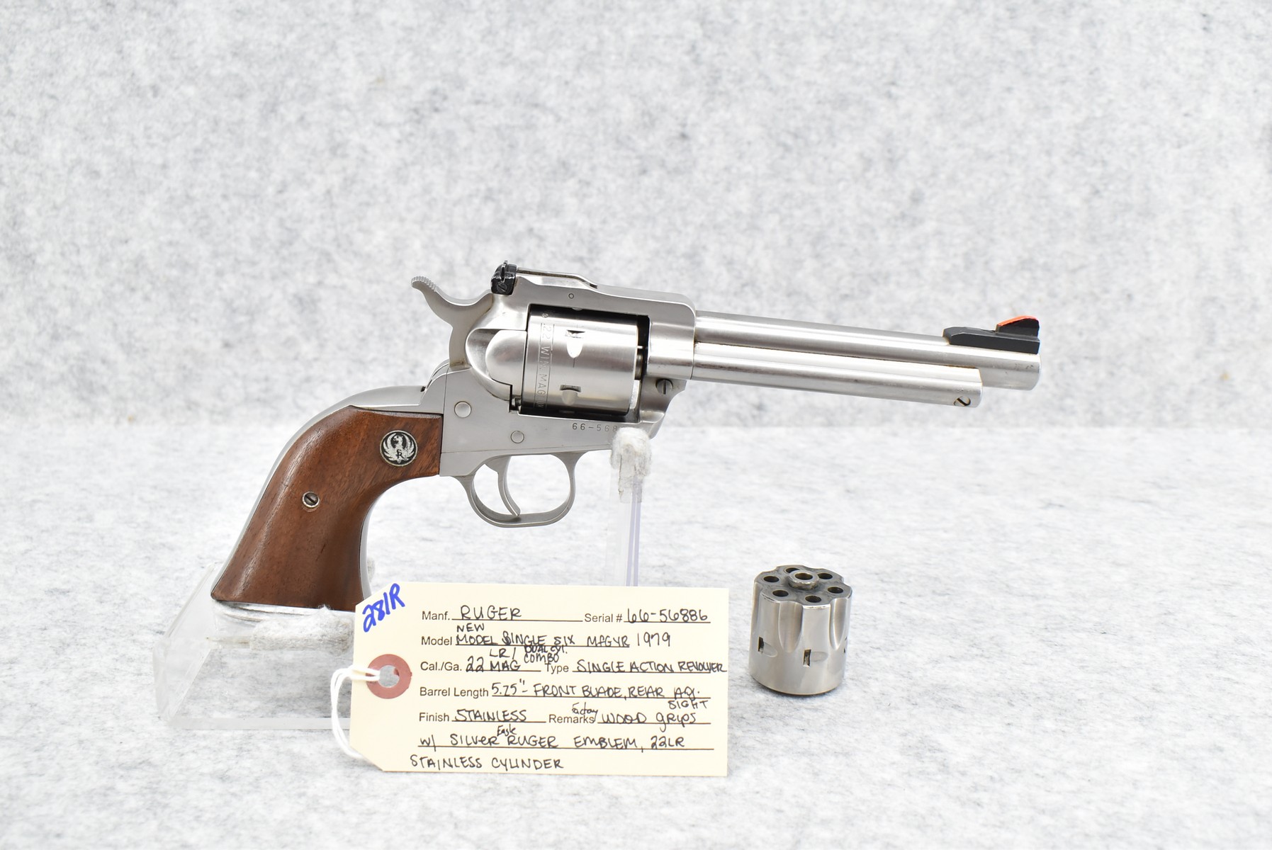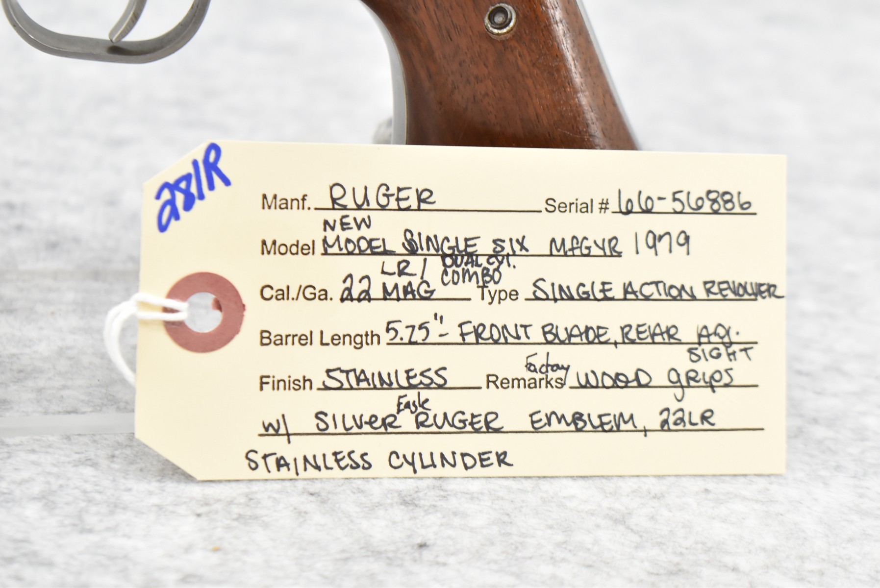 281R. Ruger – New Model Single Six – 22 Mag/22LR Cal. Dual Cylinder Combo Single Action Revolver – w/5.75” Barrel w/Front Blade & Rear Adj. Sight – Stainless Finish – w/Factory Wood Grips w/Silver Eagle Ruger Emblem – w/22LR Stainless Cylinder – Mfg. 1979