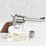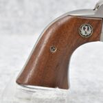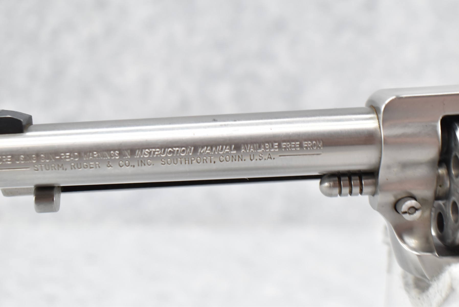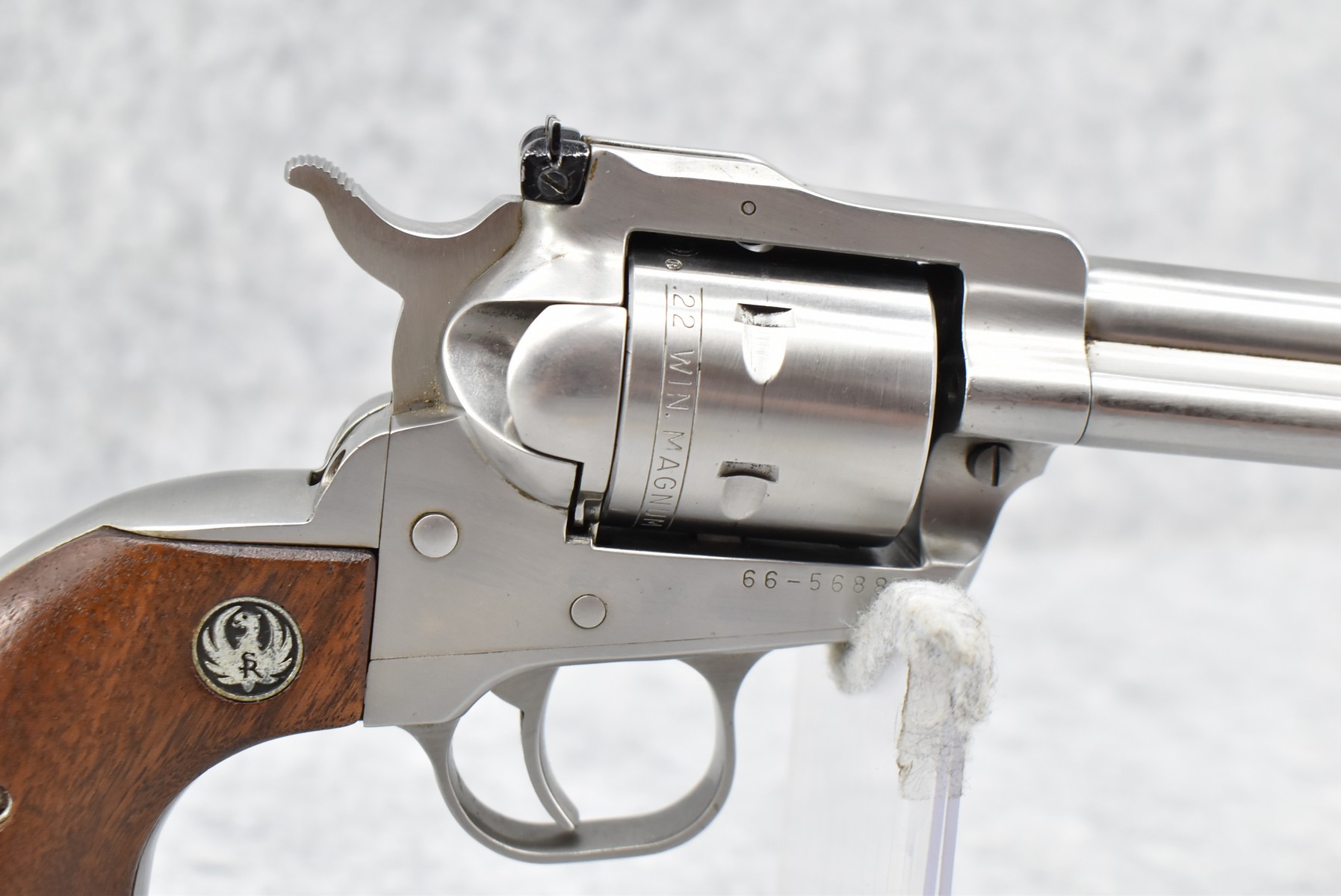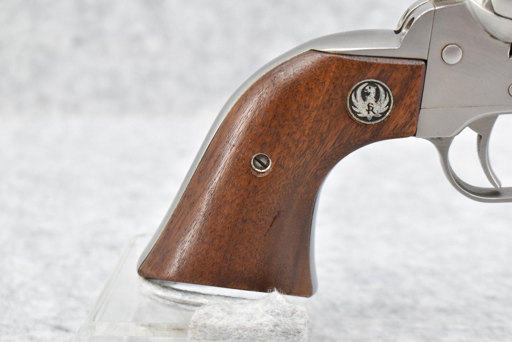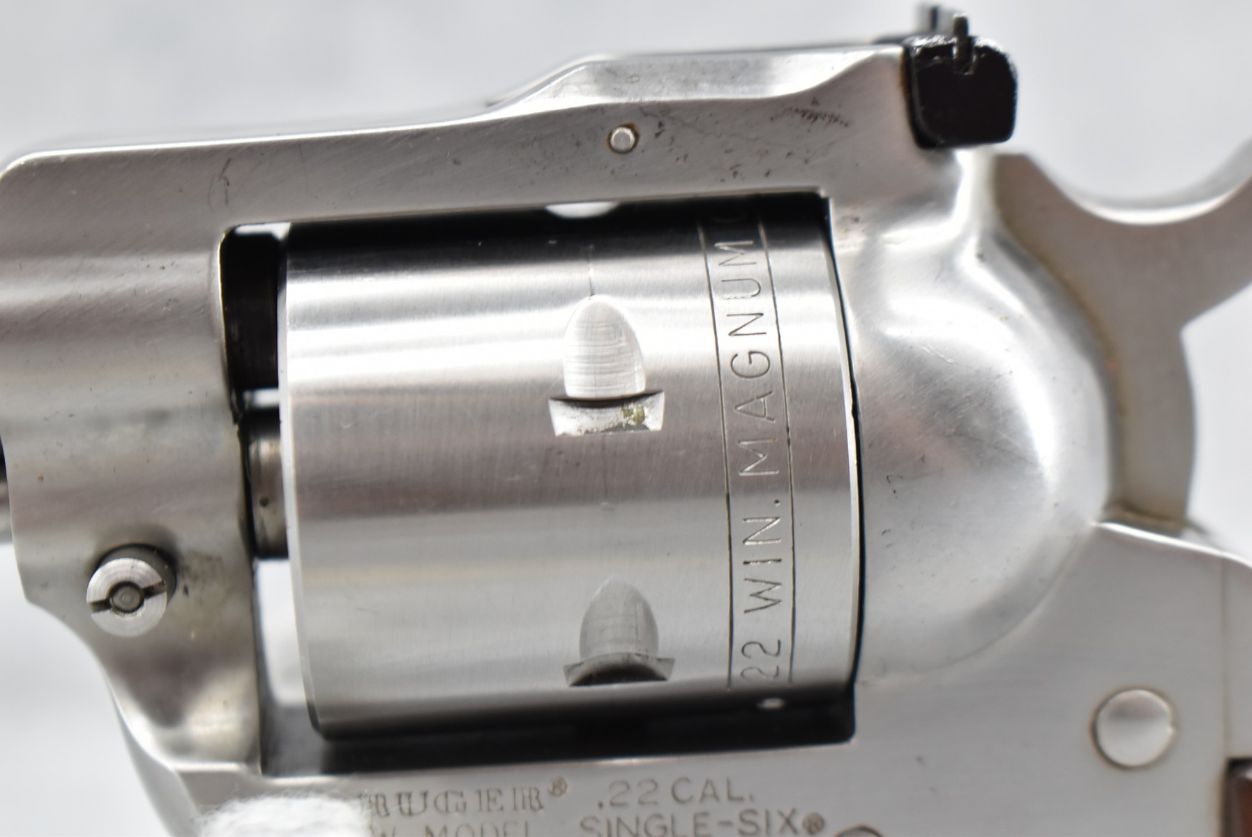 281R. Ruger – New Model Single Six – 22 Mag/22LR Cal. Dual Cylinder Combo Single Action Revolver – w/5.75” Barrel w/Front Blade & Rear Adj. Sight – Stainless Finish – w/Factory Wood Grips w/Silver Eagle Ruger Emblem – w/22LR Stainless Cylinder – Mfg. 1979