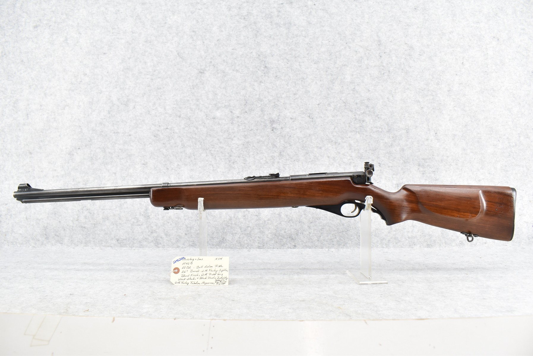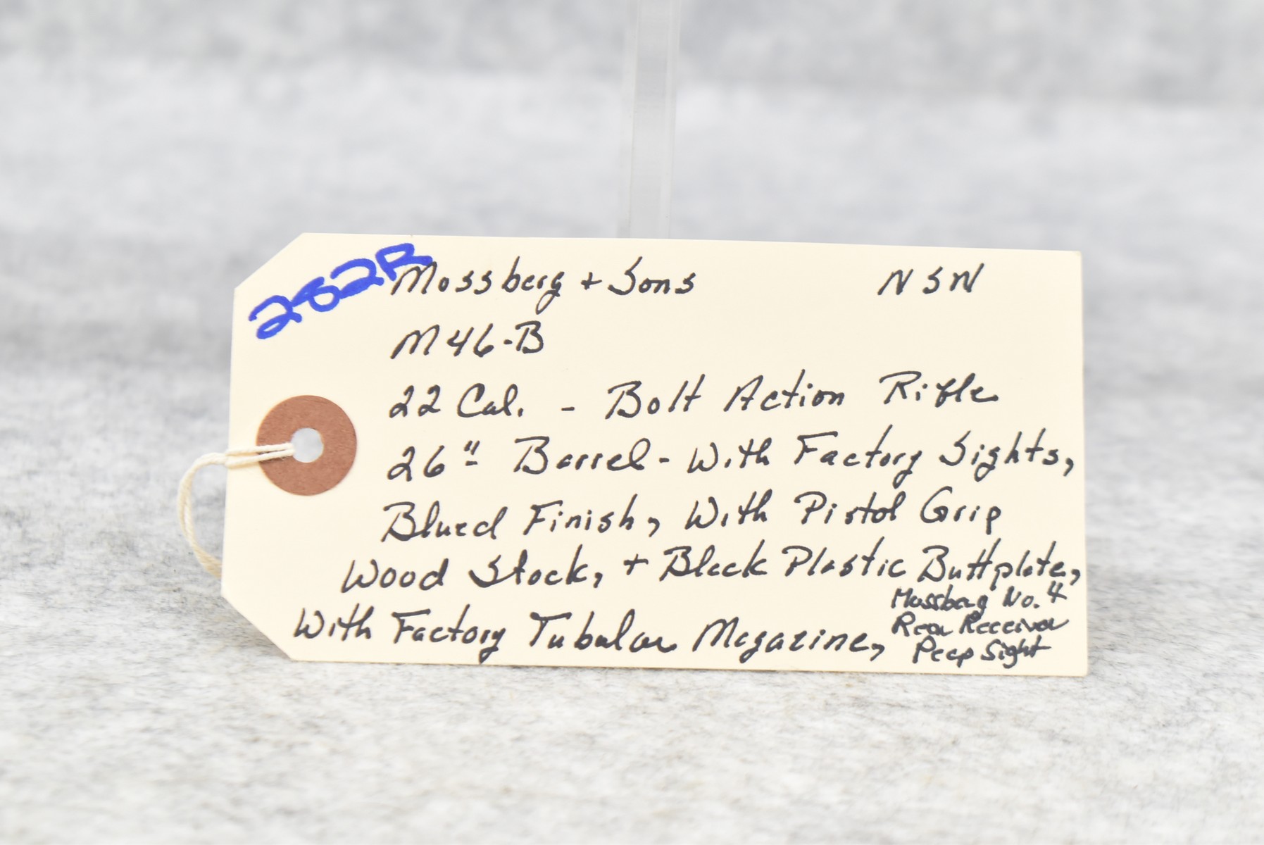 282R. Mossberg – Mod. M46-B – 22 Cal. Bolt Action Rifle – w/26” Barrel w/Factory Sights – Blued Finish – w/Pistol Grip Wood Stock w/Factory Butt Plate – w/Tubular Magazine – w/Mossberg No. 4 Rear Receiver Peep Sight