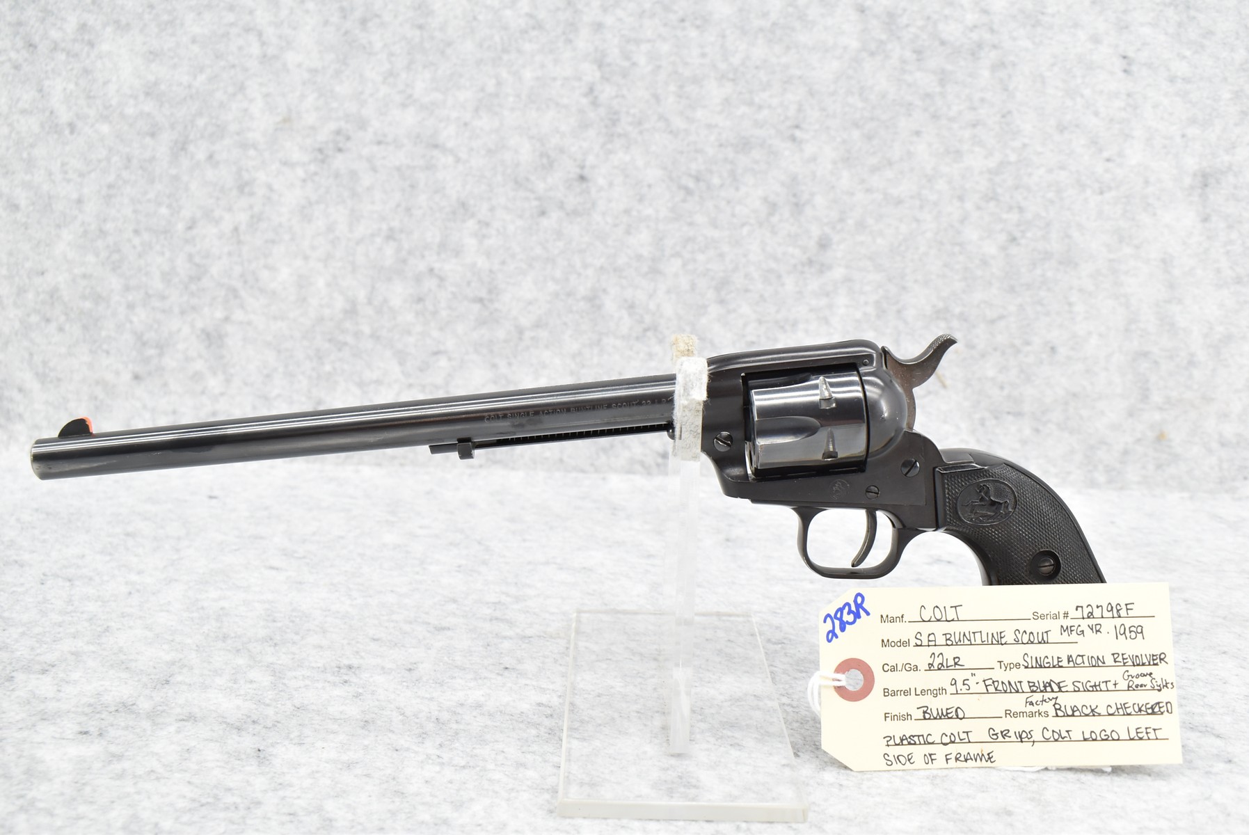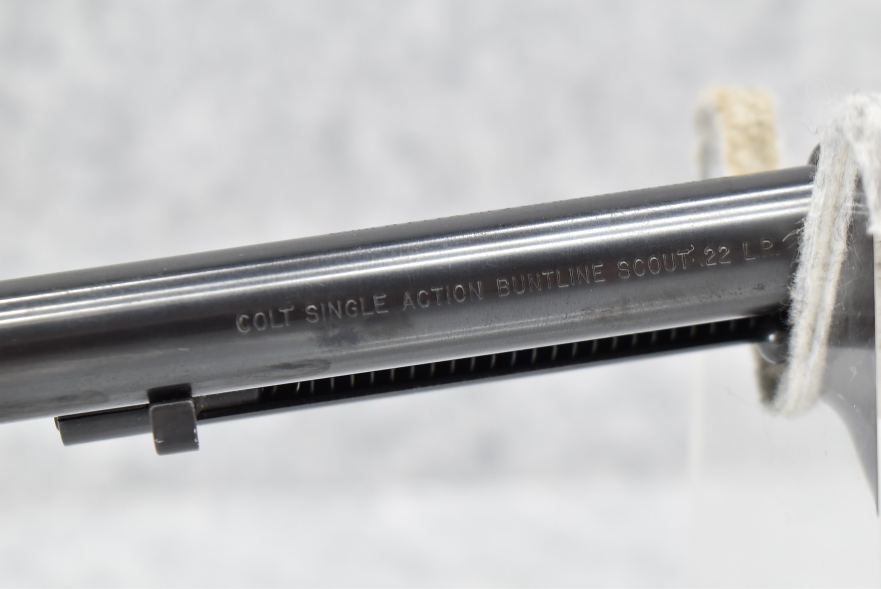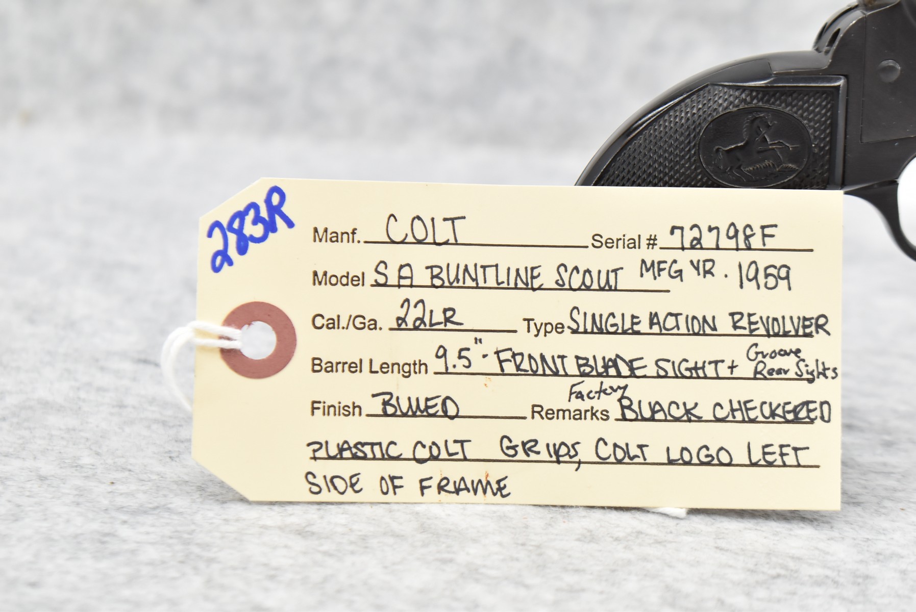 283R. Colt – Mod. Buntline Scout – 22LR Cal. Single Action Revolver – w/9.5” Barrel w/Front Blade & Groove Rear Sights – Blued Finish – w/Factory Rampant Colt Black Checkered Plastic Colt Grips – w/Rampant Colt on Left Side of Frame – Mfg. 1959