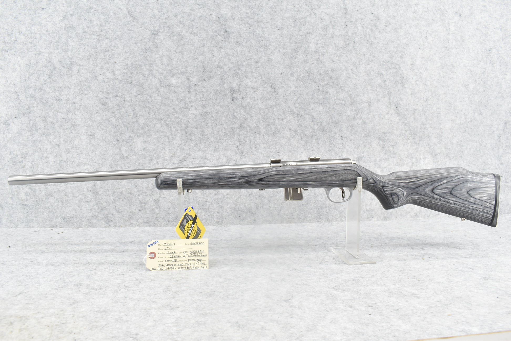 283R. Marlin – Mod. XT-17 – 17 HMR Cal. Bolt Action Rifle – w/22” Heavy Barrel – Stainless Finish – w/Pistol Grip Gray Laminate Wood Stock w/Factory Recoil Pad – w/2pc. Factory Bases – Unfired w/Factory Box, Profire Adj. Trigger, Manual & 2 Factory Detachable Mags (4Rd & 7Rd)