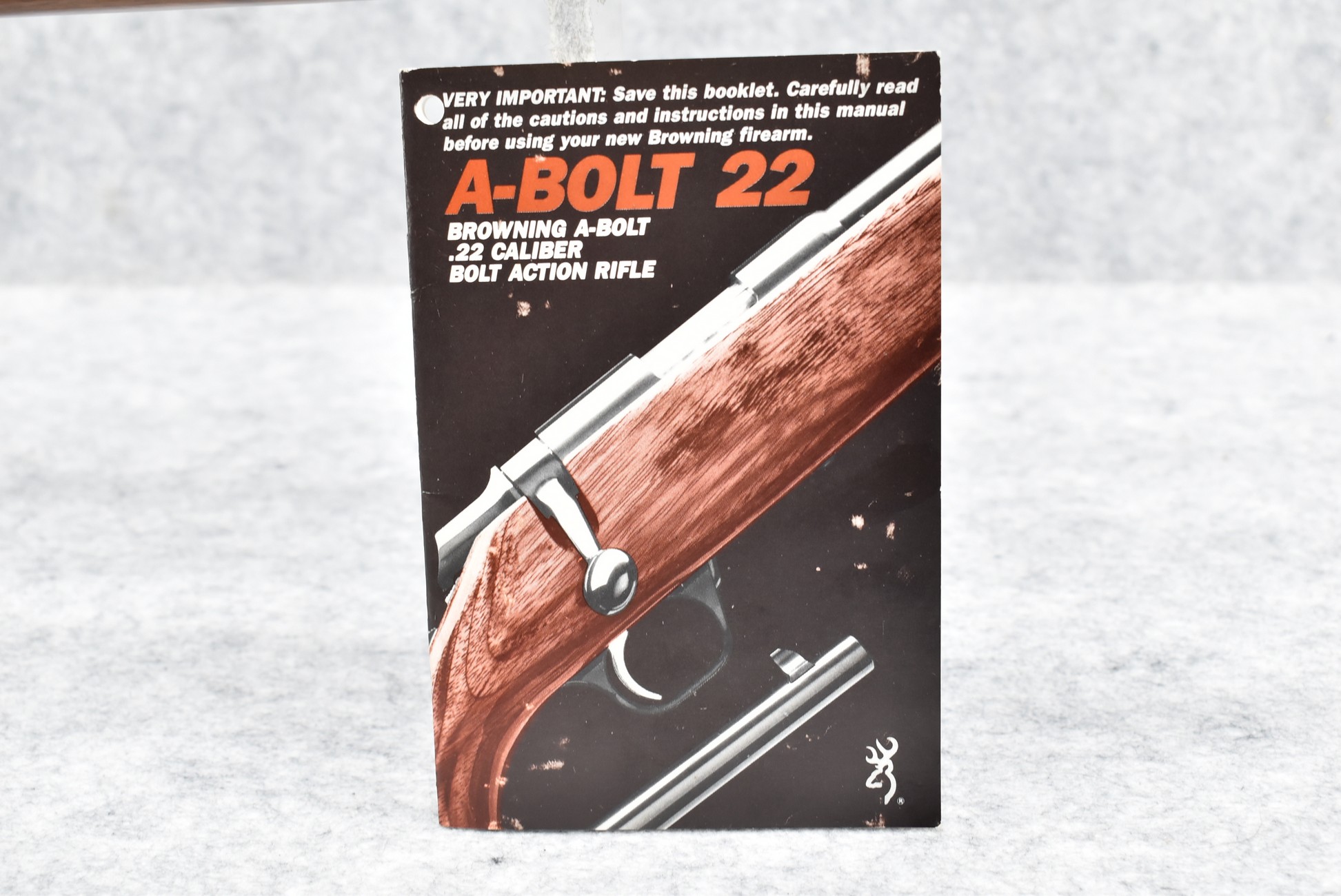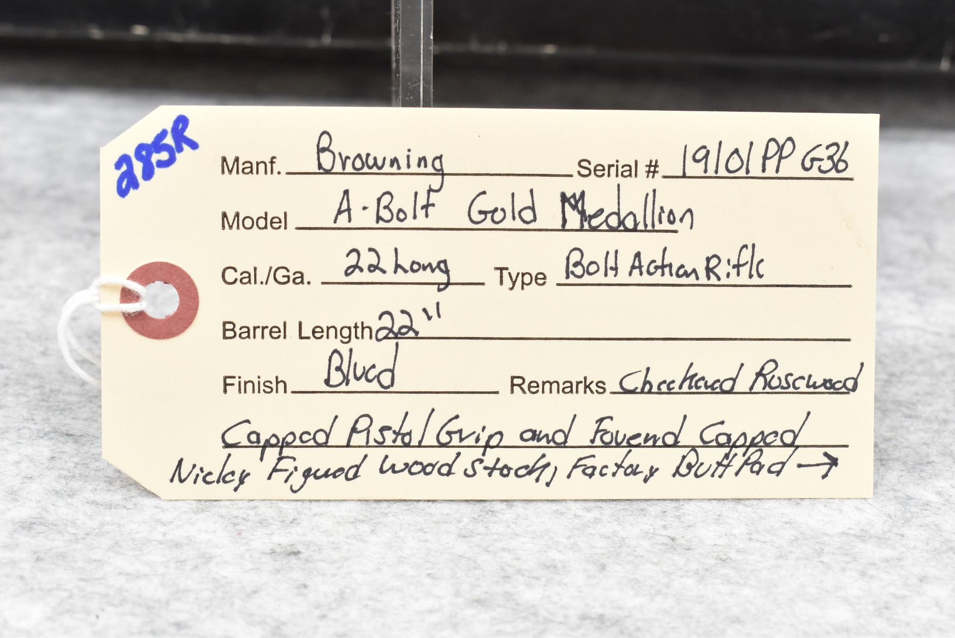 285R. Browning – Mod. A-Bolt Gold Medallion – 22 Long Cal. Bolt Action Rifle – w/22” Barrel – Blued Finish – w/Checkered Rosewood Capped Pistol Grip & Forend Capped Nicely Figured Wood Stock w/Factory Butt Pad – Gun Appears Unfired w/Box, Manual, Factory 5Rd & Factory 10Rd Mags – Mfg. Between 1988-1996 Only in Limited Quantities