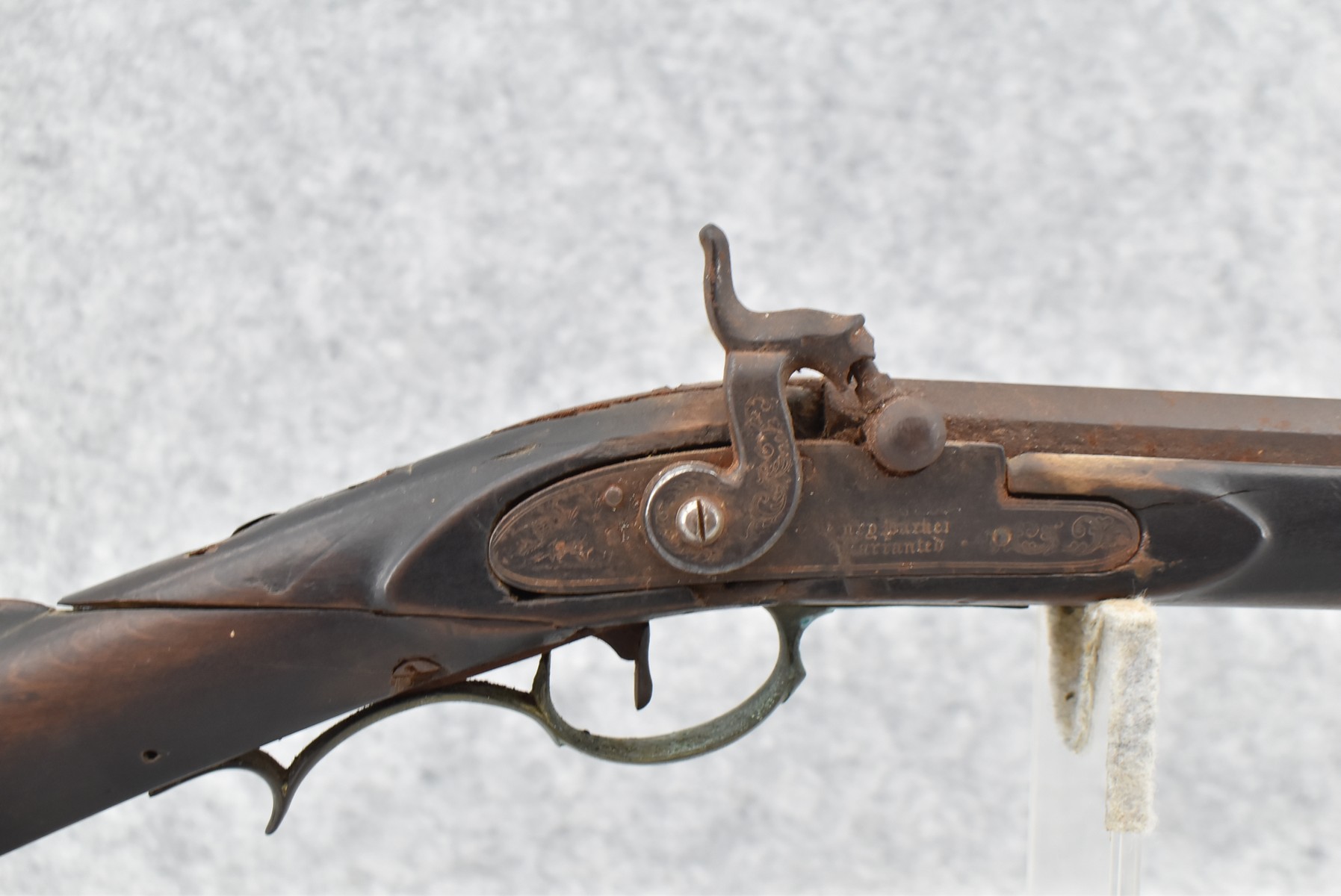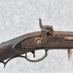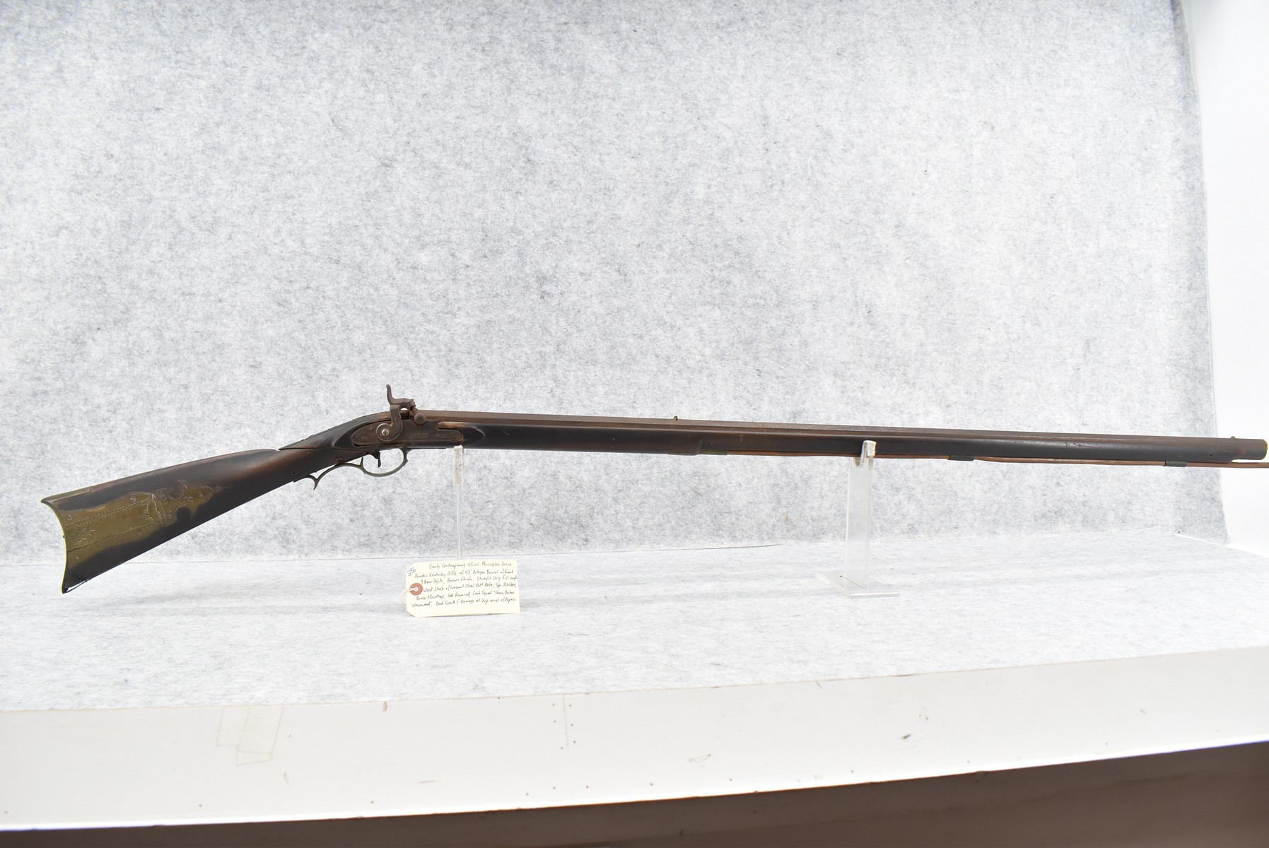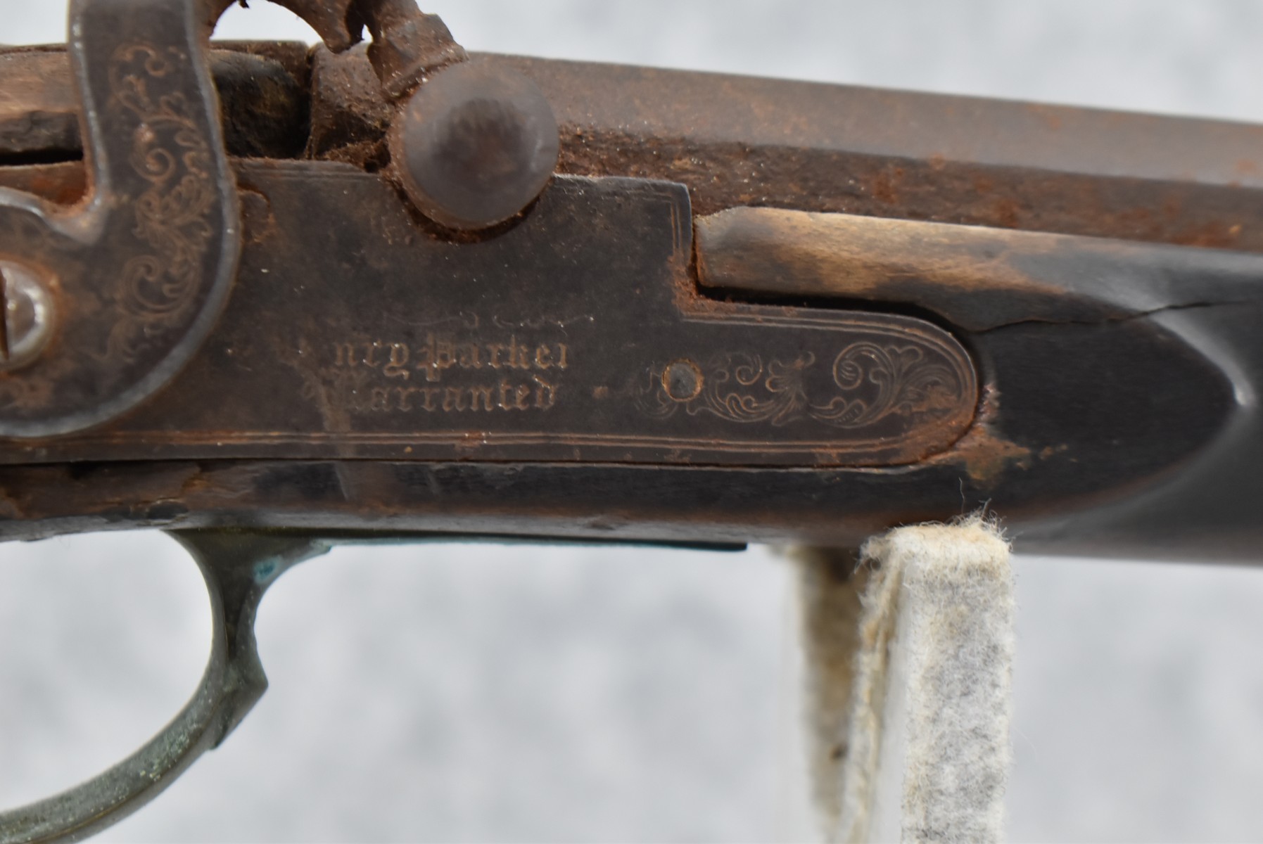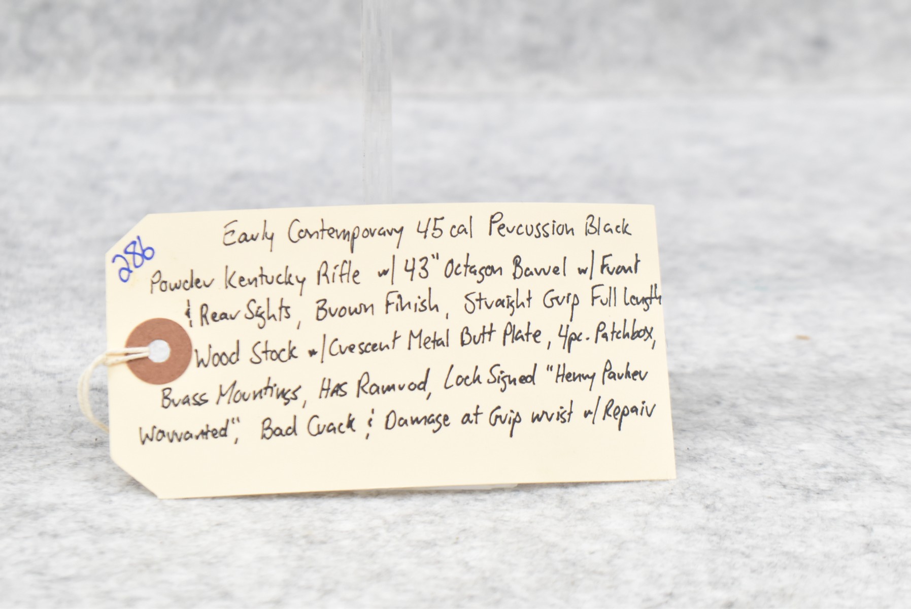 286. Early – 45 Cal. Black Powder Percussion Kentucky Rifle – w/43” Octagon Barrel w/Front & Rear Sights – Brown Finish – w/Straight Grip Full Length Wood Stock w/Crescent Metal Butt Plate, 4pc. Patch Box & Brass Mountings – Lock Signed “Henry Parker Warranted” – Note: Bad Crack & Damage at Grip Wrist w/Repair
