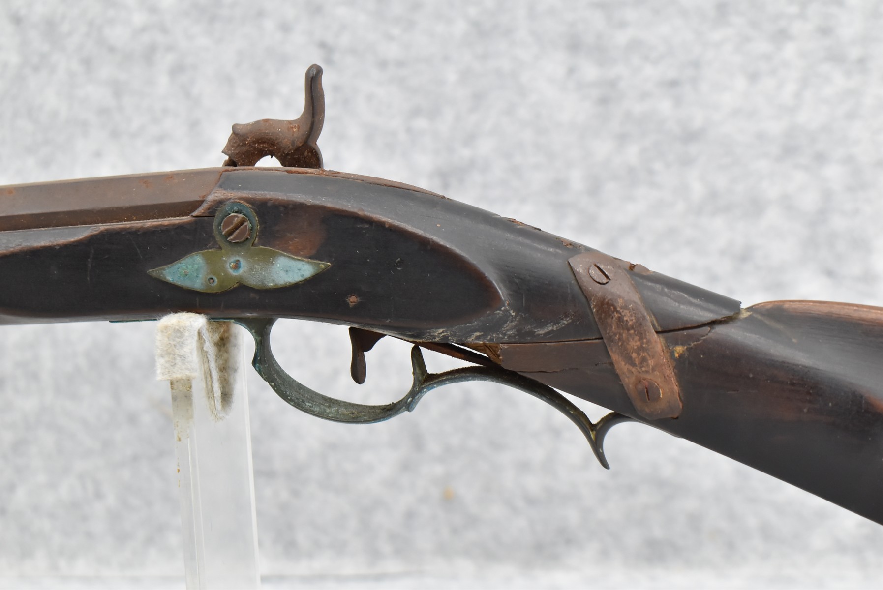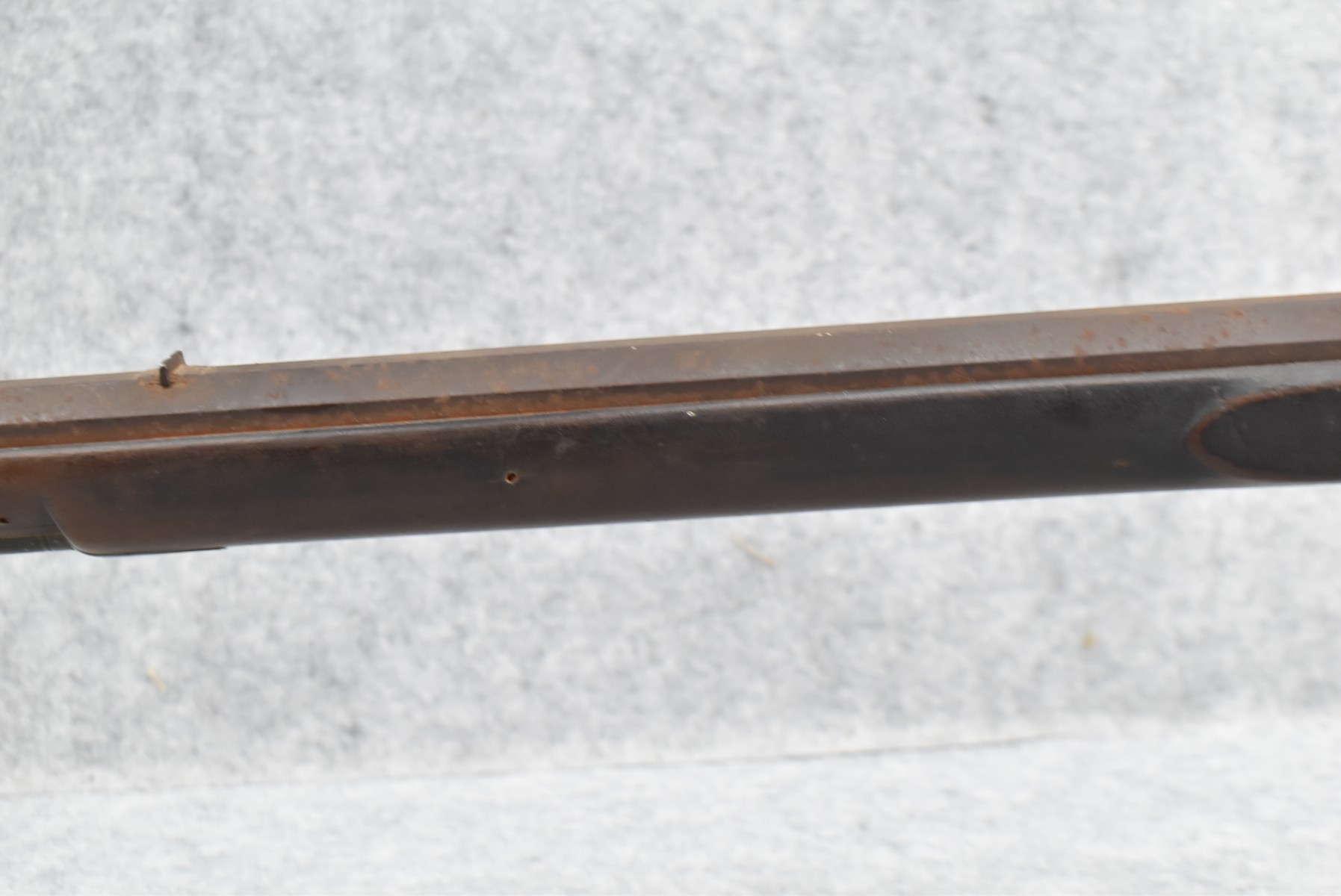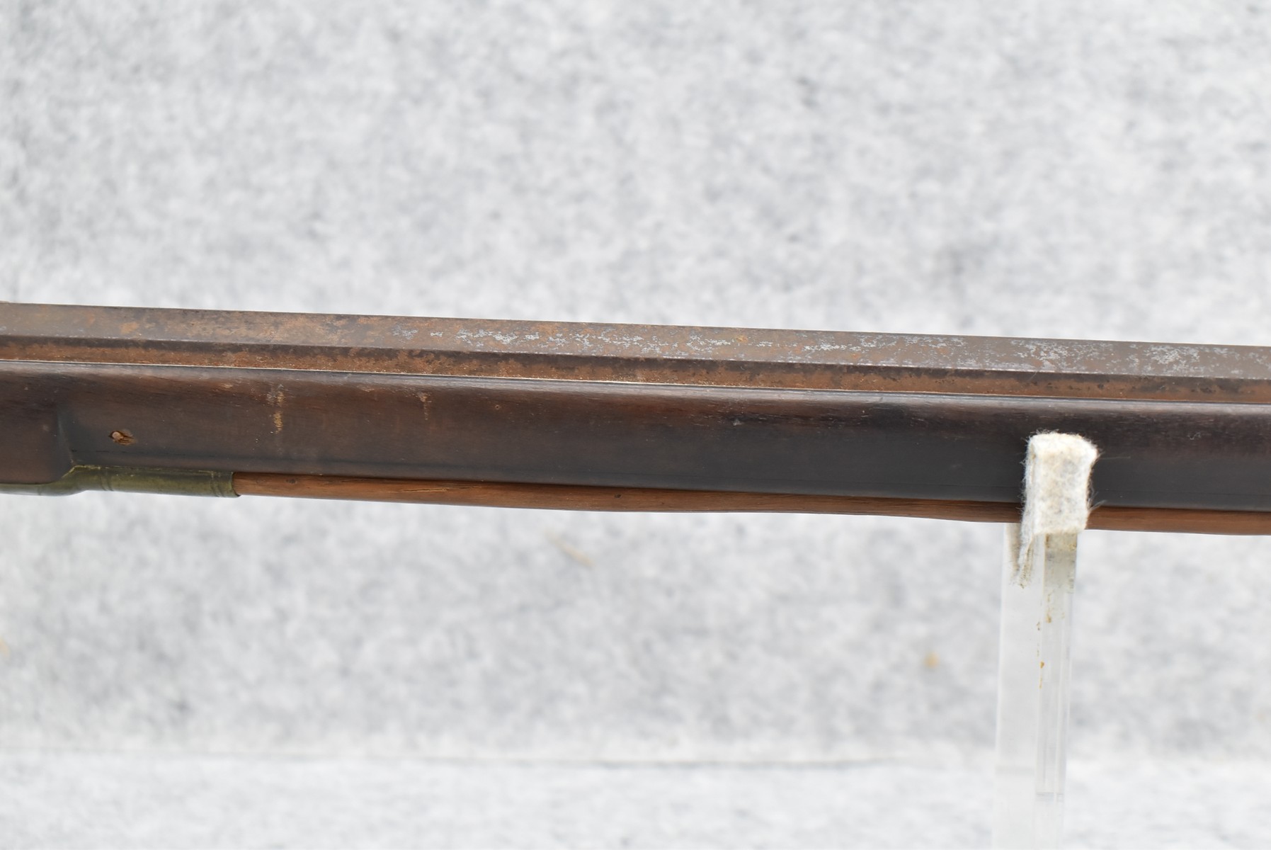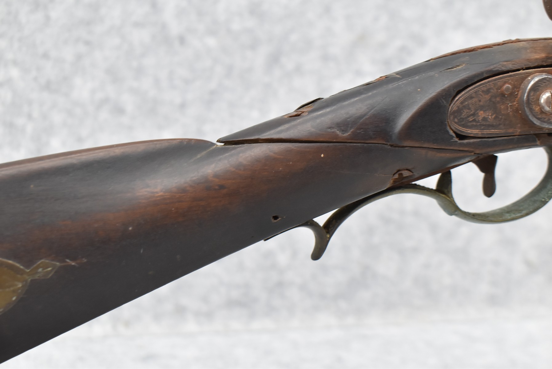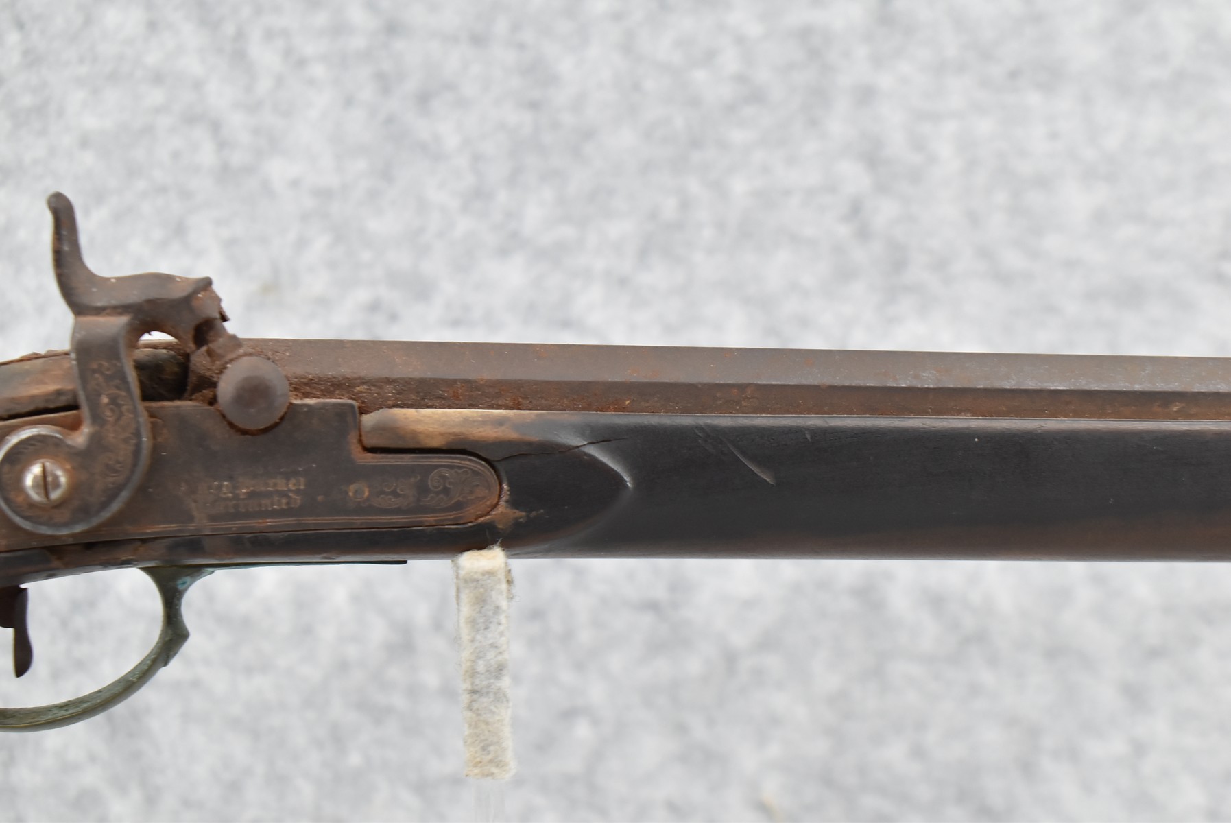 286. Early – 45 Cal. Black Powder Percussion Kentucky Rifle – w/43” Octagon Barrel w/Front & Rear Sights – Brown Finish – w/Straight Grip Full Length Wood Stock w/Crescent Metal Butt Plate, 4pc. Patch Box & Brass Mountings – Lock Signed “Henry Parker Warranted” – Note: Bad Crack & Damage at Grip Wrist w/Repair