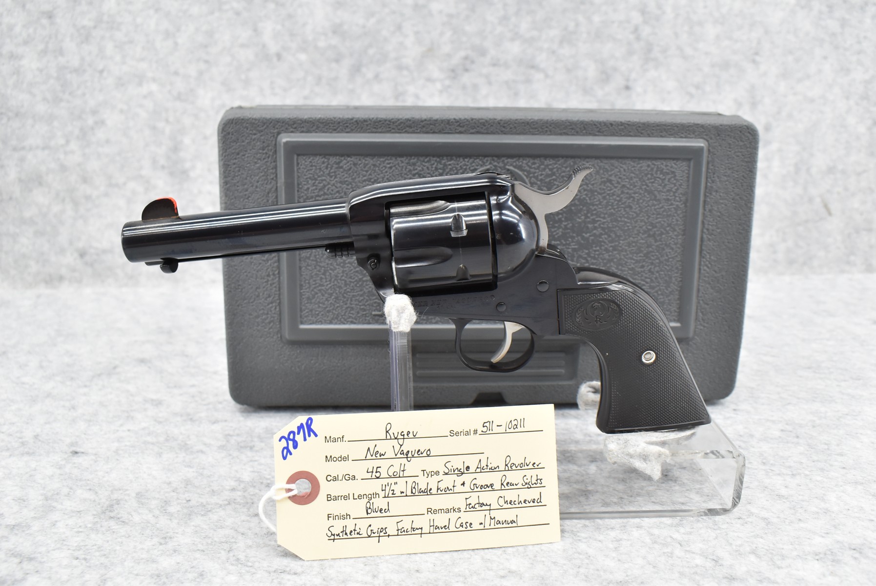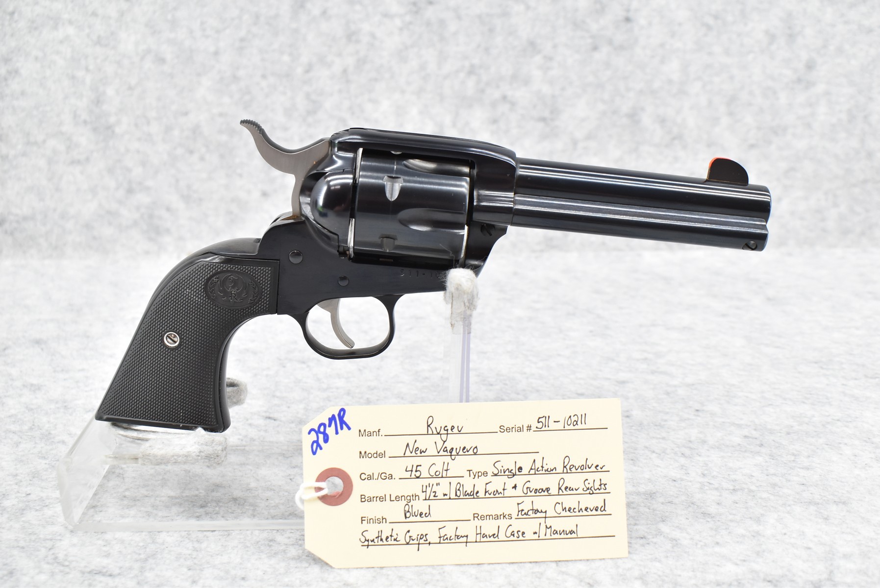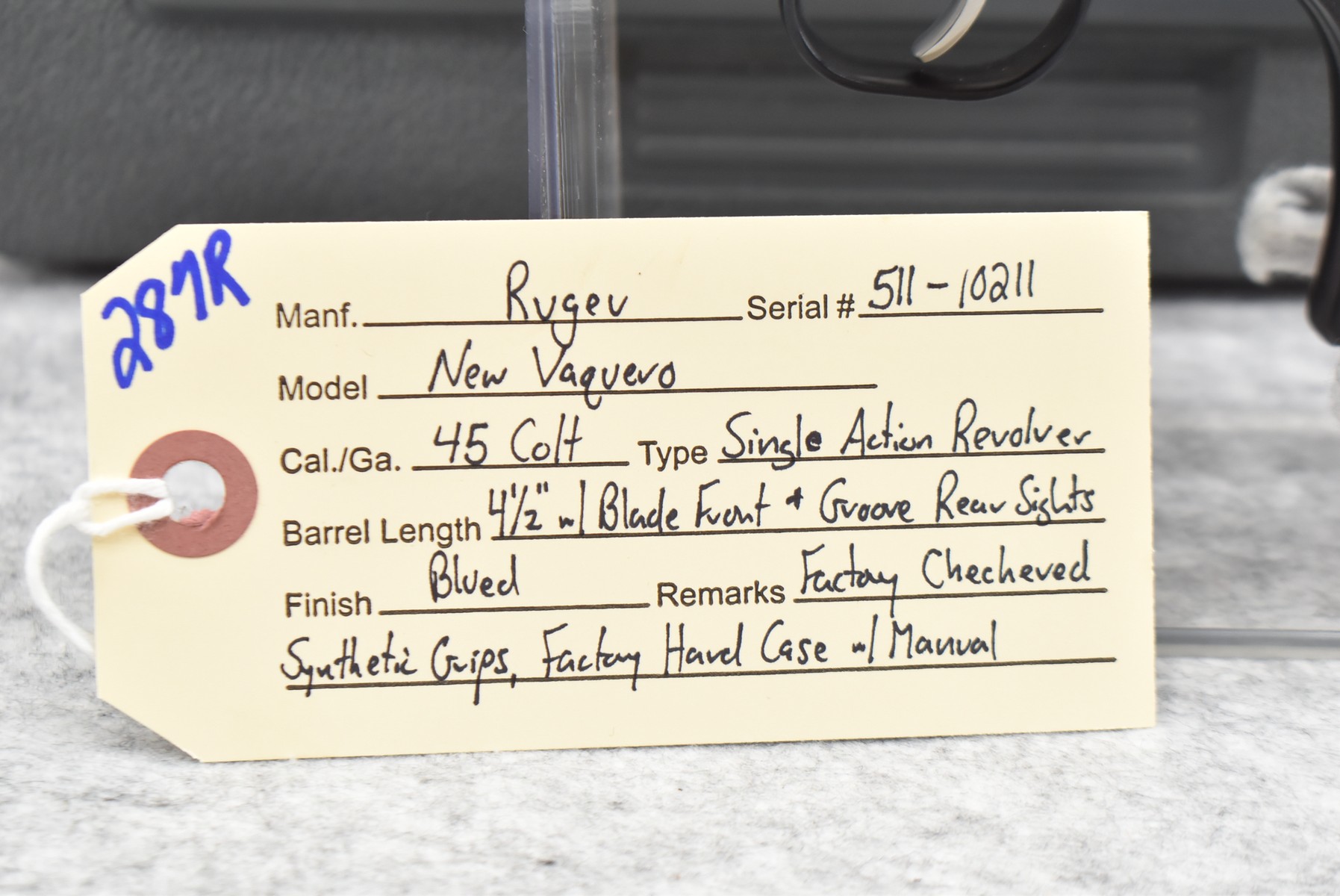 287R. Ruger – Mod. New Vaquero – 45 Colt Cal. Single Action Revolver – w/4 ½” Barrel w/Blade Front & Groove Rear Sights – Blued Finish – w/Factory Checkered Synthetic Grips – w/Factory Hard Case & Manual