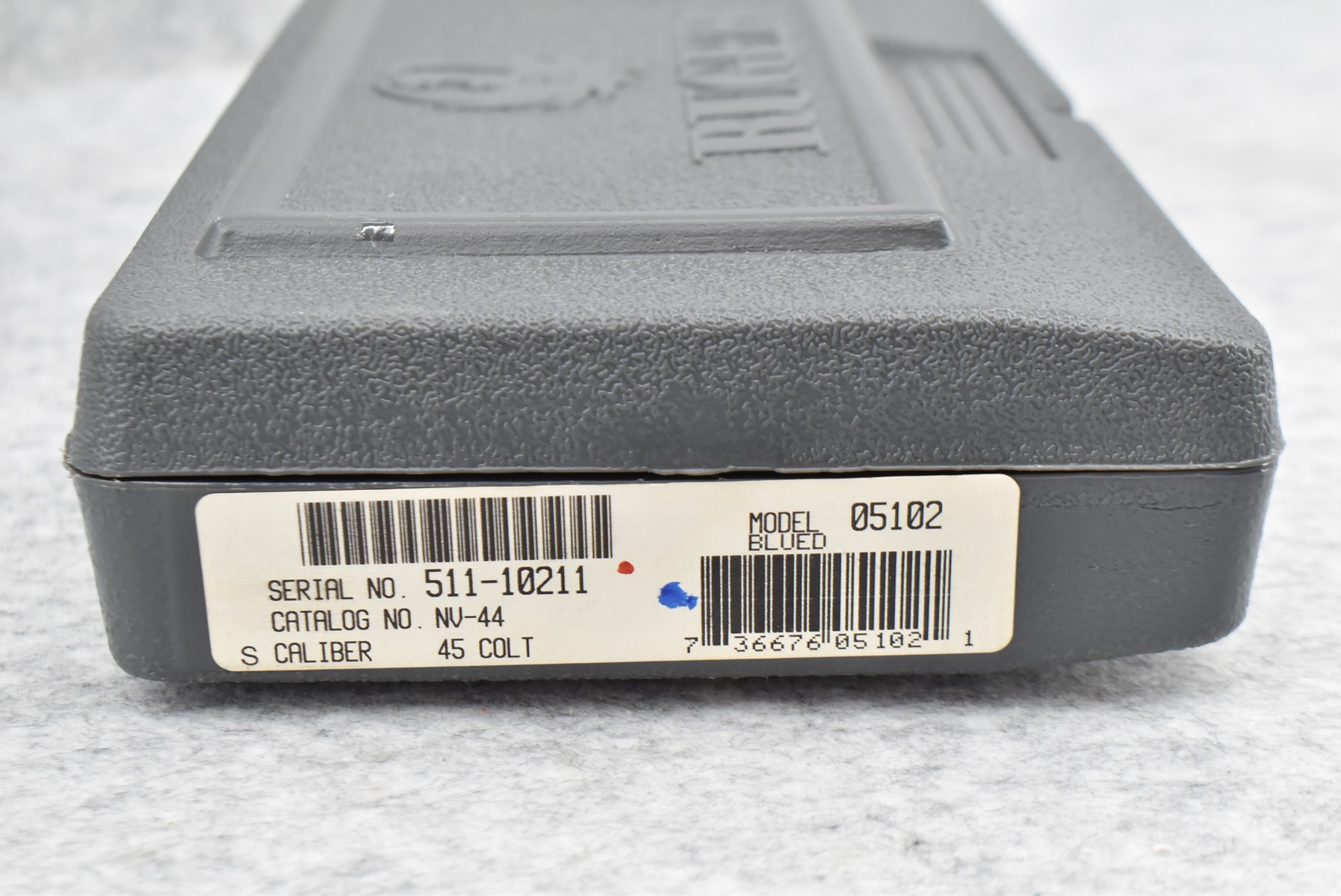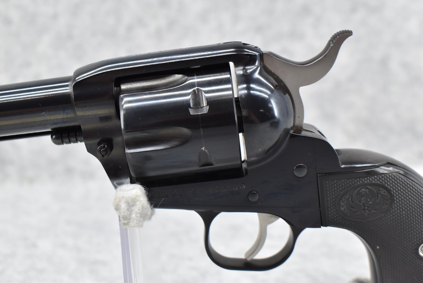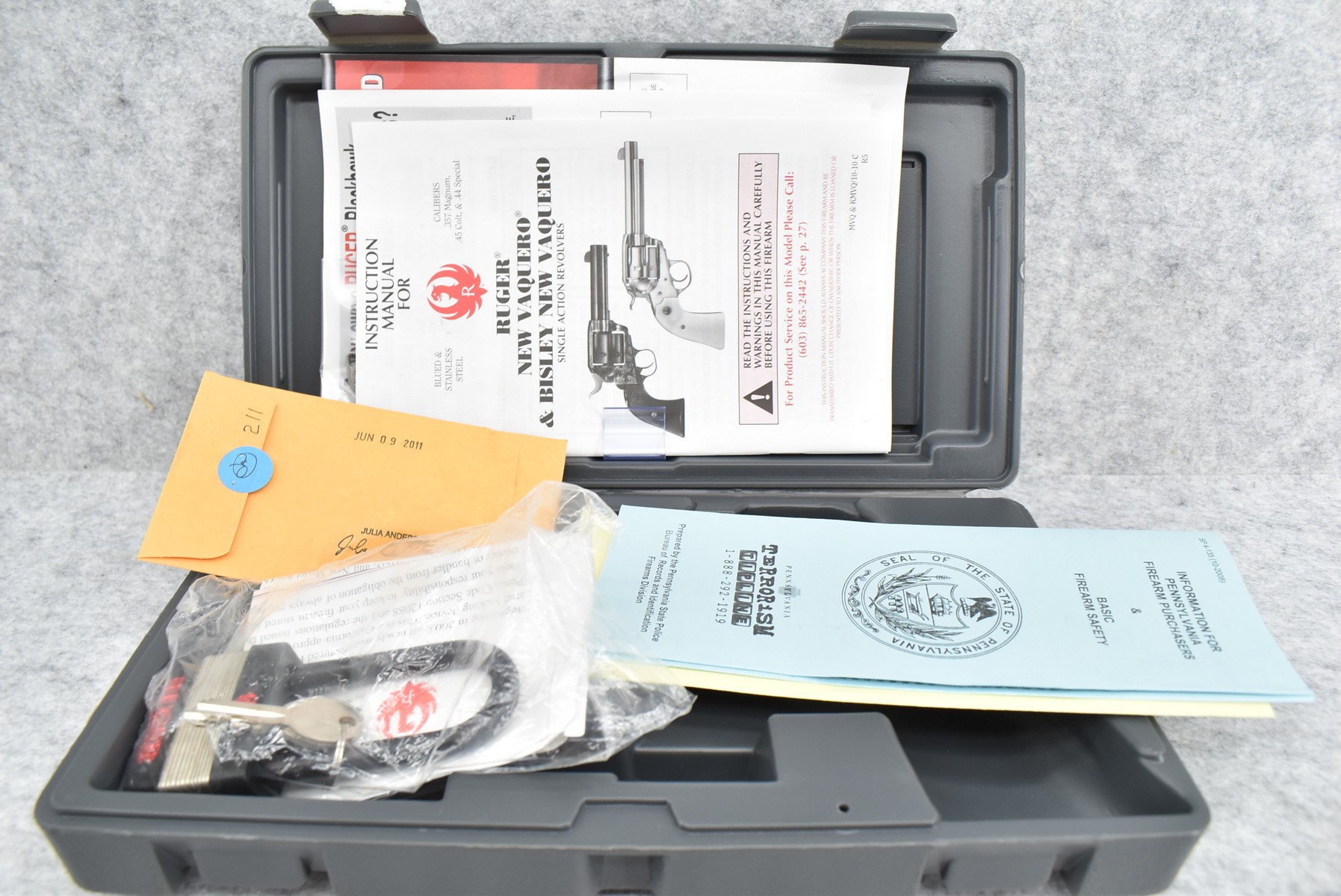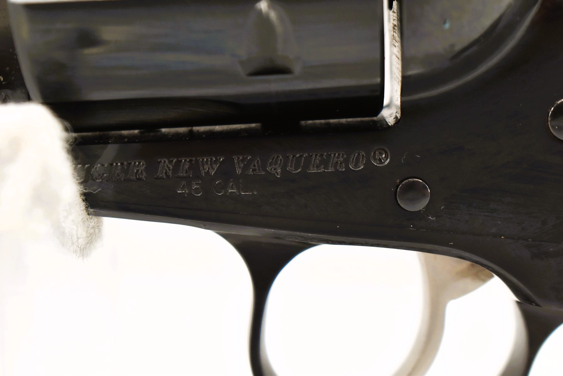 287R. Ruger – Mod. New Vaquero – 45 Colt Cal. Single Action Revolver – w/4 ½” Barrel w/Blade Front & Groove Rear Sights – Blued Finish – w/Factory Checkered Synthetic Grips – w/Factory Hard Case & Manual