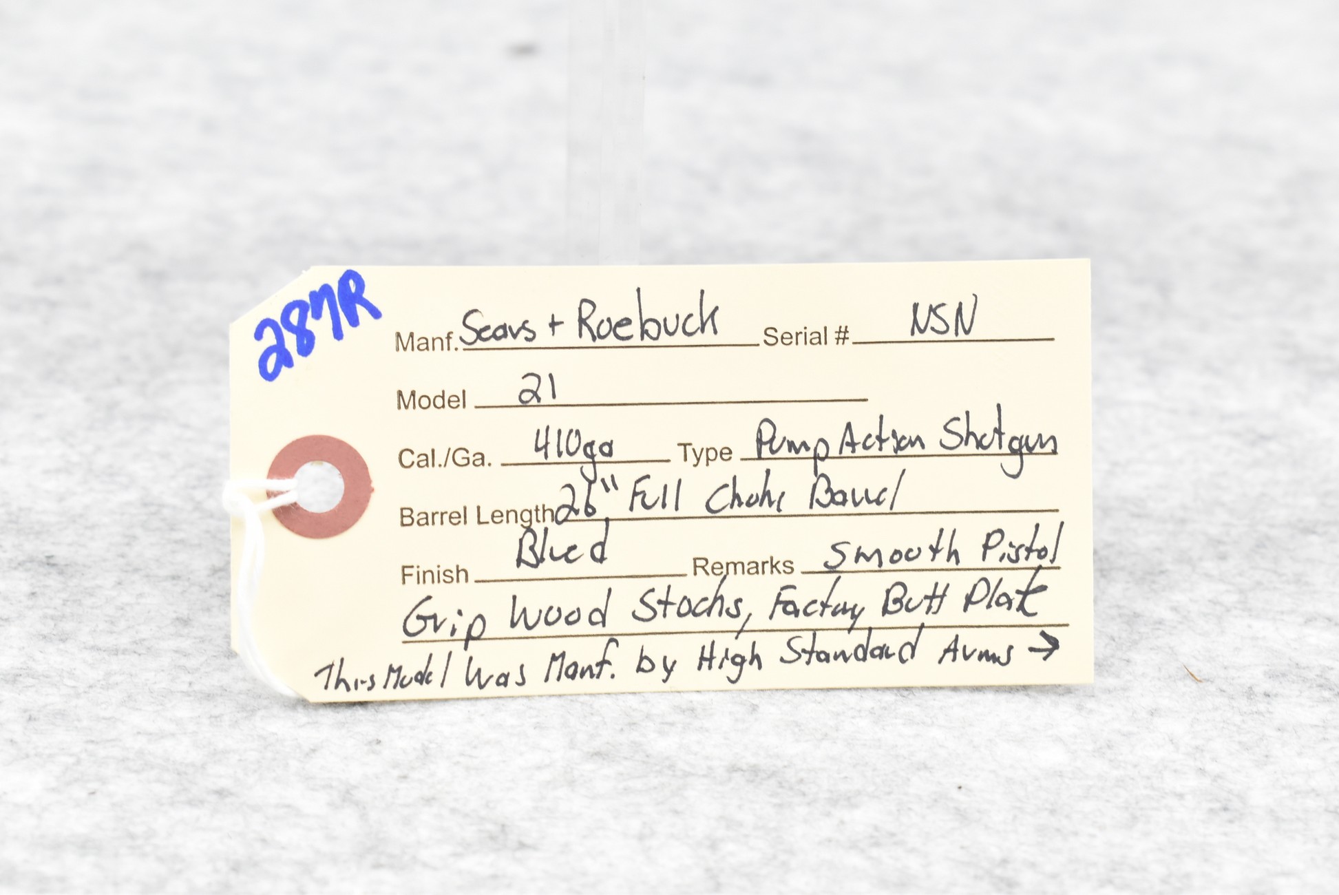 287R. Sears & Roebuck – Mod. 21 – 410ga. Pump Action Shotgun – w/26” Full Choke Barrel – Blued Finish – w/Smooth Pistol Grip Wood Stocks w/Factory Butt Plate – This Model was Mfg. by High Standard Arms for Sears in the Early to Mid 1960’s Based on the High Standard Flight King K-Series