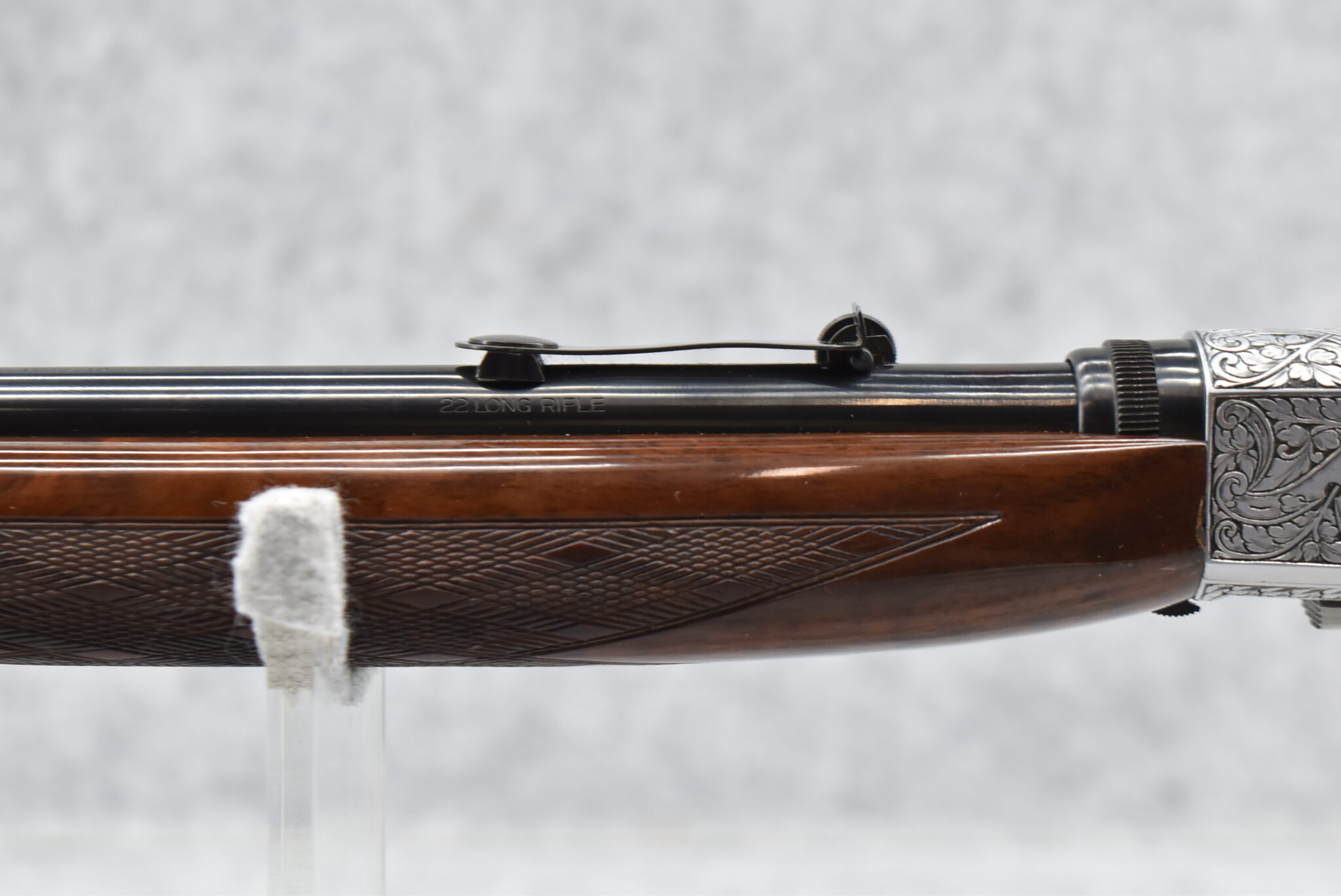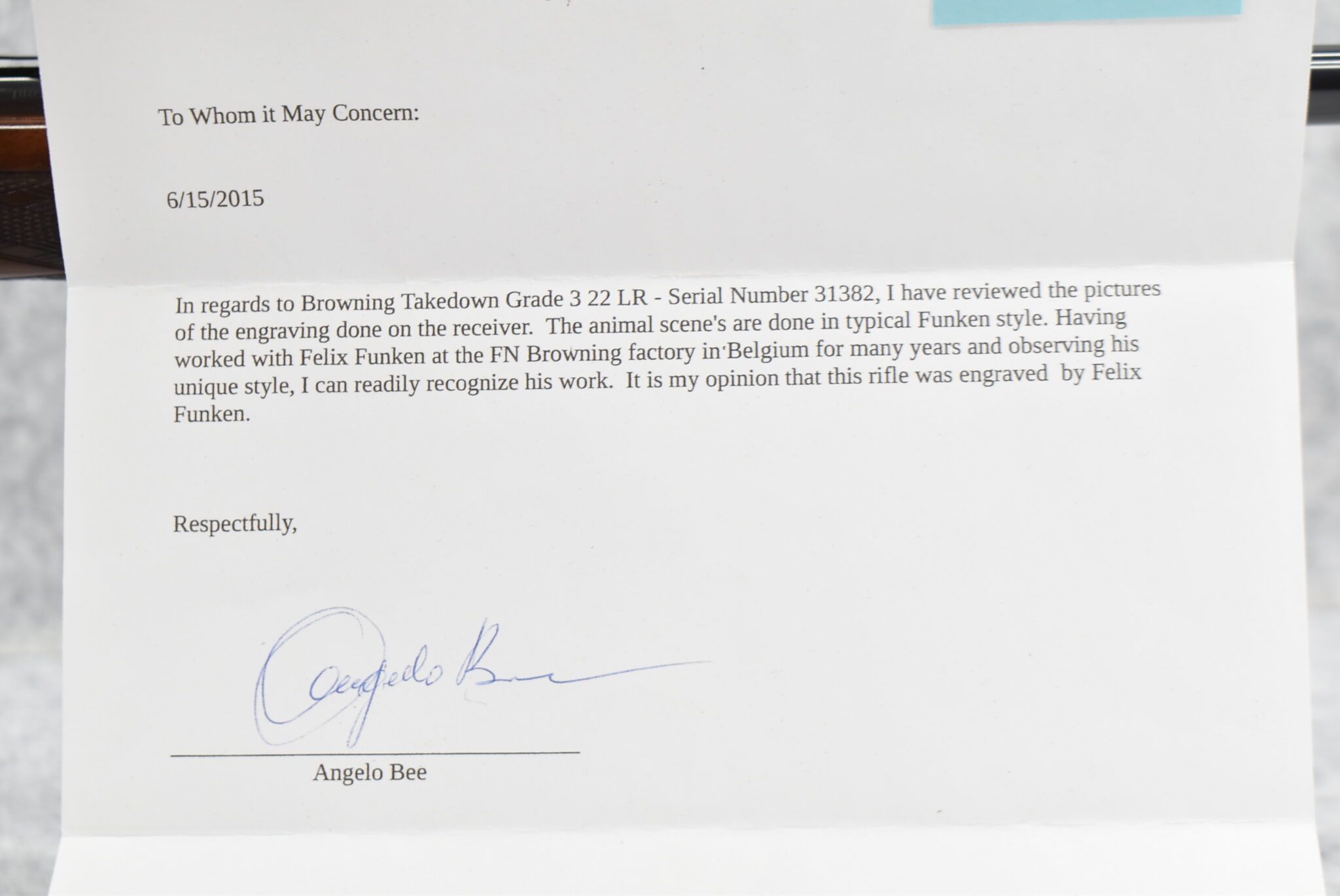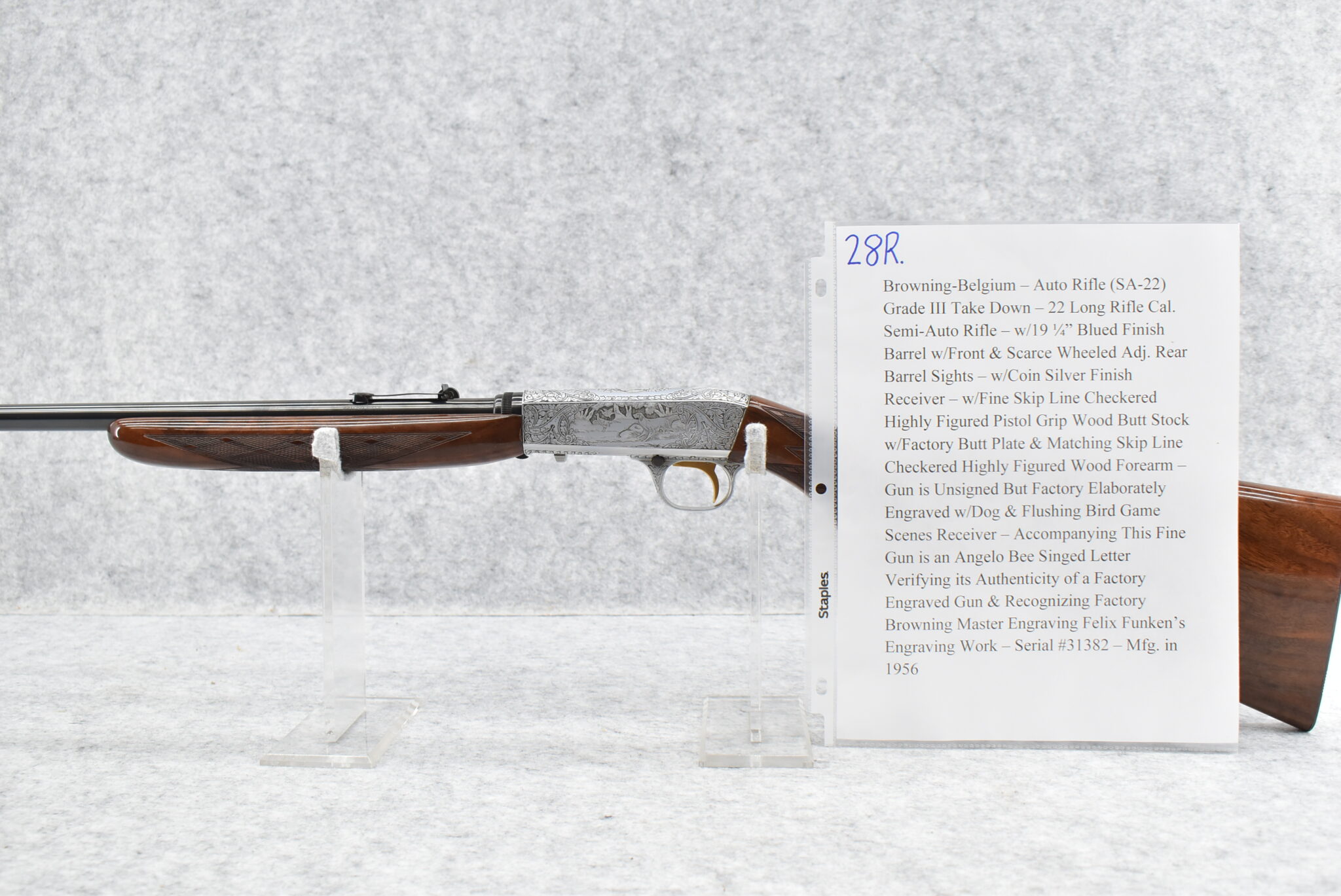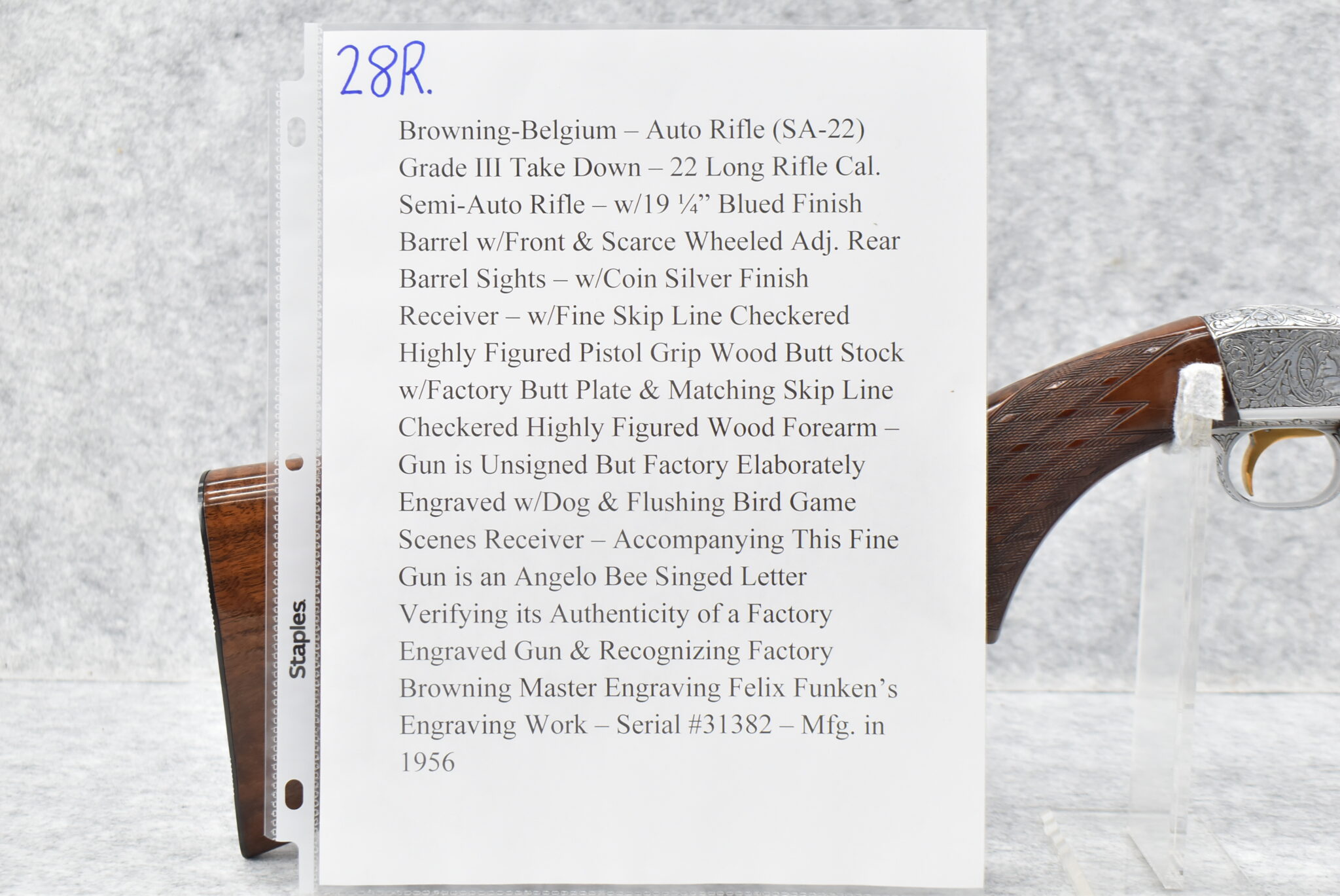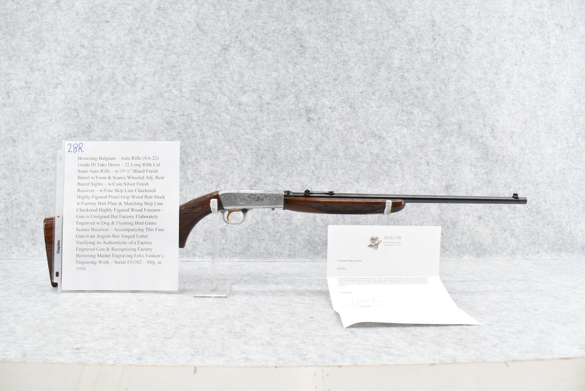 28R. Browning-Belgium – Auto Rifle (SA-22) Grade III Take Down – 22 Long Rifle Cal. Semi-Auto Rifle – w/19 ¼” Blued Finish Barrel w/Front & Scarce Wheeled Adj. Rear Barrel Sights – w/Coin Silver Finish Receiver – w/Fine Skip Line Checkered Highly Figured Pistol Grip Wood Butt Stock w/Factory Butt Plate & Matching Skip Line Checkered Highly Figured Wood Forearm – Gun is Unsigned But Factory Elaborately Engraved w/Dog & Flushing Bird Game Scenes Receiver – Accompanying This Fine Gun is an Angelo Bee Singed Letter Verifying its Authenticity of a Factory Engraved Gun & Recognizing Factory Browning Master Engraving Felix Funken’s Engraving Work – Serial #31382 – Mfg. in 1956