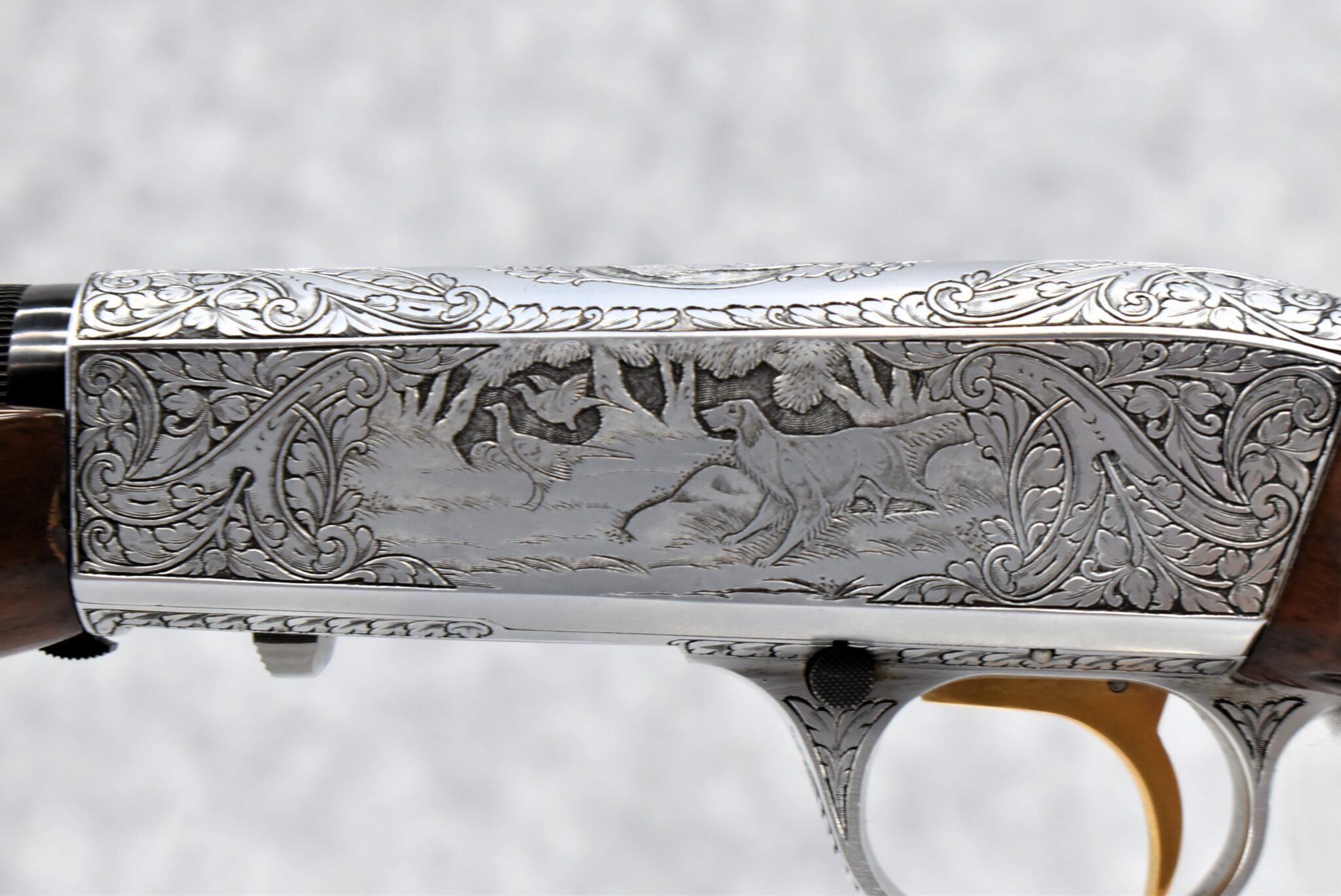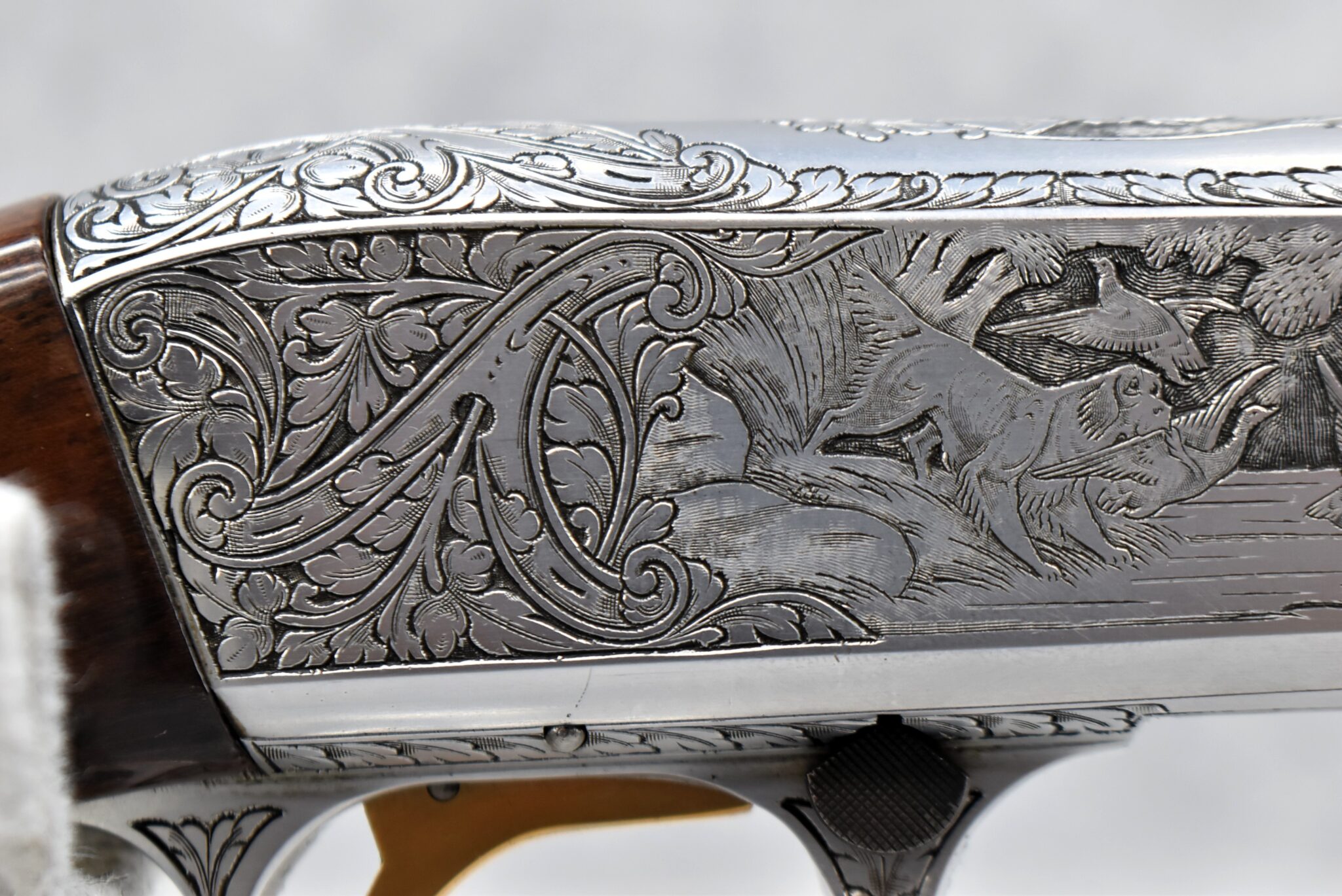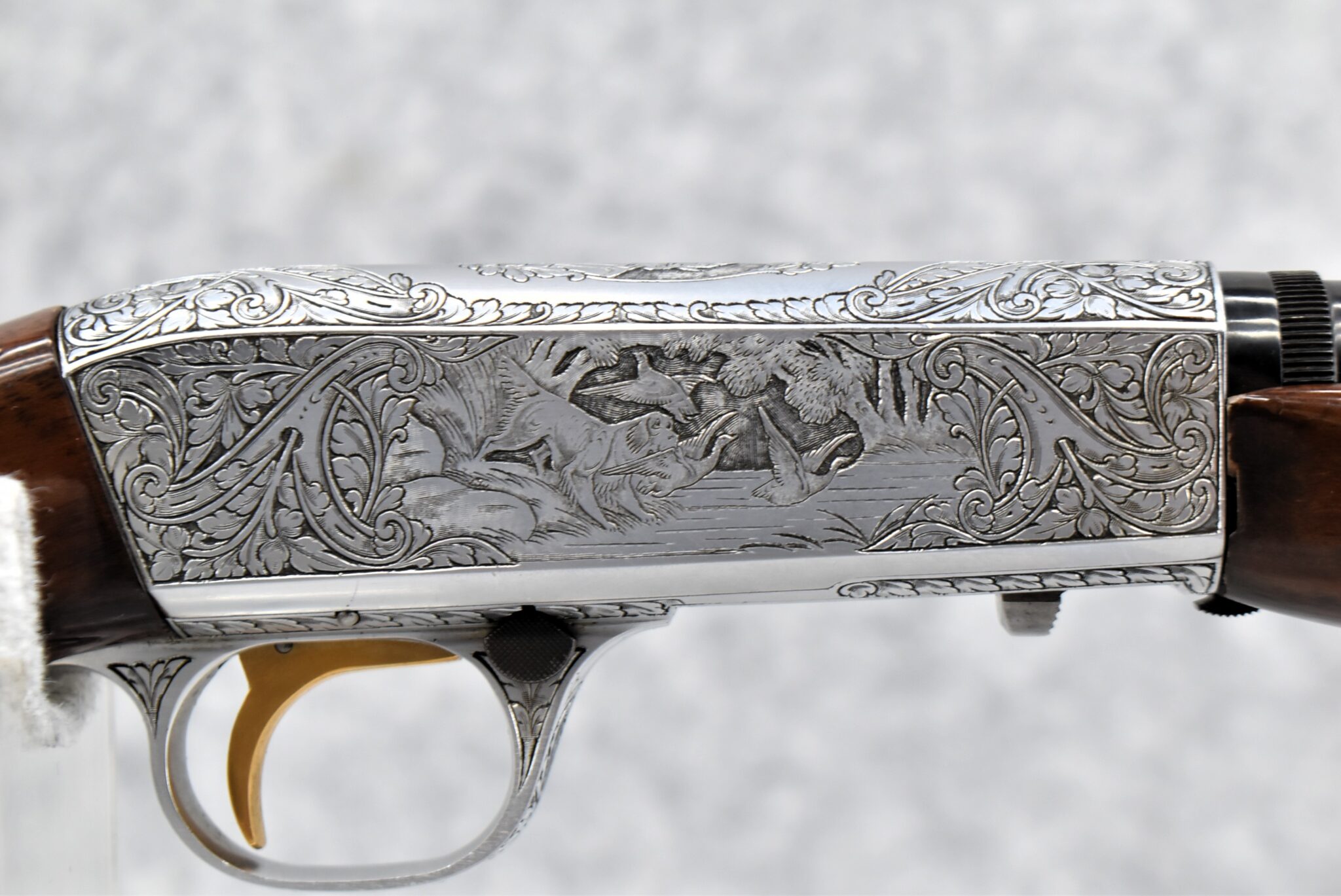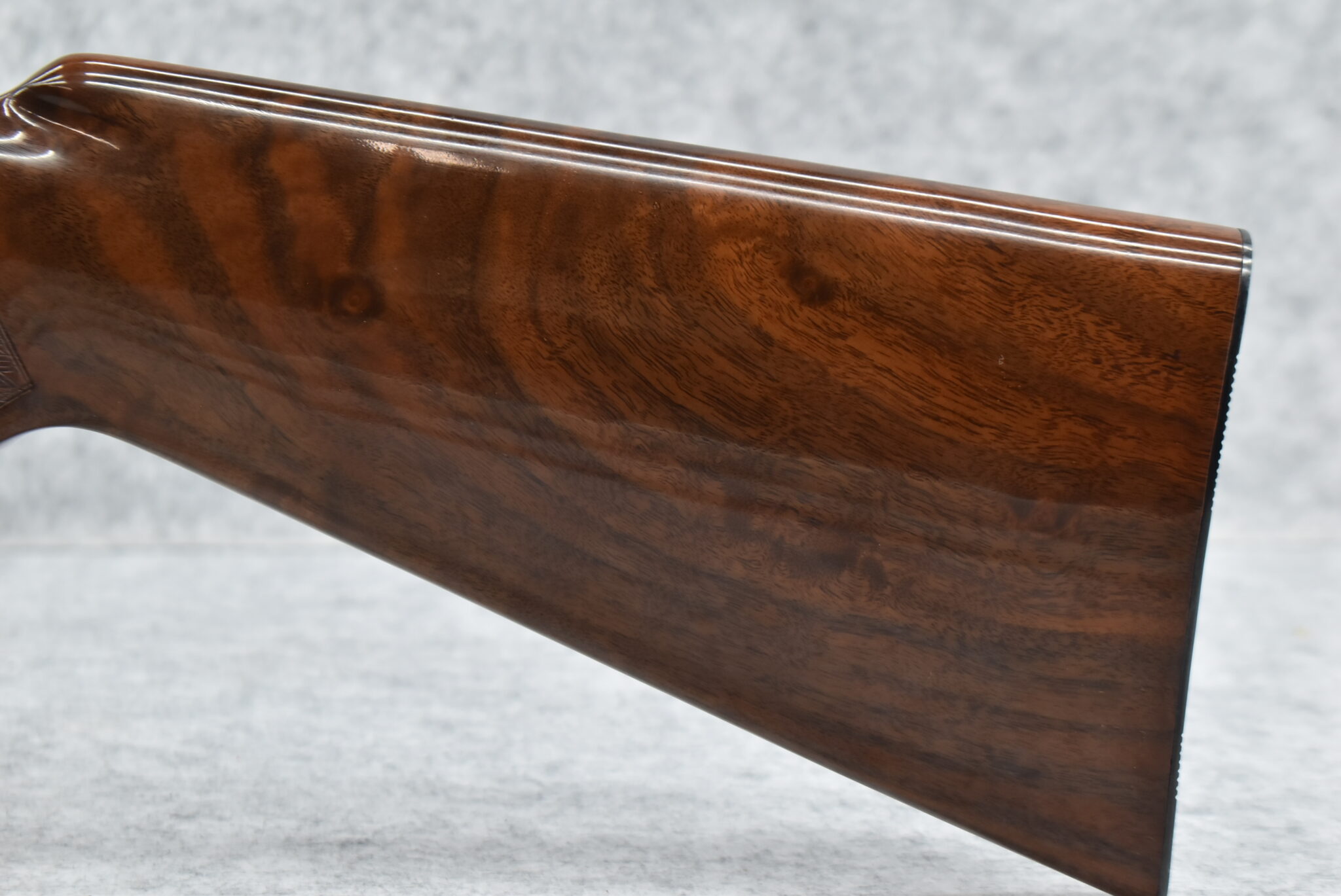 28R. Browning-Belgium – Auto Rifle (SA-22) Grade III Take Down – 22 Long Rifle Cal. Semi-Auto Rifle – w/19 ¼” Blued Finish Barrel w/Front & Scarce Wheeled Adj. Rear Barrel Sights – w/Coin Silver Finish Receiver – w/Fine Skip Line Checkered Highly Figured Pistol Grip Wood Butt Stock w/Factory Butt Plate & Matching Skip Line Checkered Highly Figured Wood Forearm – Gun is Unsigned But Factory Elaborately Engraved w/Dog & Flushing Bird Game Scenes Receiver – Accompanying This Fine Gun is an Angelo Bee Singed Letter Verifying its Authenticity of a Factory Engraved Gun & Recognizing Factory Browning Master Engraving Felix Funken’s Engraving Work – Serial #31382 – Mfg. in 1956