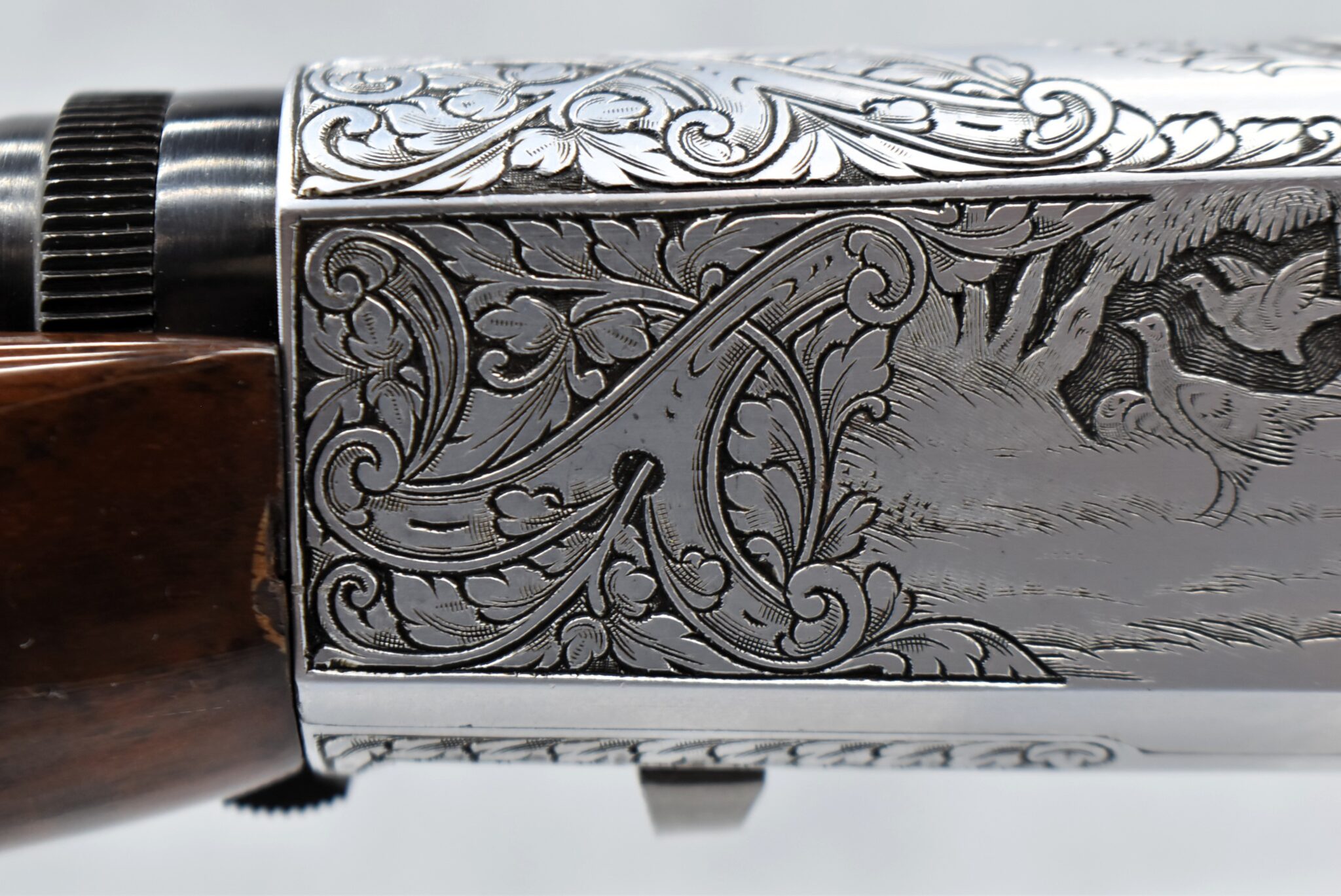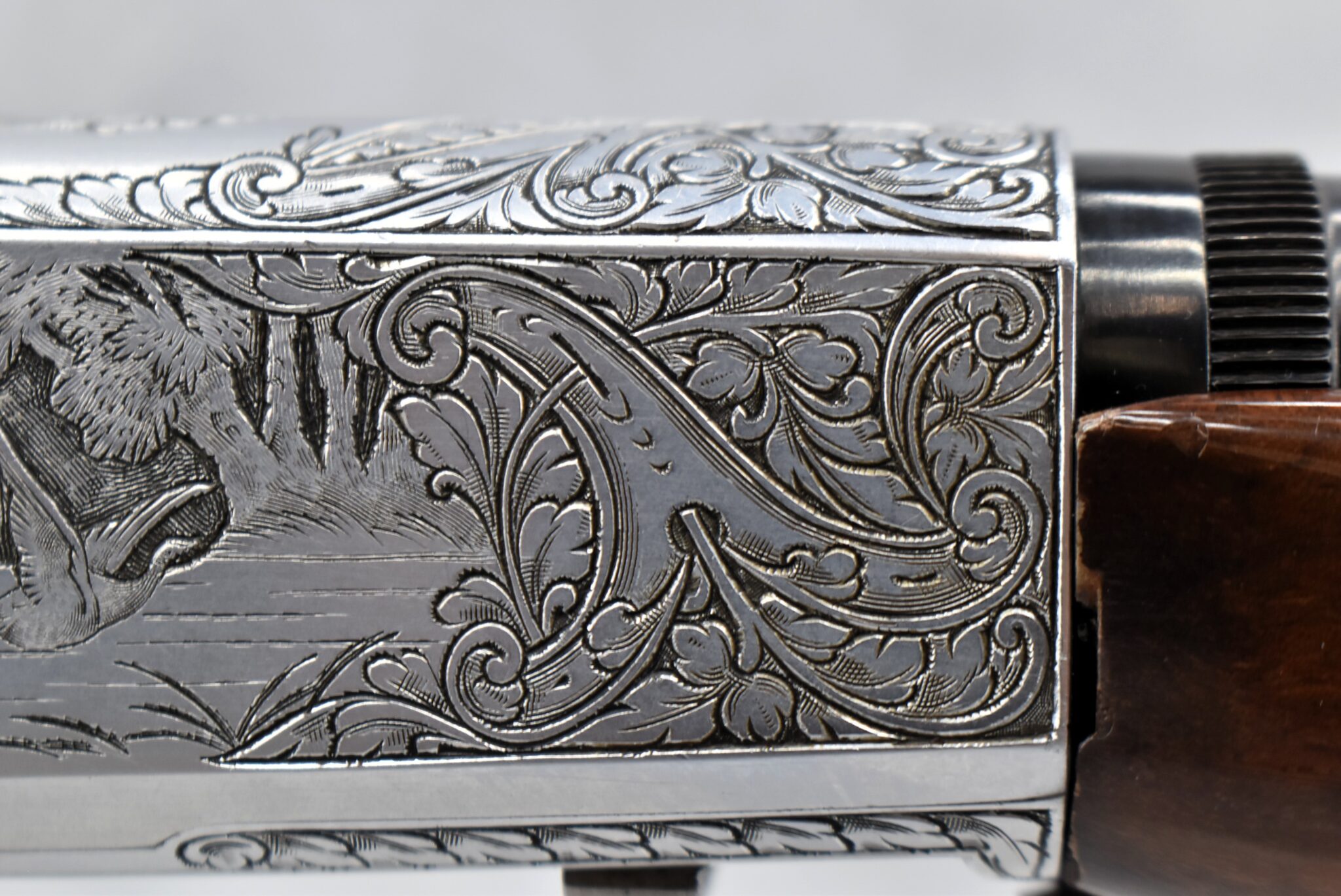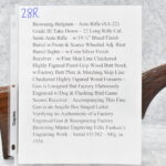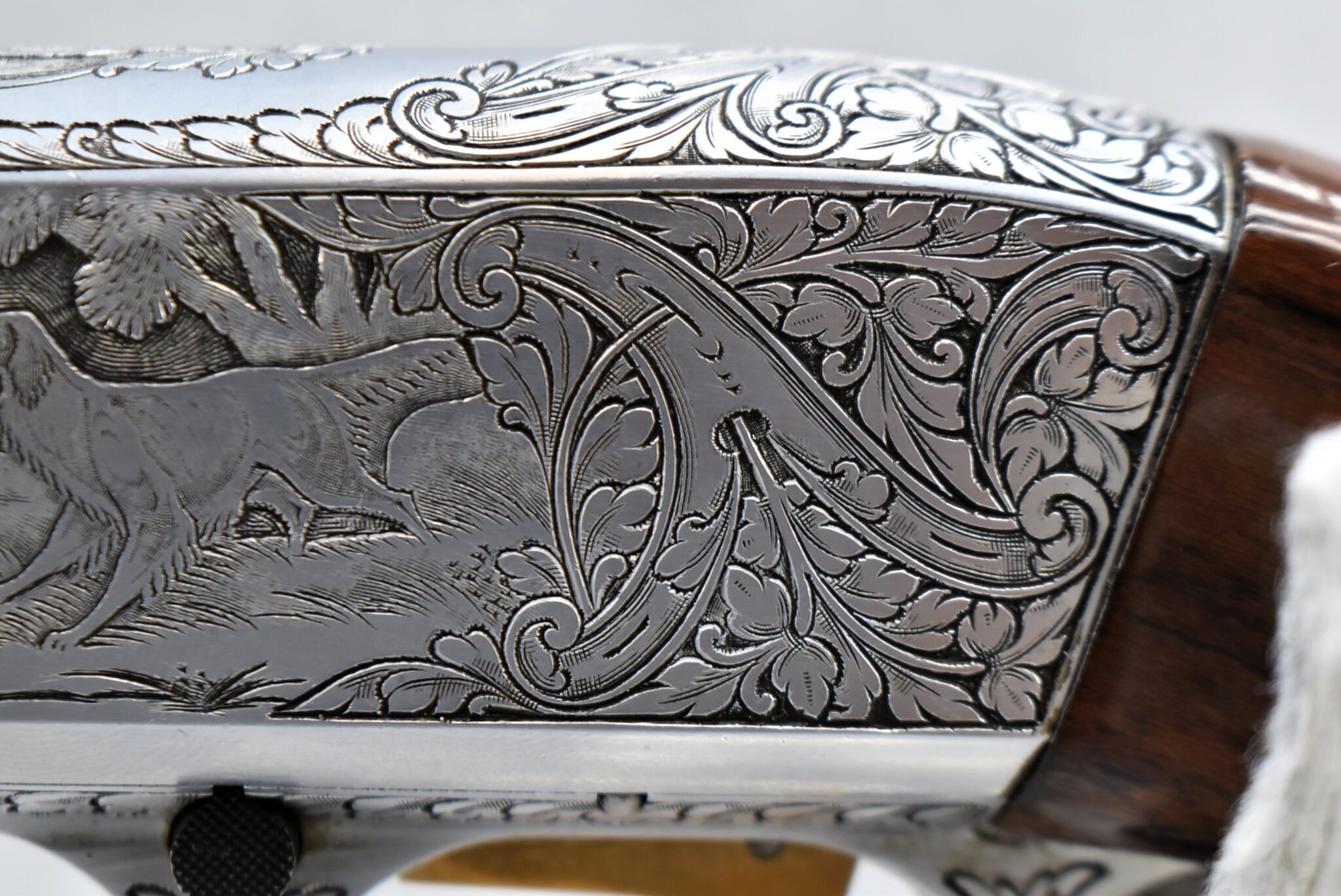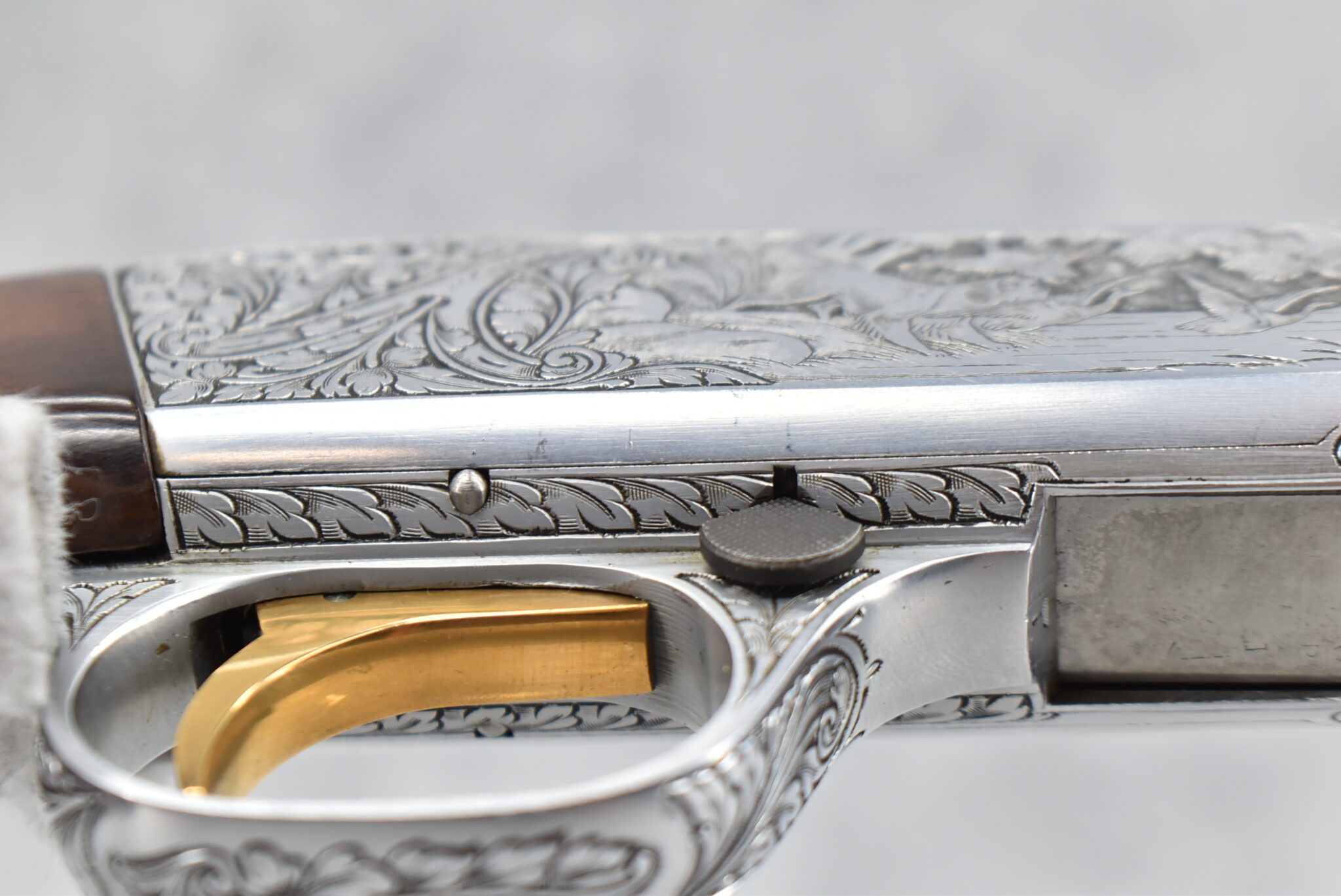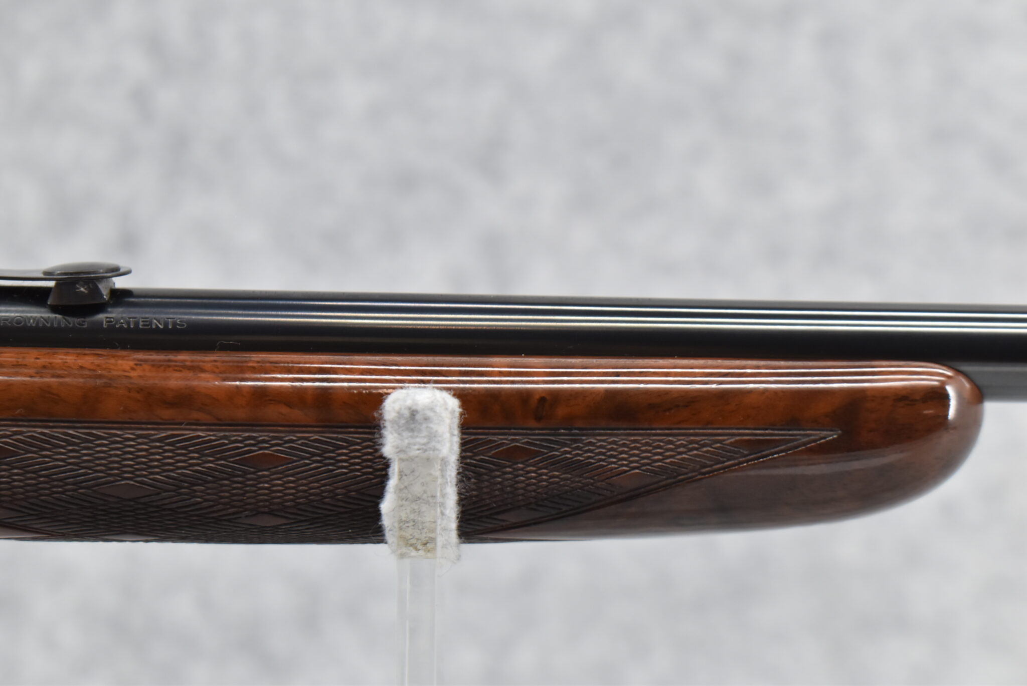 28R. Browning-Belgium – Auto Rifle (SA-22) Grade III Take Down – 22 Long Rifle Cal. Semi-Auto Rifle – w/19 ¼” Blued Finish Barrel w/Front & Scarce Wheeled Adj. Rear Barrel Sights – w/Coin Silver Finish Receiver – w/Fine Skip Line Checkered Highly Figured Pistol Grip Wood Butt Stock w/Factory Butt Plate & Matching Skip Line Checkered Highly Figured Wood Forearm – Gun is Unsigned But Factory Elaborately Engraved w/Dog & Flushing Bird Game Scenes Receiver – Accompanying This Fine Gun is an Angelo Bee Singed Letter Verifying its Authenticity of a Factory Engraved Gun & Recognizing Factory Browning Master Engraving Felix Funken’s Engraving Work – Serial #31382 – Mfg. in 1956
