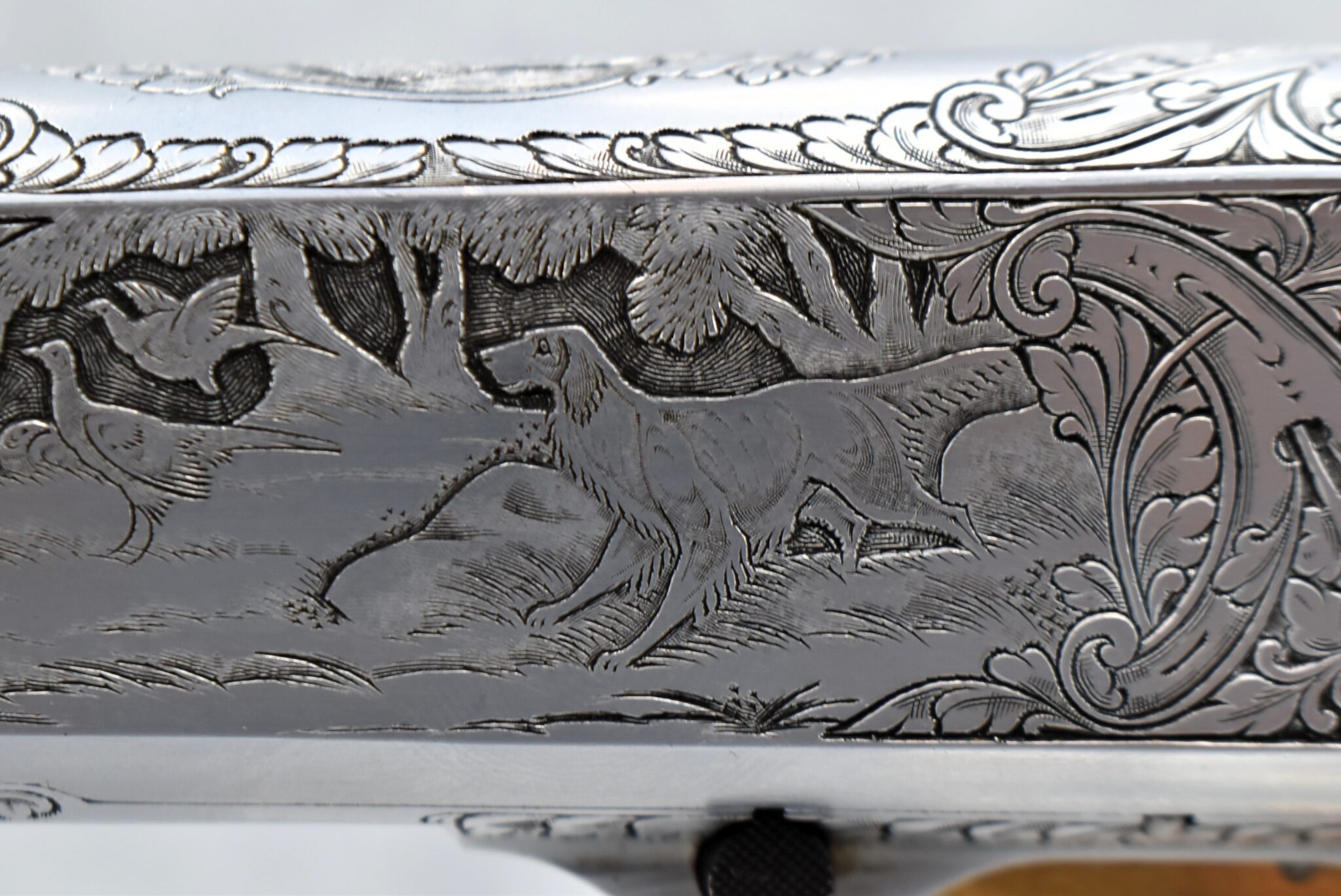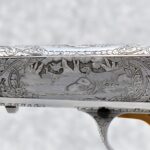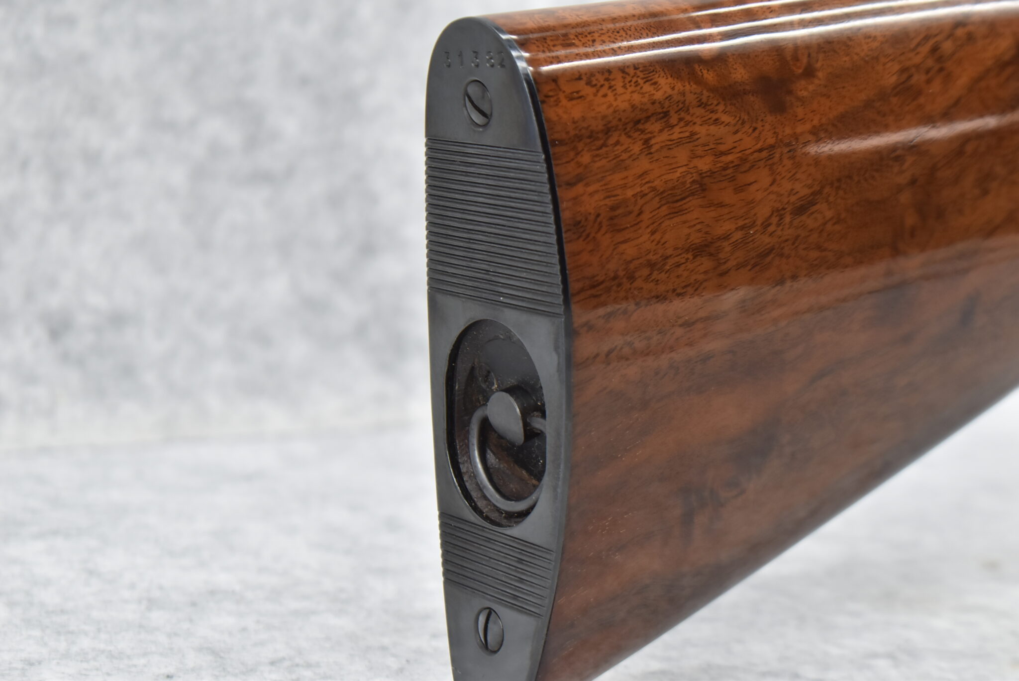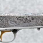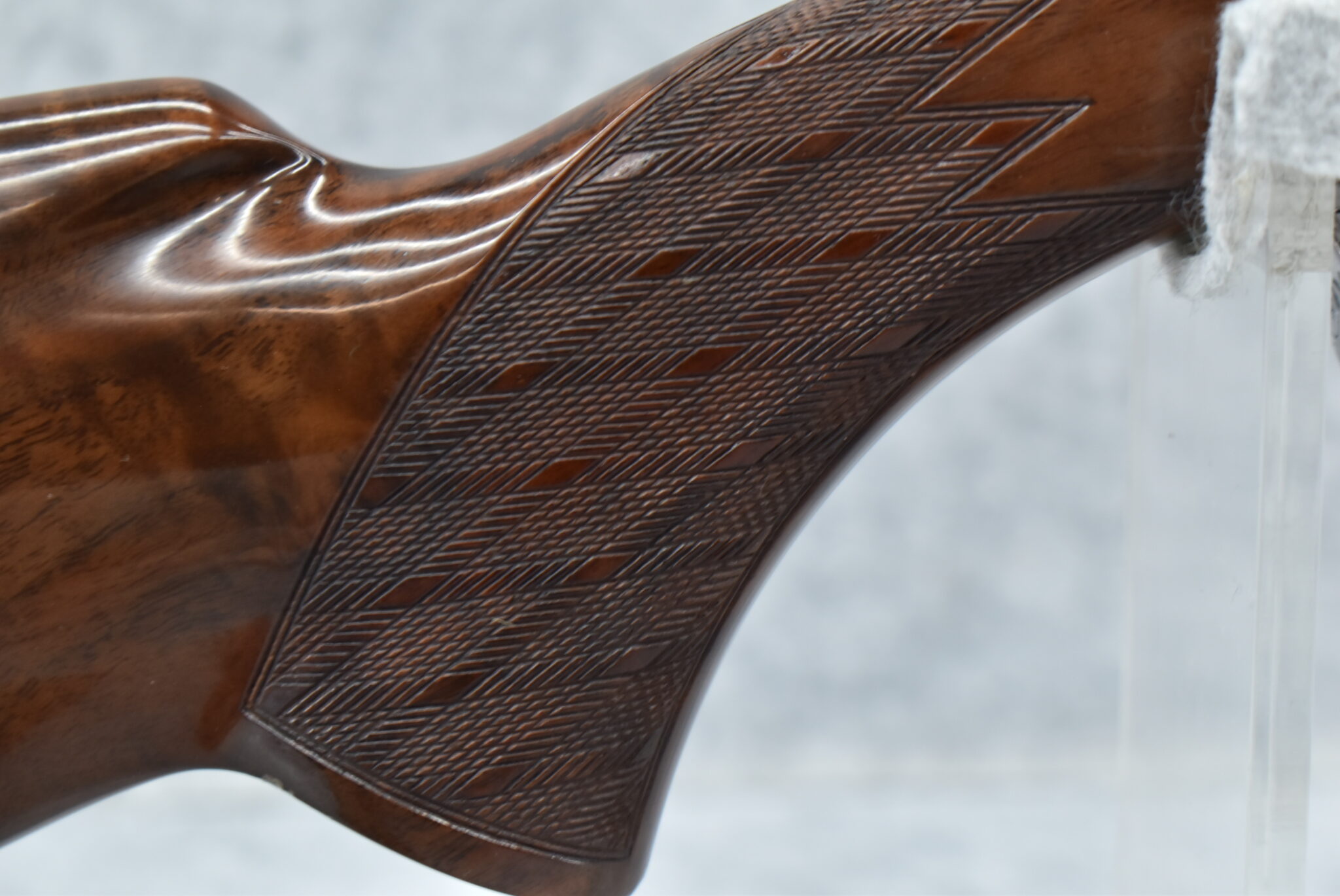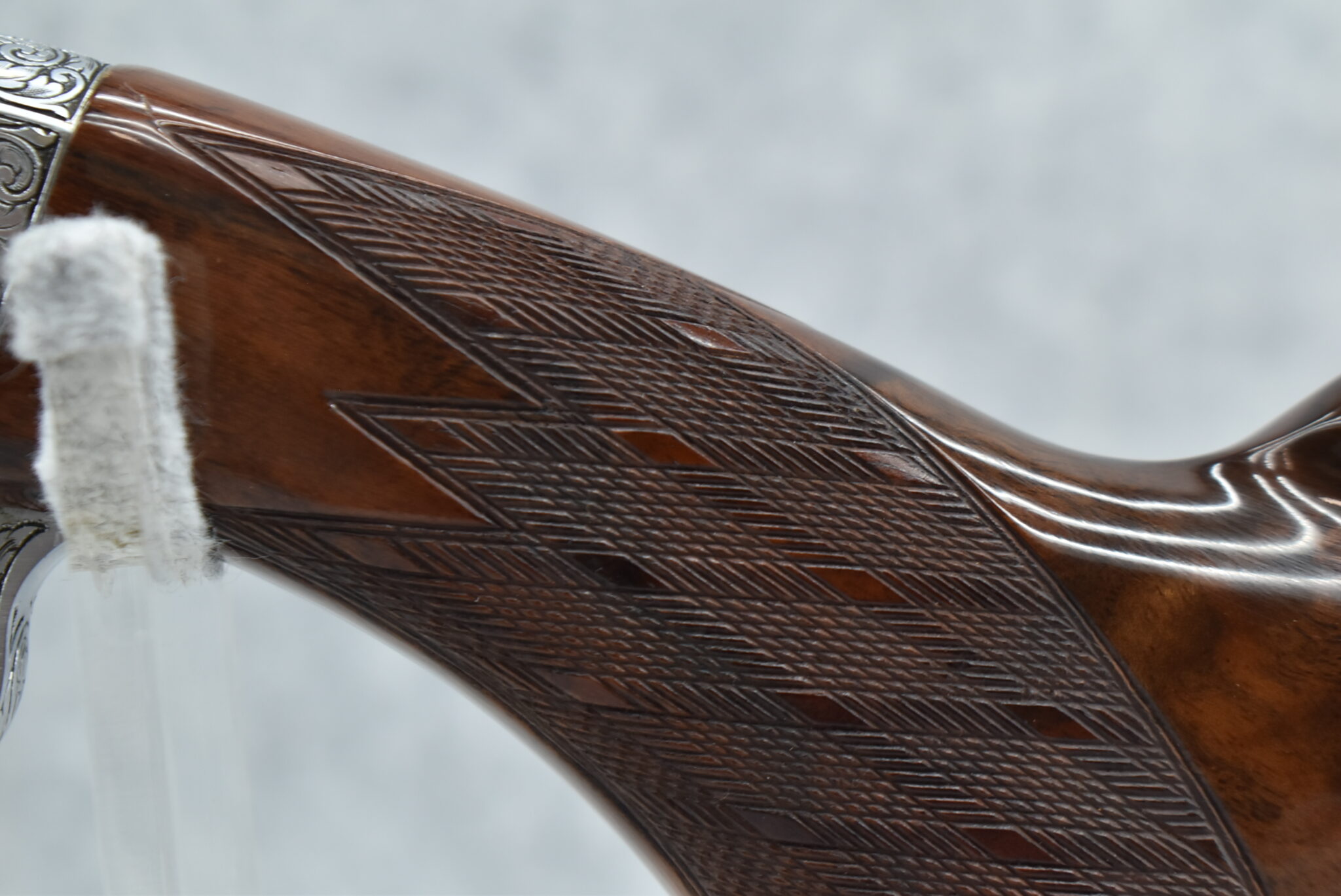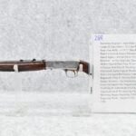28R. Browning-Belgium – Auto Rifle (SA-22) Grade III Take Down – 22 Long Rifle Cal. Semi-Auto Rifle – w/19 ¼” Blued Finish Barrel w/Front & Scarce Wheeled Adj. Rear Barrel Sights – w/Coin Silver Finish Receiver – w/Fine Skip Line Checkered Highly Figured Pistol Grip Wood Butt Stock w/Factory Butt Plate & Matching Skip Line Checkered Highly Figured Wood Forearm – Gun is Unsigned But Factory Elaborately Engraved w/Dog & Flushing Bird Game Scenes Receiver – Accompanying This Fine Gun is an Angelo Bee Singed Letter Verifying its Authenticity of a Factory Engraved Gun & Recognizing Factory Browning Master Engraving Felix Funken’s Engraving Work – Serial #31382 – Mfg. in 1956