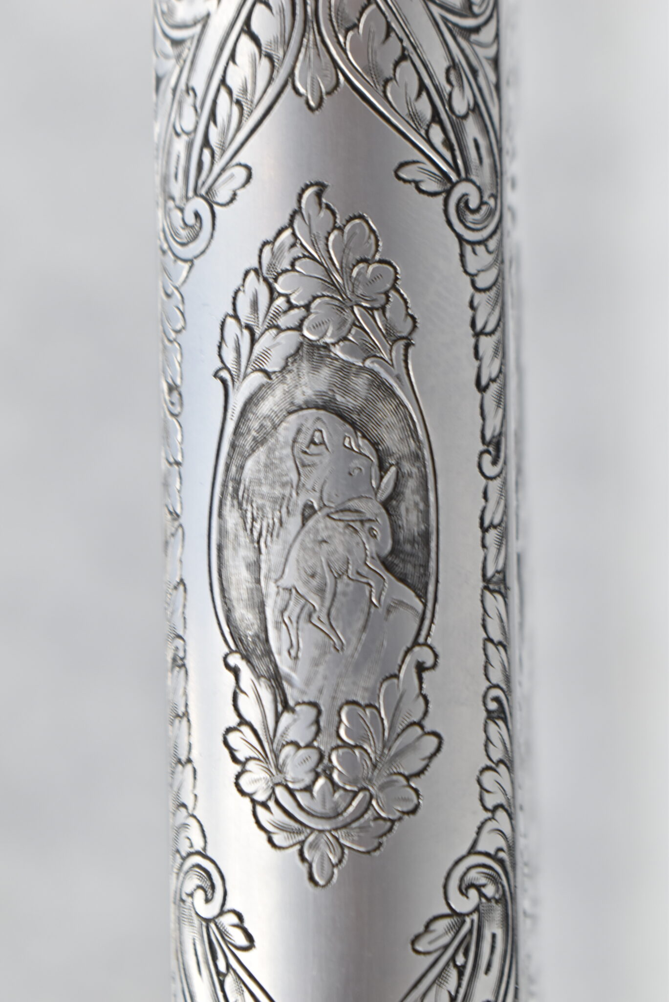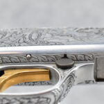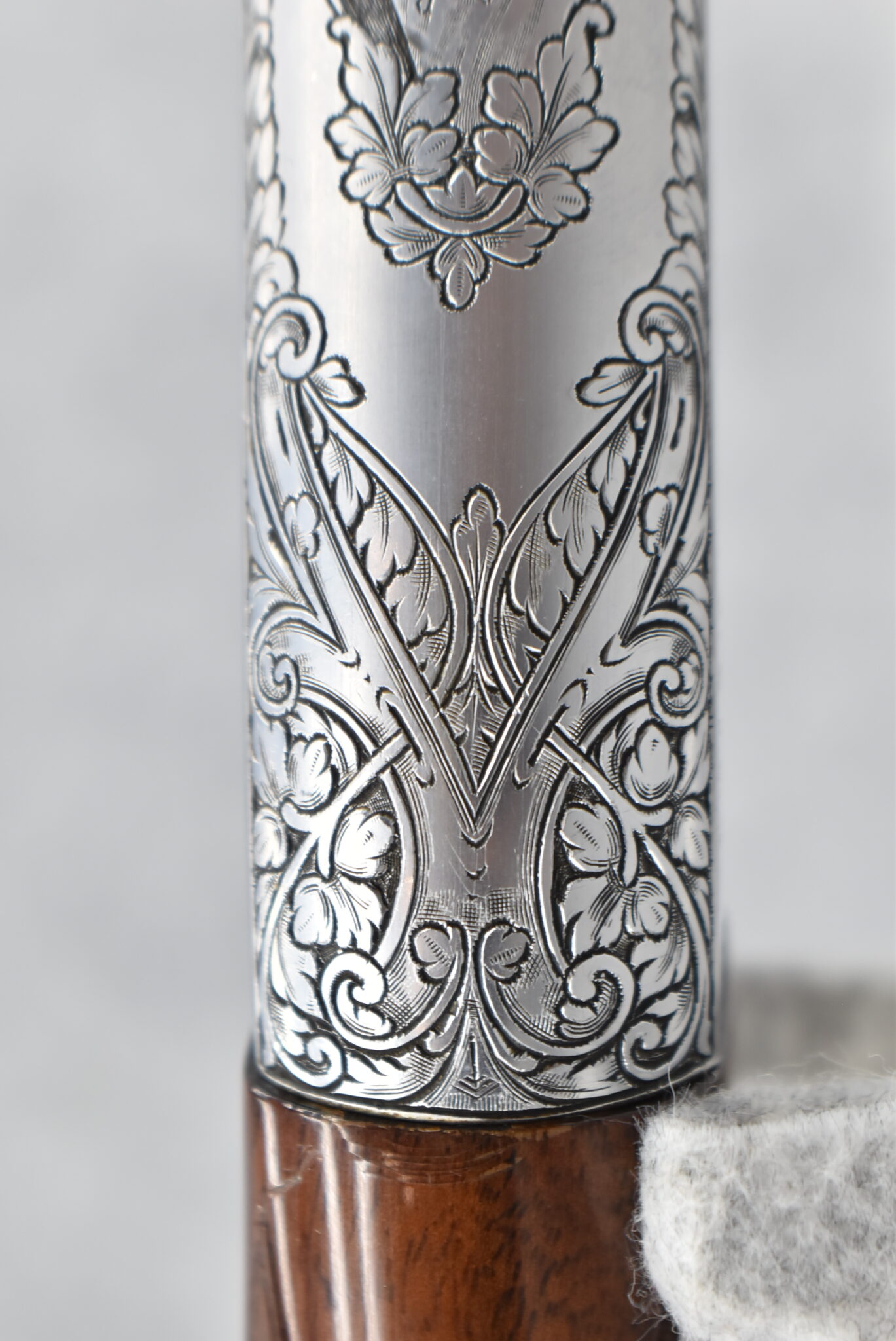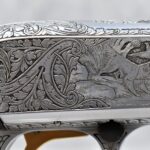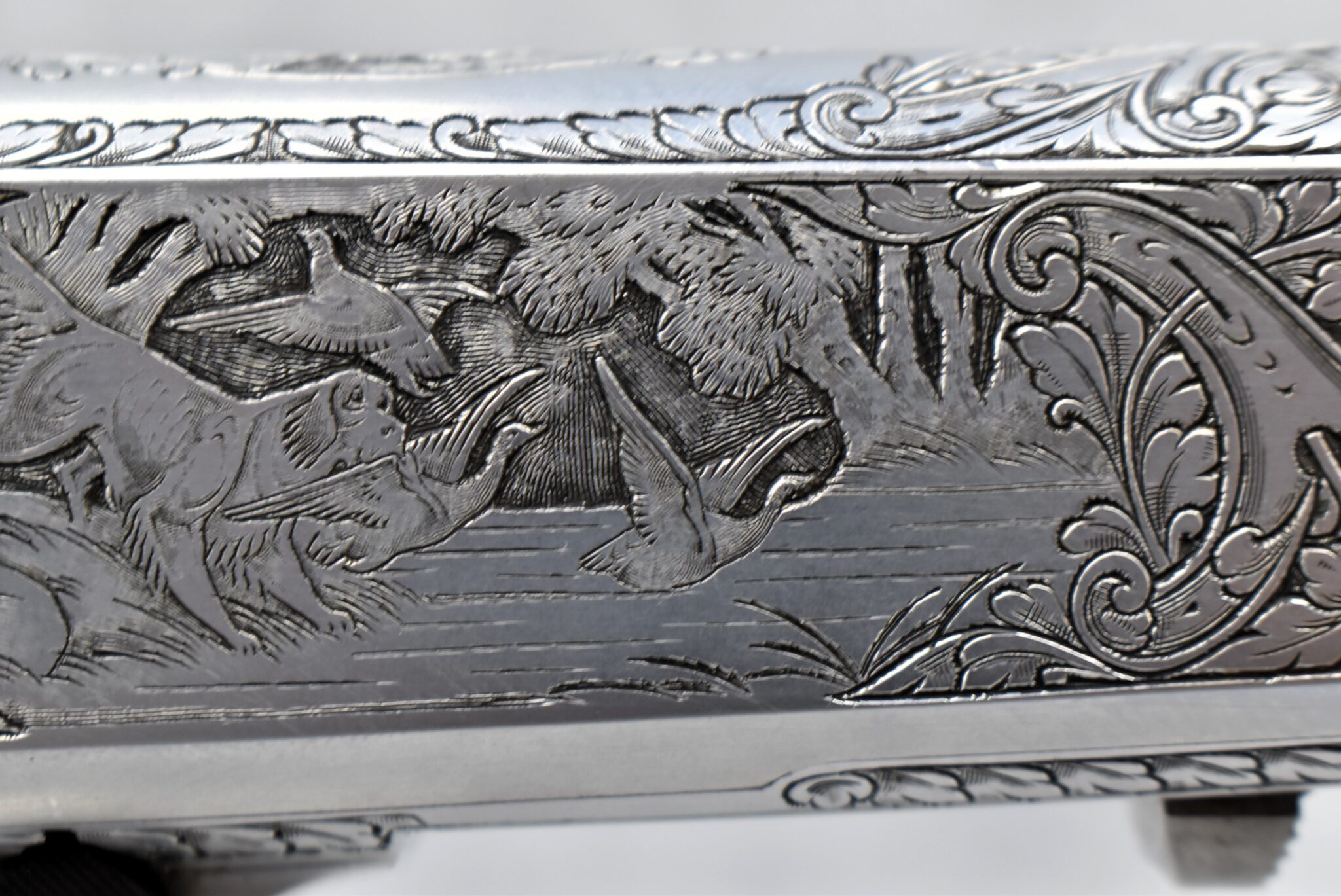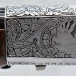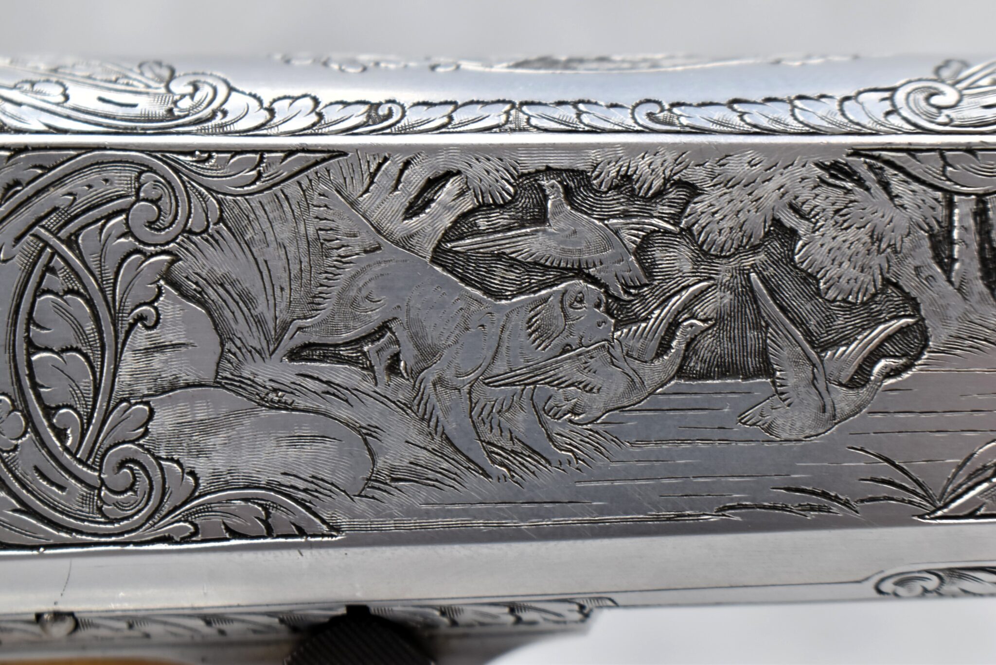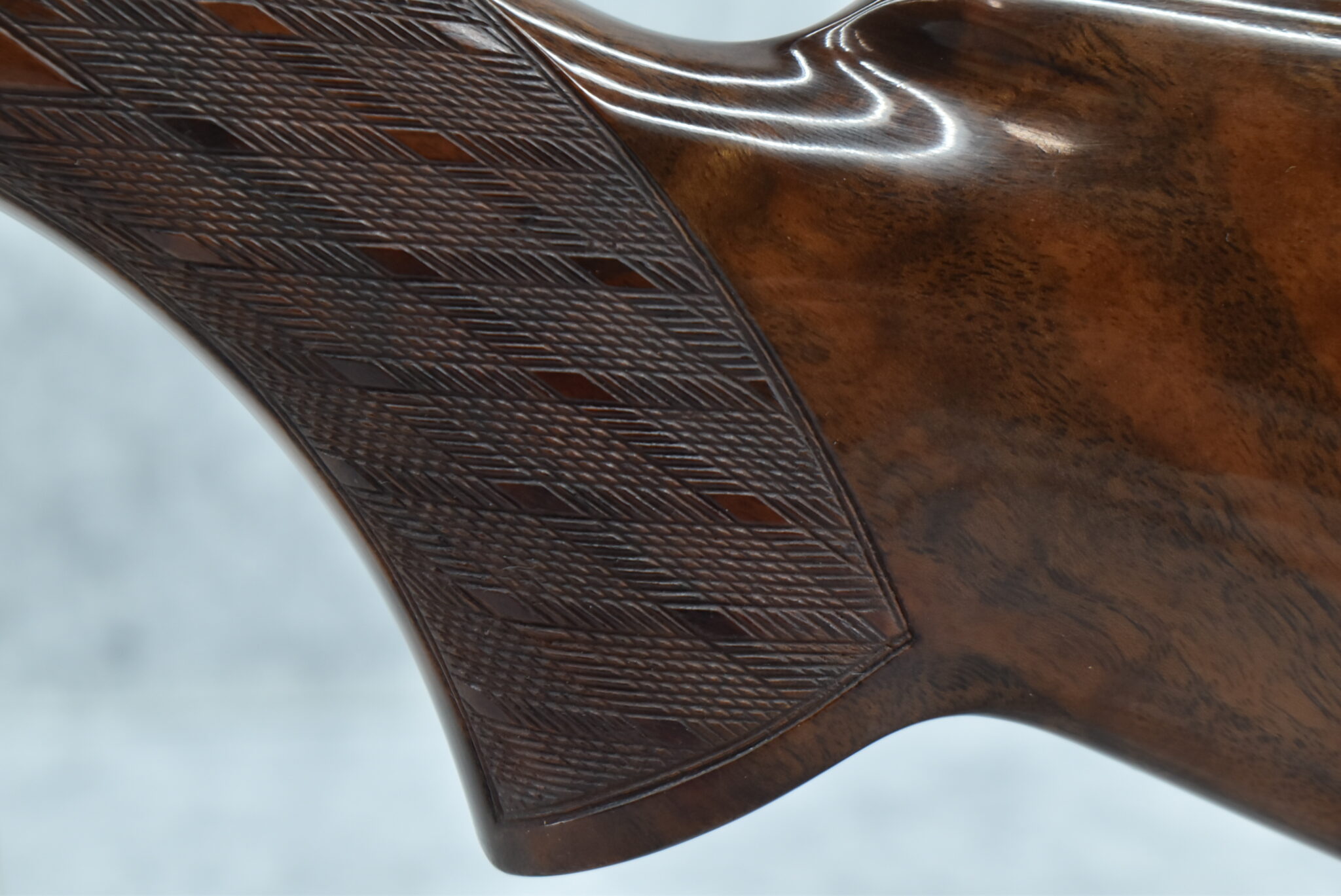 28R. Browning-Belgium – Auto Rifle (SA-22) Grade III Take Down – 22 Long Rifle Cal. Semi-Auto Rifle – w/19 ¼” Blued Finish Barrel w/Front & Scarce Wheeled Adj. Rear Barrel Sights – w/Coin Silver Finish Receiver – w/Fine Skip Line Checkered Highly Figured Pistol Grip Wood Butt Stock w/Factory Butt Plate & Matching Skip Line Checkered Highly Figured Wood Forearm – Gun is Unsigned But Factory Elaborately Engraved w/Dog & Flushing Bird Game Scenes Receiver – Accompanying This Fine Gun is an Angelo Bee Singed Letter Verifying its Authenticity of a Factory Engraved Gun & Recognizing Factory Browning Master Engraving Felix Funken’s Engraving Work – Serial #31382 – Mfg. in 1956
