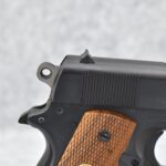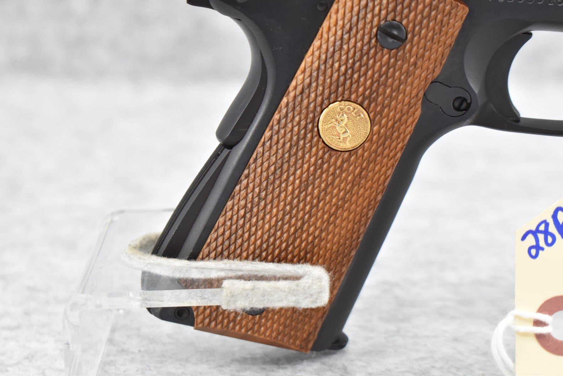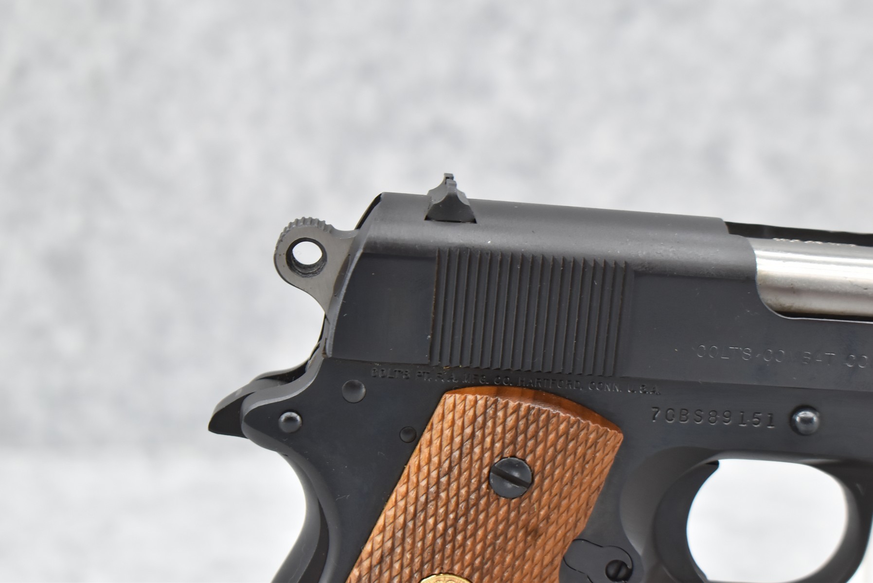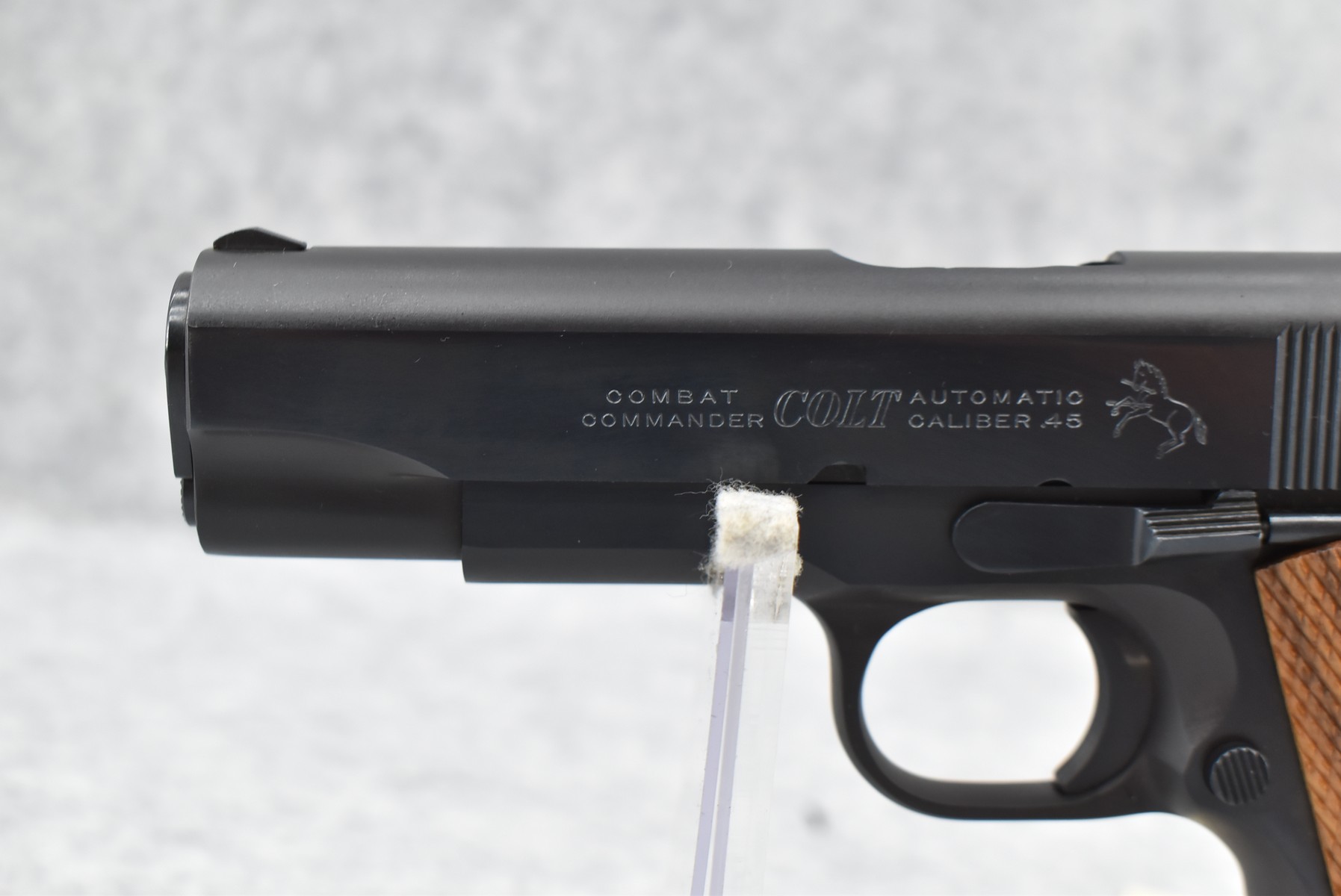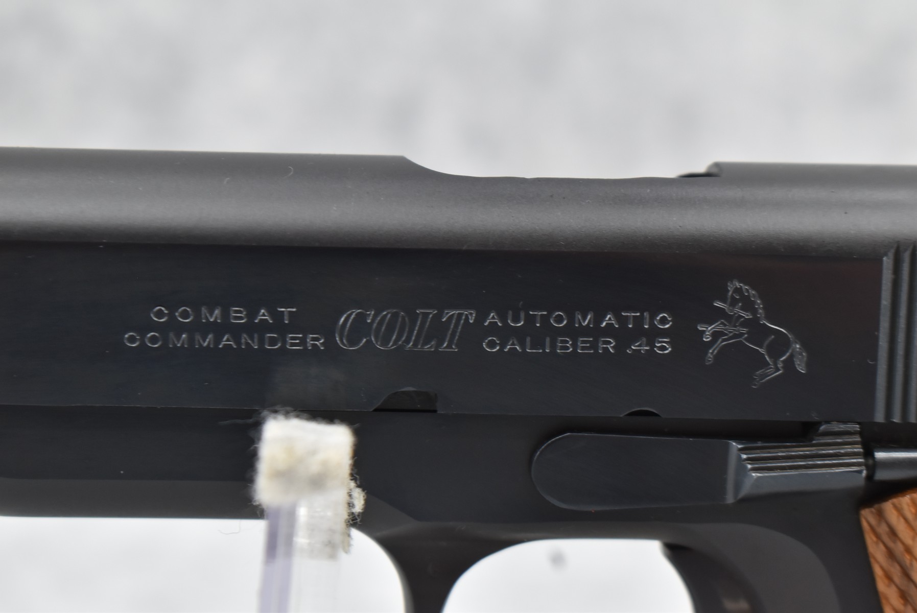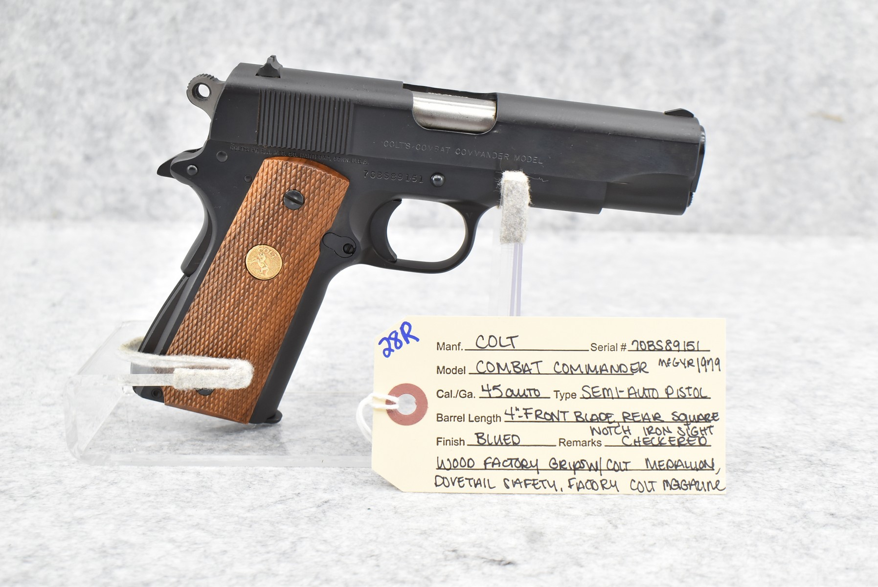 28R.       Colt – Mod. Combat Commander – 45 Auto Cal. Semi-Auto Pistol – w/4” Barrel w/Front Blade & Rear Square Notch Iron Sights – Blued Finish – w/Checkered Wood Factory Grips w/Colt Medallion – w/Factory Colt Magazine – Mfg. 1979