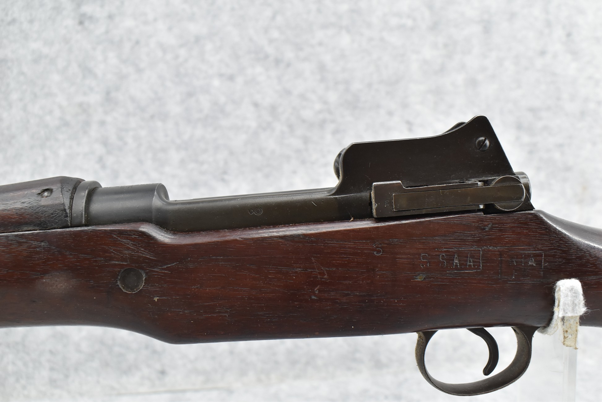 28R. Remington – Mod. 1917 – 30-06 Cal. Bolt Action Military Rifle – w/26” JA Marked Barrel w/Blade Front & Adj. Rear Ladder Sights – Parkerized Finish – w/Pistol Grip Full Wood Military Stock w/Metal Butt Plate w/Trap Door – w/2 Stock Cartouches on Left Side of Stock