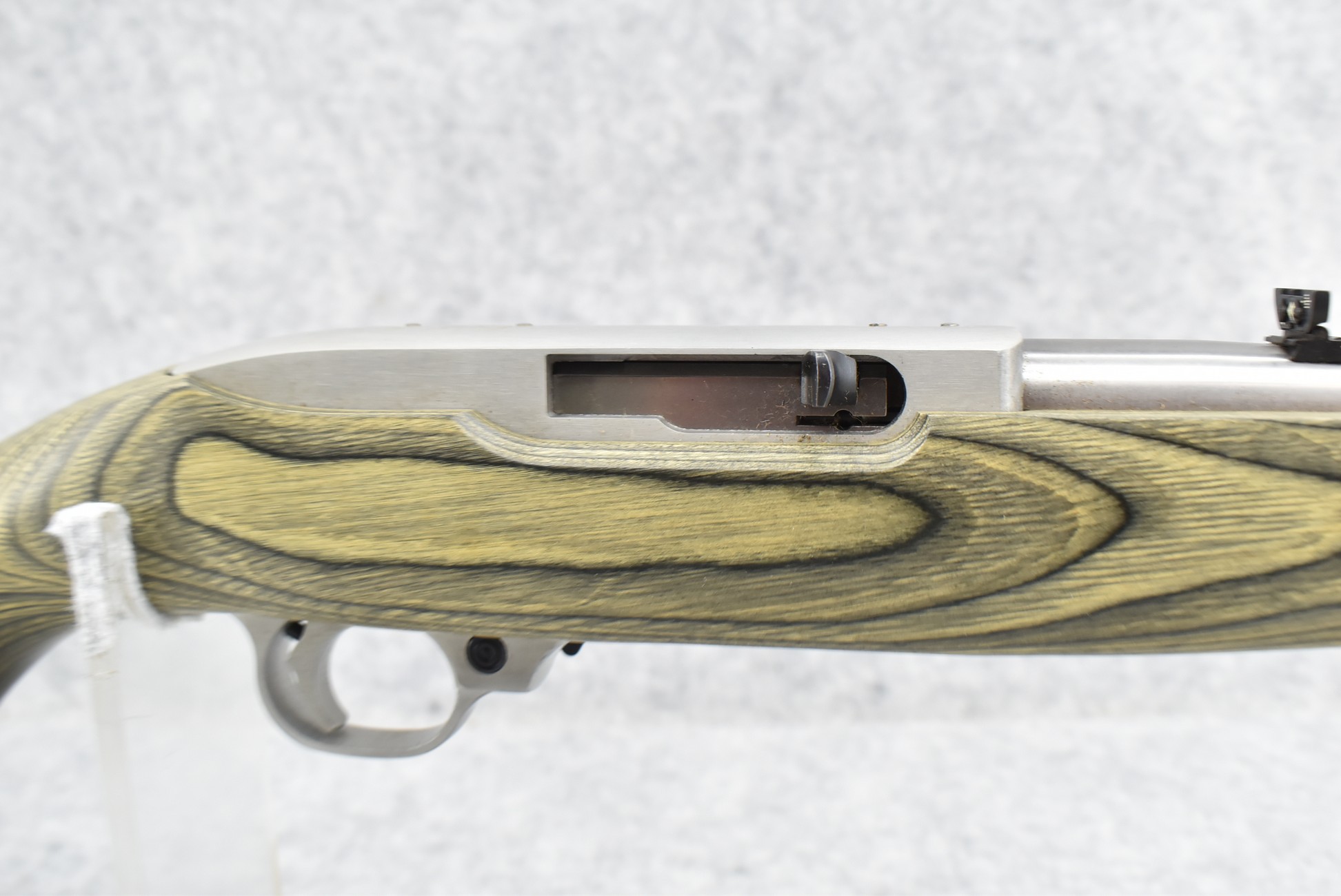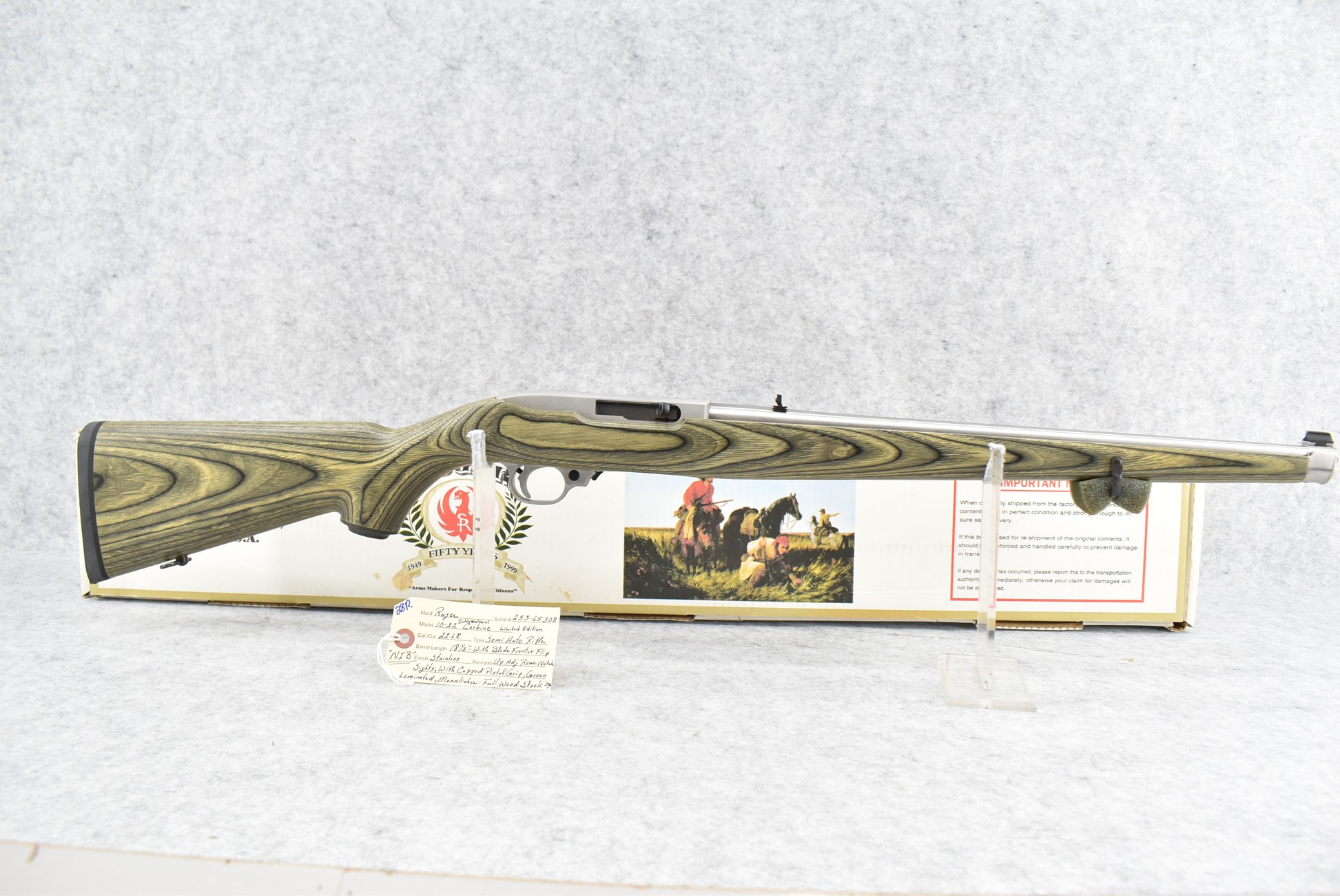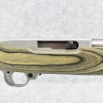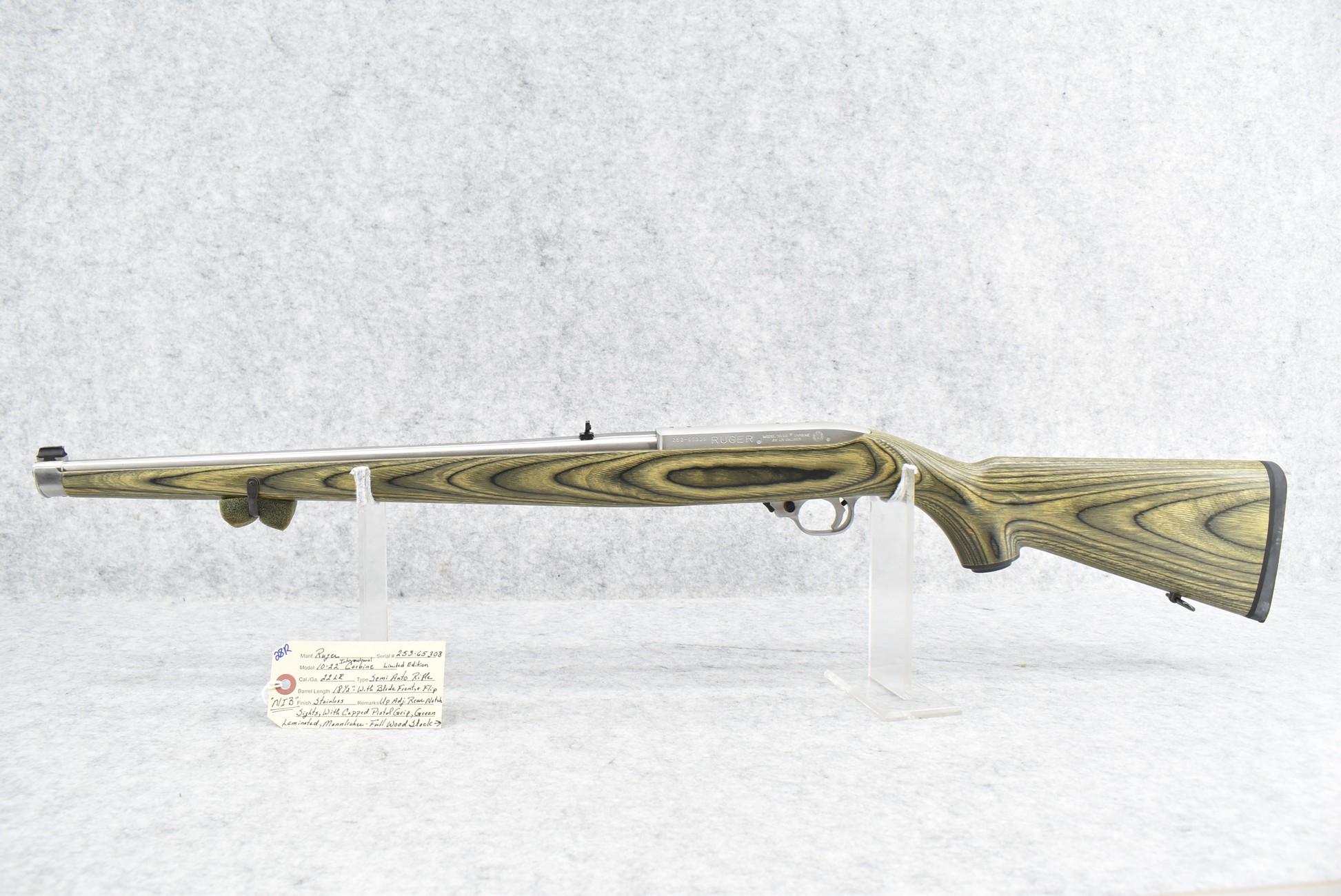28R. Ruger – Mod. 10/22 International Carbine Limited Edition – 22LR Cal. Semi-Auto Rifle – w/18½” Barrel w/Blade Front and Flip-Up Adjustable Rear Notch Sights – Stainless Finish – w/Capped Pistol Grip Green Laminated Mannlicher Full Wood Stock w/Factory Black Rubber Butt Pad – New in Factory Box w/1 Factory Detachable Magazine, Manual, and Accessories