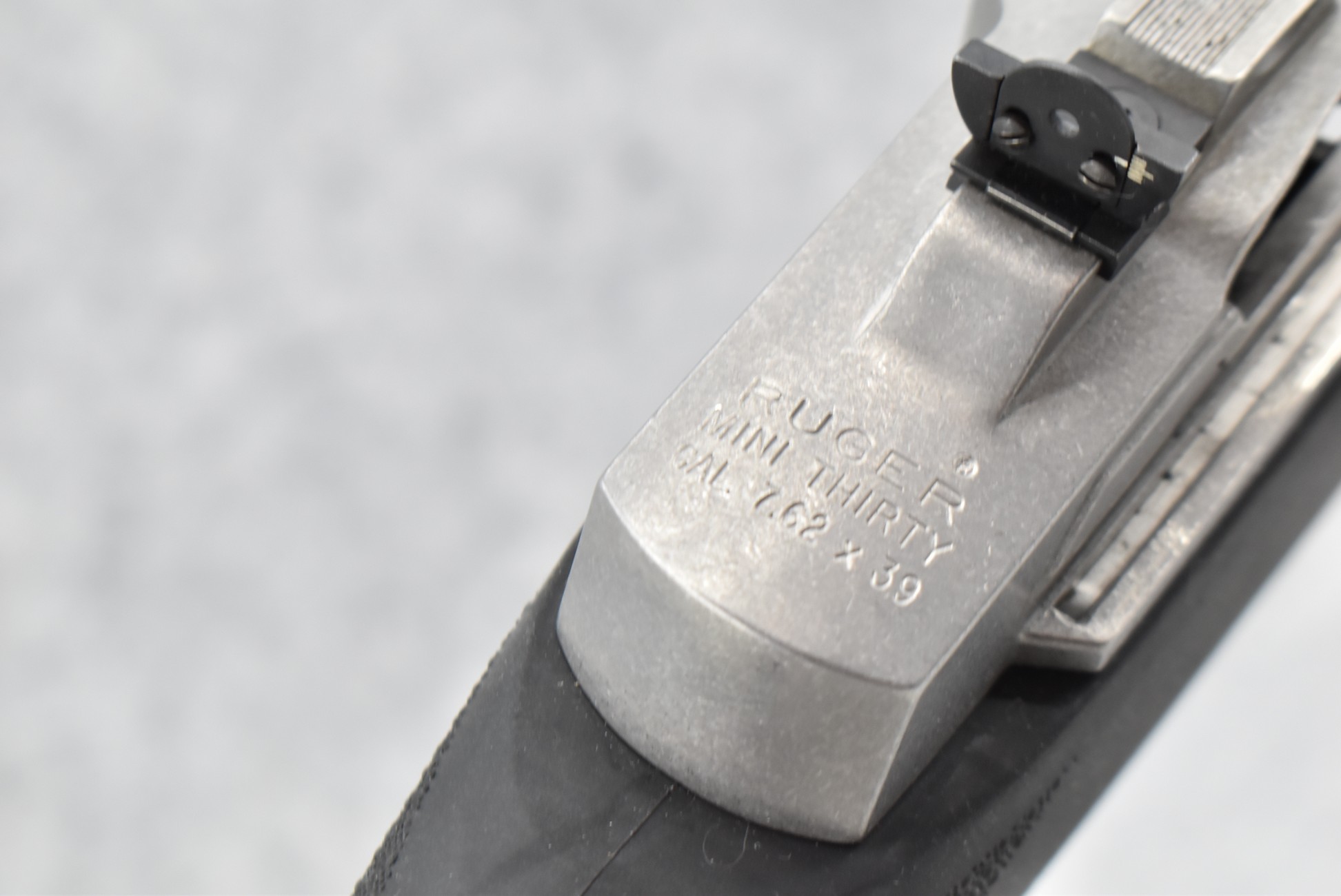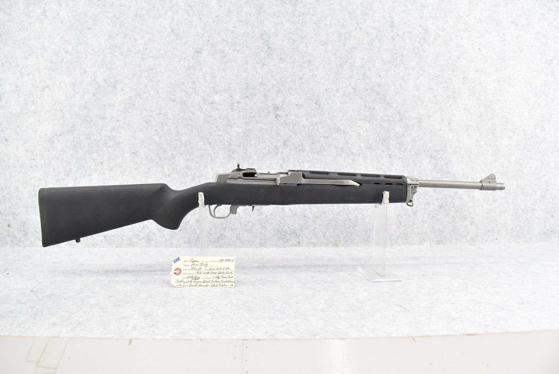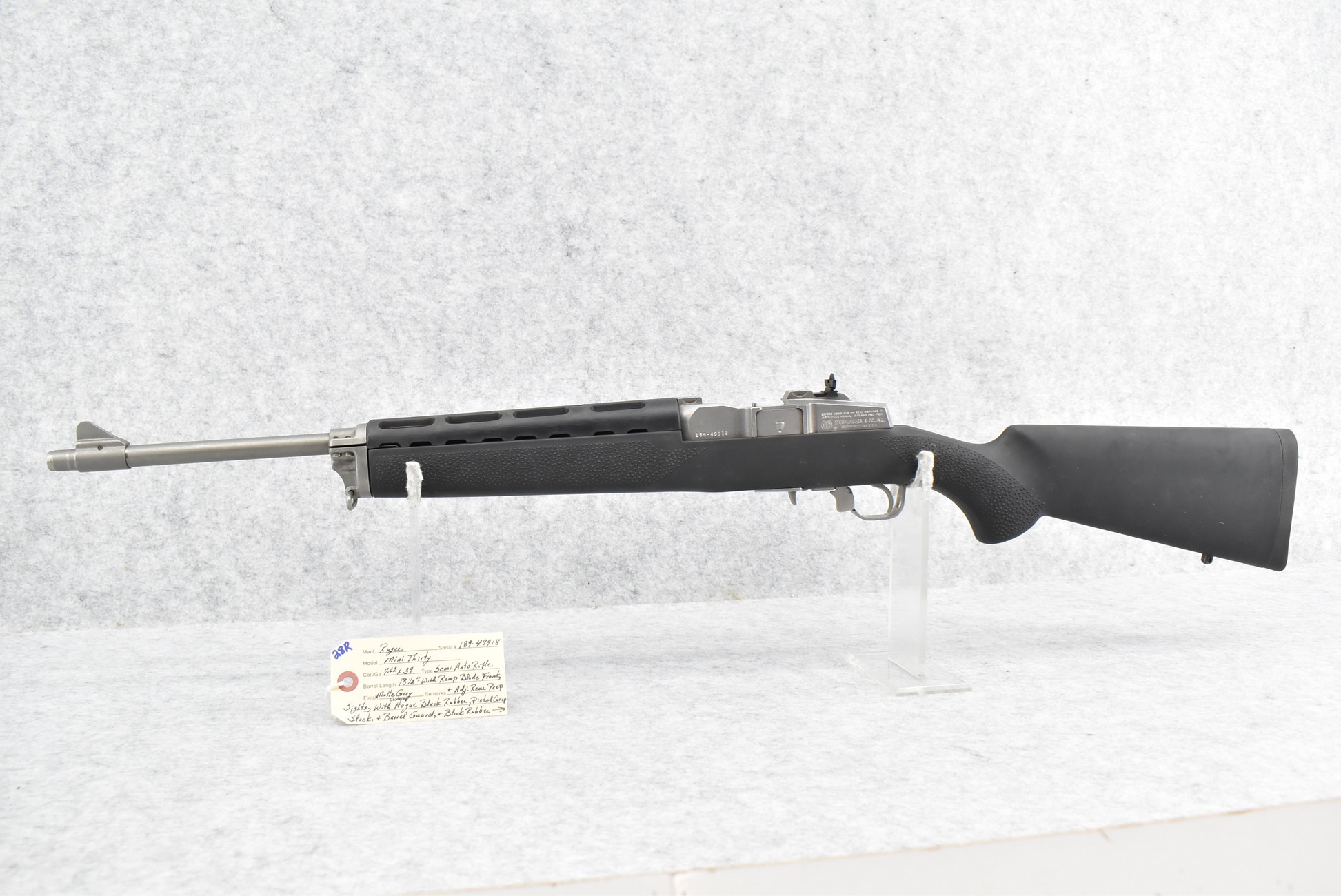 28R. Ruger – Mod. Mini Thirty – 7.62×39 Cal. Semi-Auto Rifle – w/18 ½” Barrel w/Ramp Blade Front & Adj. Rear Peep Sights – Matte Stainless Finish – w/Custom Hogue Black Rubber Pistol Grip Stocks w/Factory Butt Pad