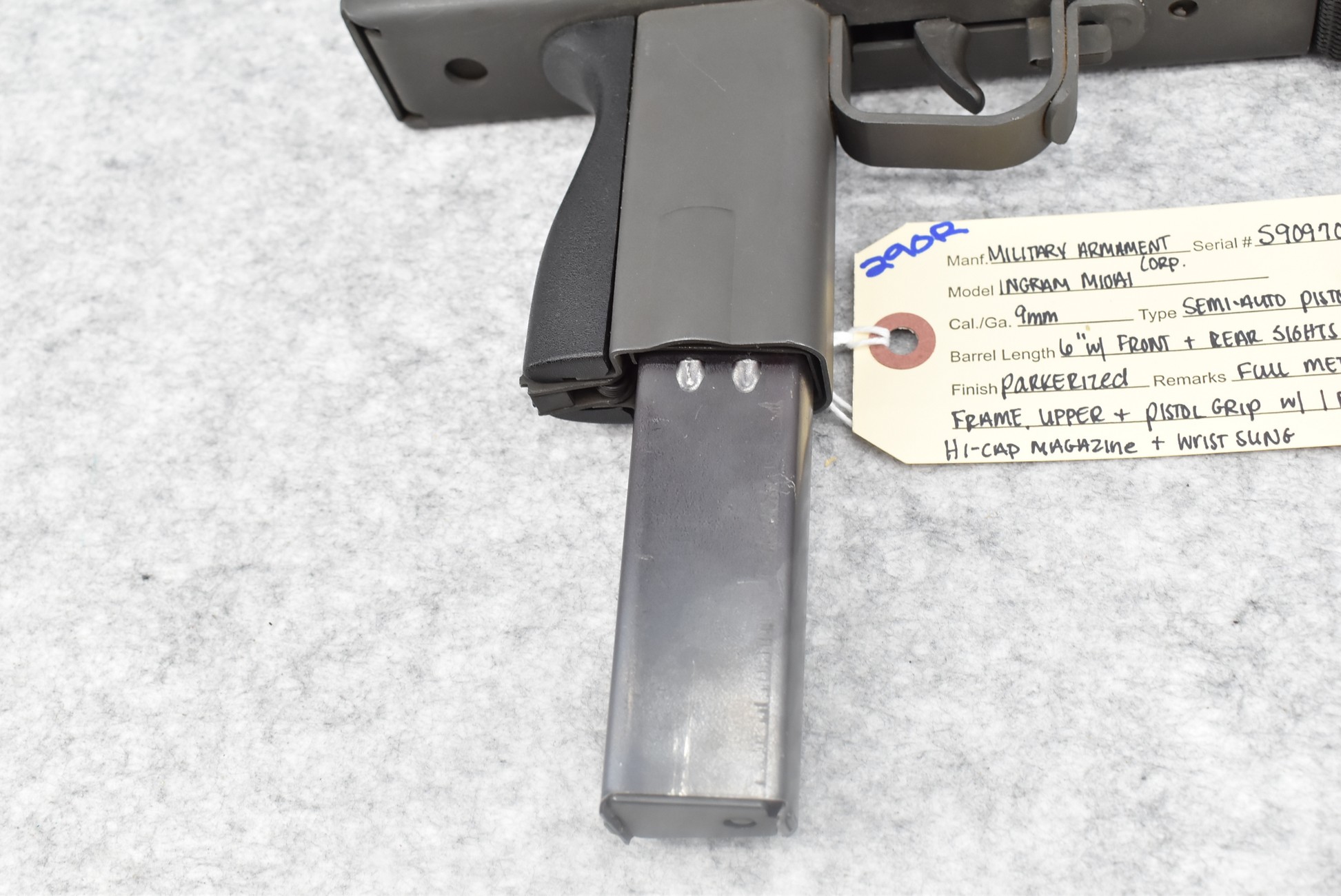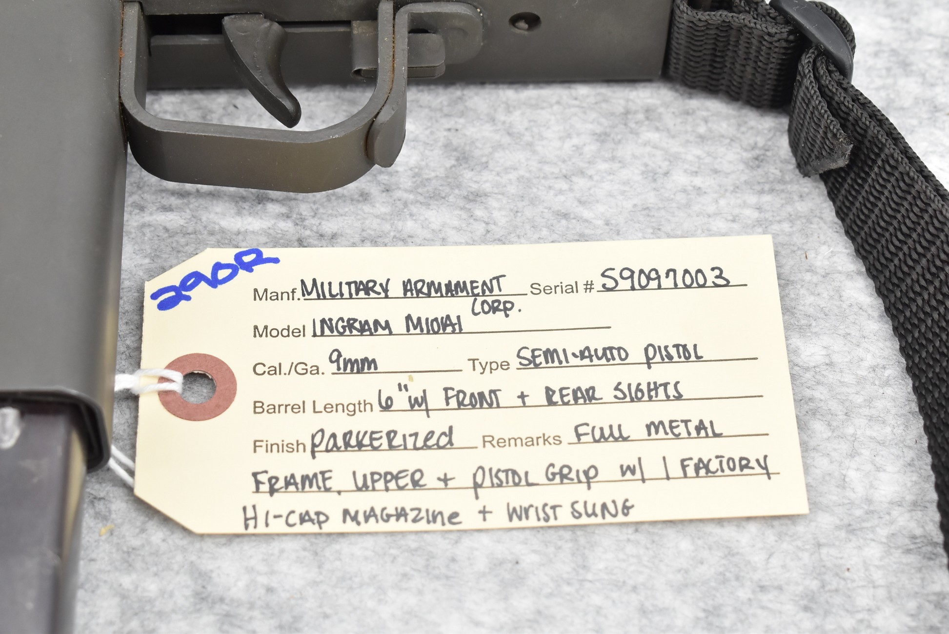290R. Military Armament Corp. – Mod. Ingram M10A1 – 9mm Cal. Semi-Auto Pistol – w/6” Barrel w/Front & Rear Sights – Parkerized Finish – w/Full Metal Frame, Upper & Pistol Grip – w/Factory Hi-Cap Magazine – w/Wrist Sling (CANNOT GO TO MARYLAND!)