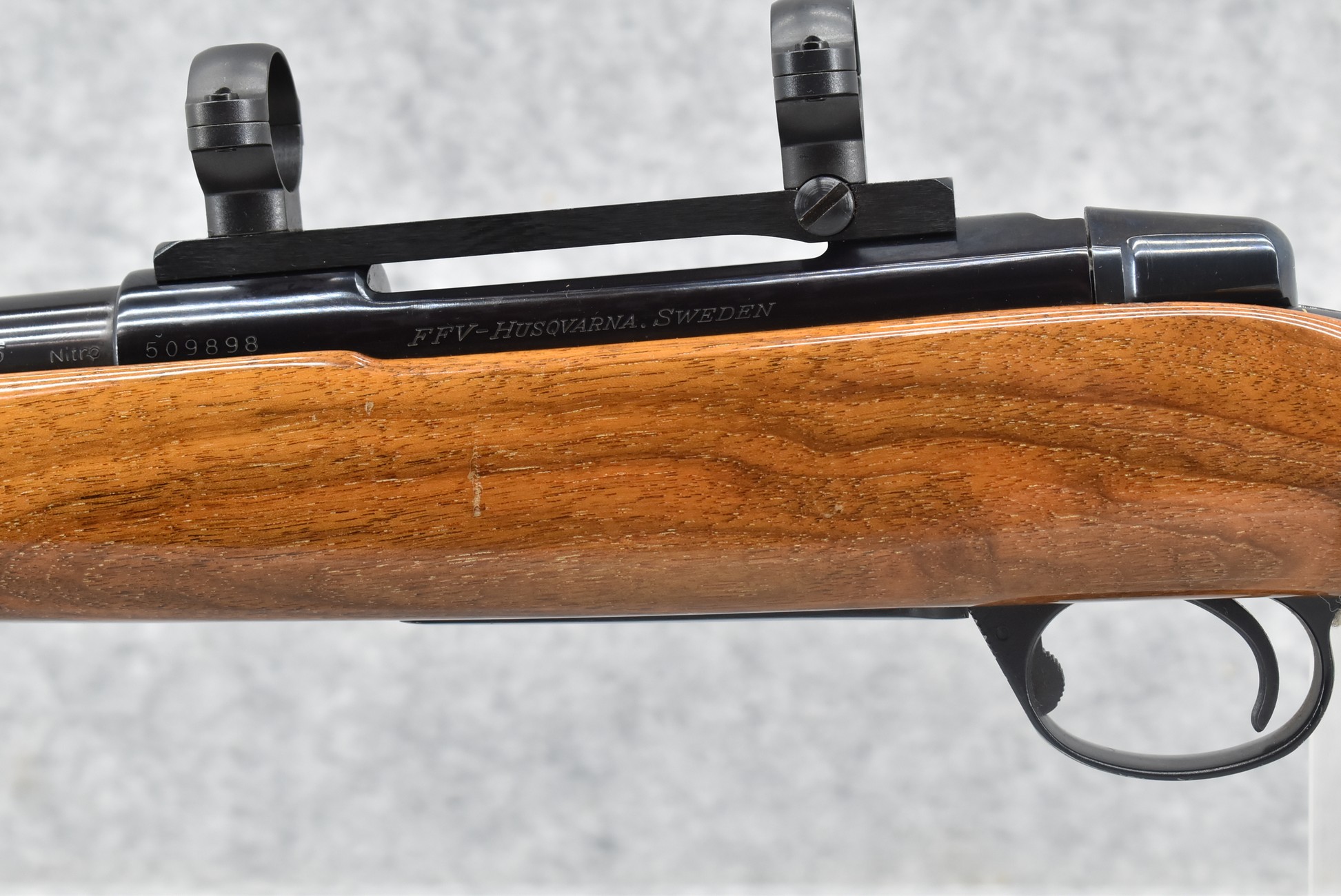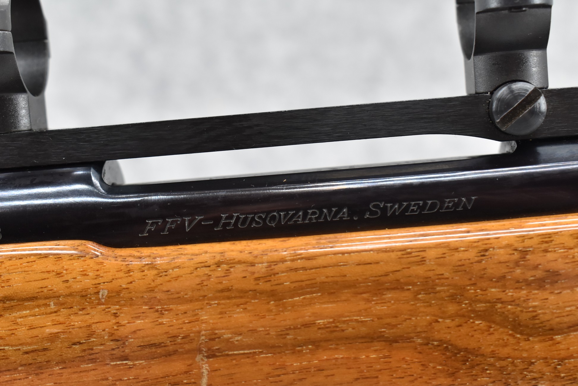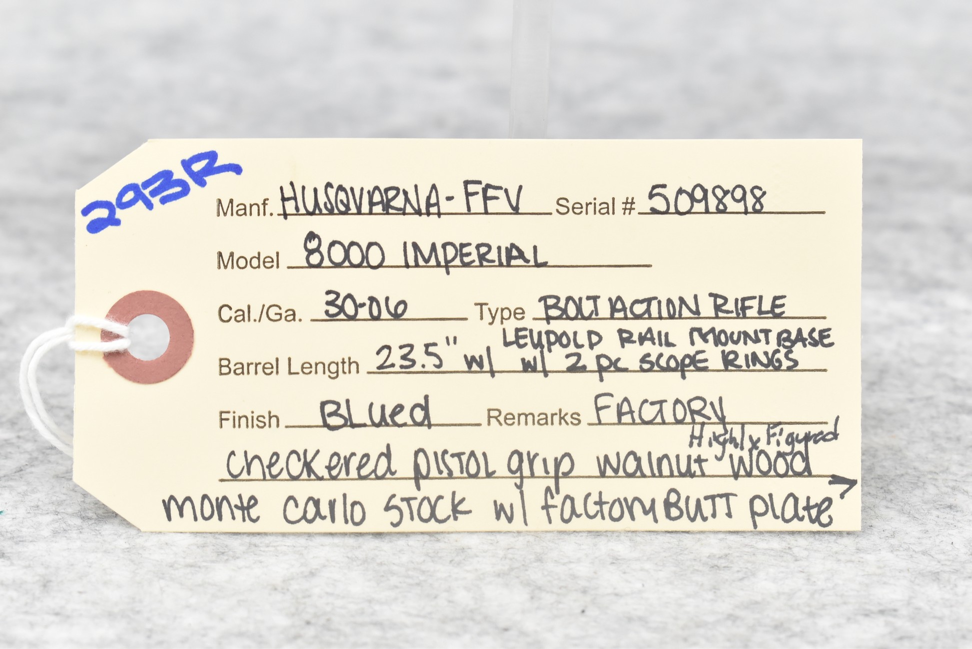 293R. Husqvarna-FFV – Mod. 8000 Imperial – 30-06 Cal. Bolt Action Rifle – w/23.5” Barrel – Blued Finish – w/Engraved Floor Plate – w/Jeweled Bolt – w/Factory Checkered Pistol Grip Walnut Highly Figured Monte Carlo Wood Stock w/Factory Butt Plate – w/Adj. Trigger – w/Leupold Rail Mount Base & 2pc. Scope Rings – Mfg. Between 1971-1972