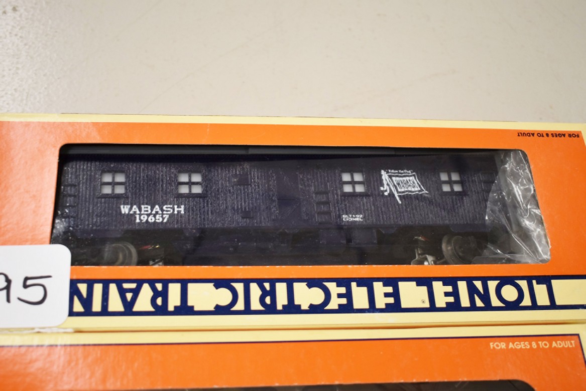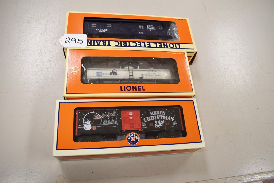 295. Lot of 3 Lionel Train Cars – Including Wabash Bunk Car 6-19657, 2019 Christmas Boxcar 1928490, and TC SDM Len Oil 6-26101 – All w/Boxes