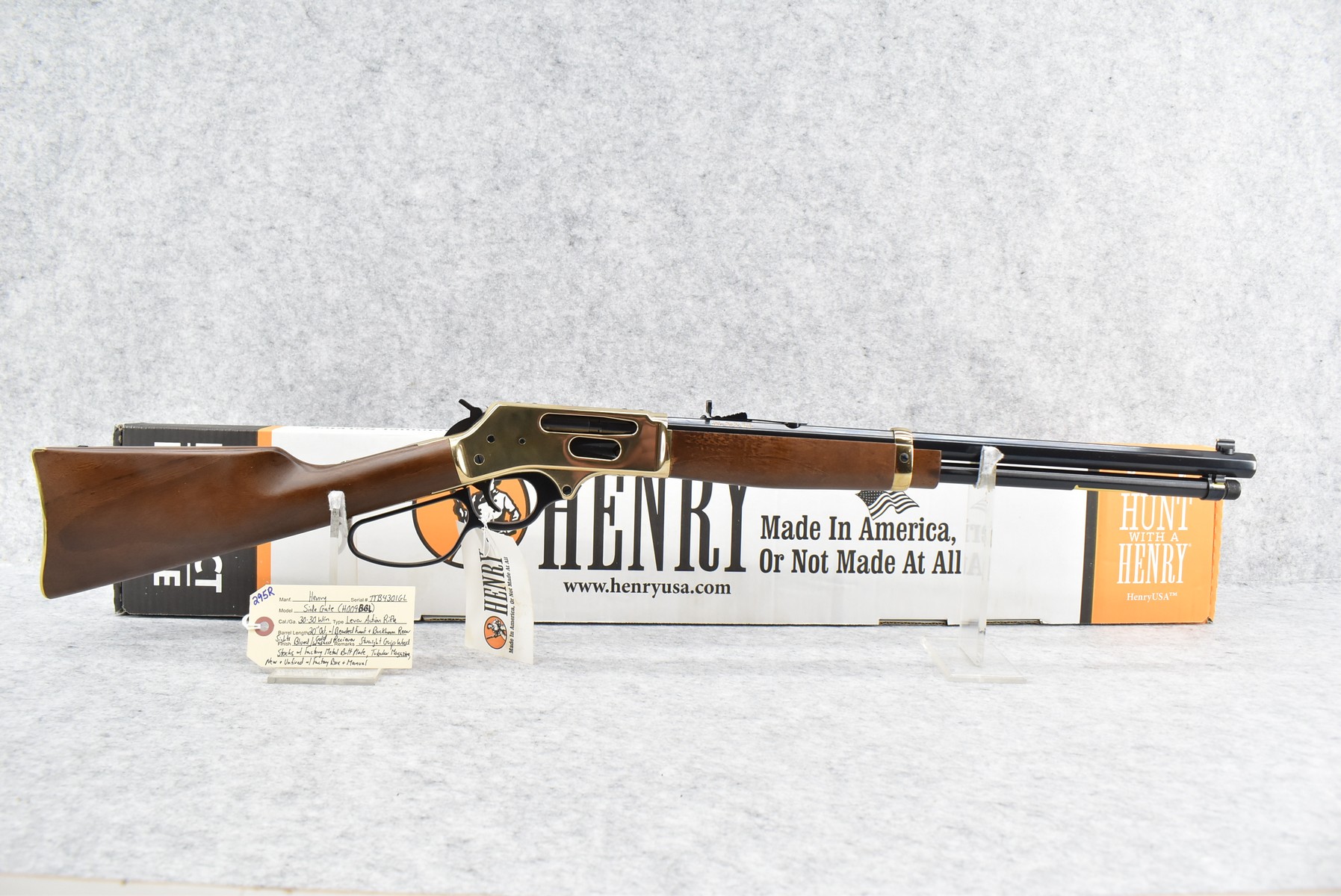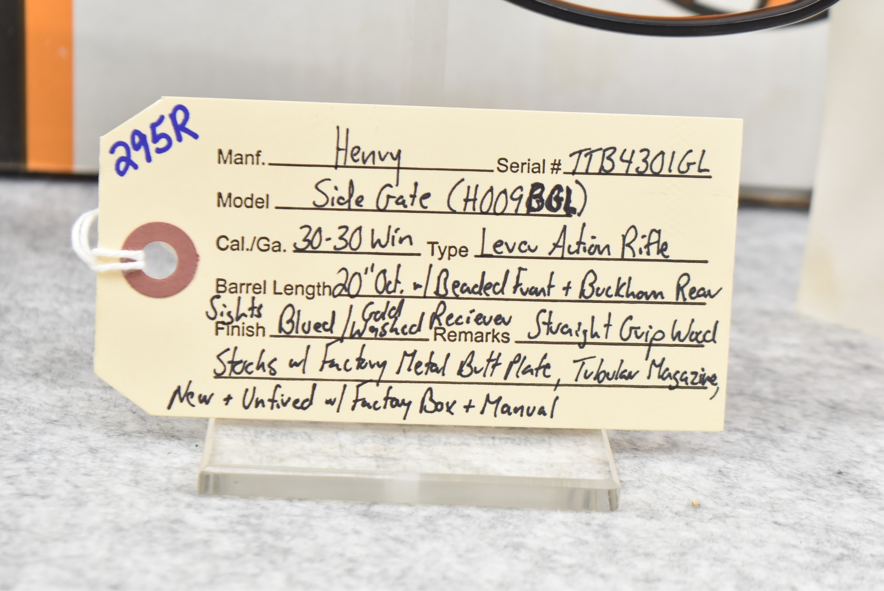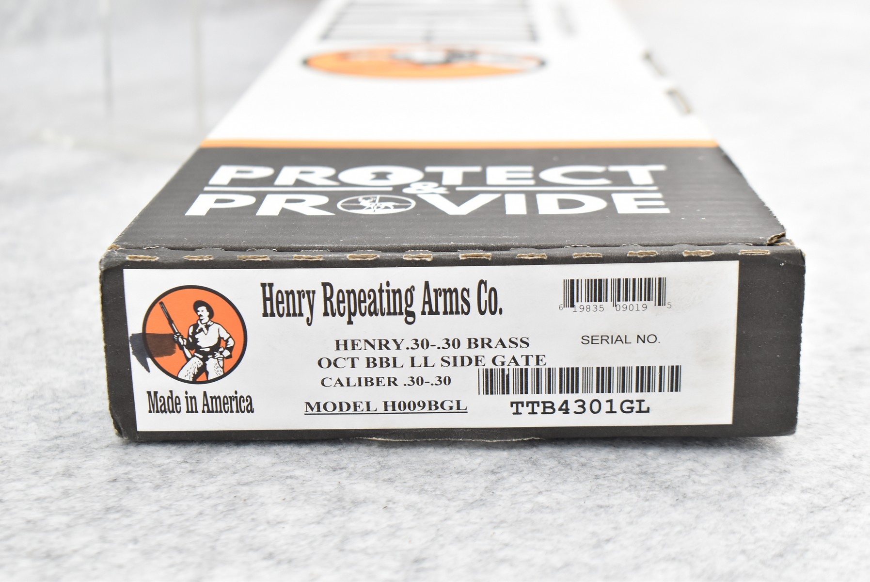 295R.     Henry – Mod. Side Gate (H009BGL) – 30-30 Win. Cal. Lever Action Rifle – w/20” Octagon Barrel w/Beaded Front & Buckhorn Rear Sights w/Tubular Magazine – Blued Finish w/Brass Receiver – w/Straight Grip Wood Stocks w/Factory Metal Butt Plate – Unfired w/Factory Box & Manual