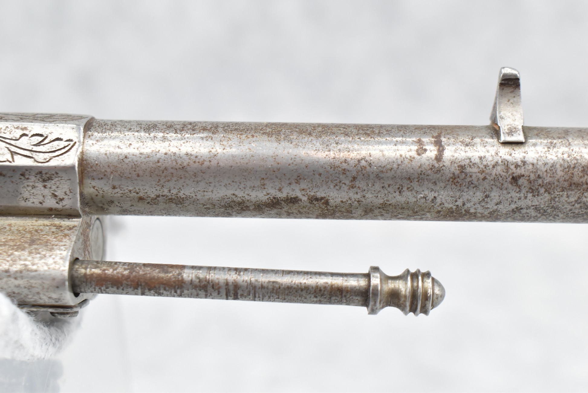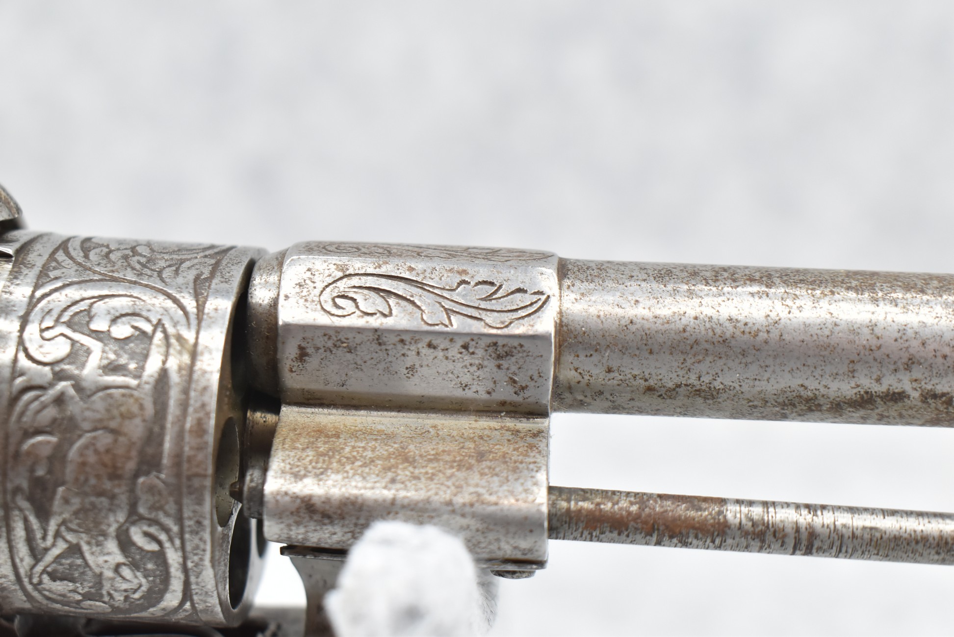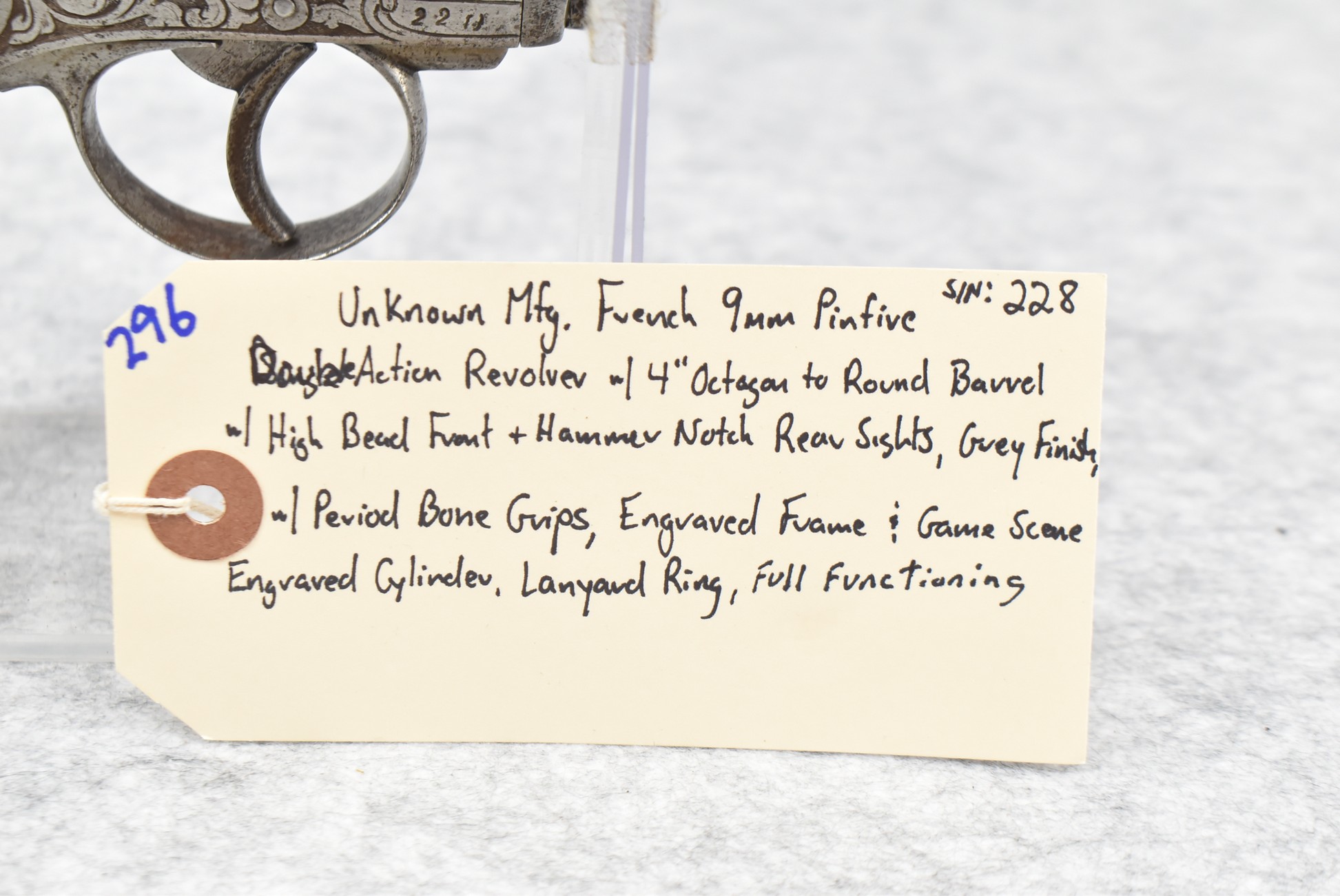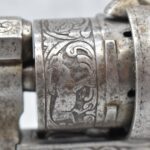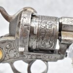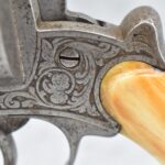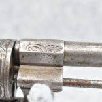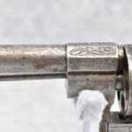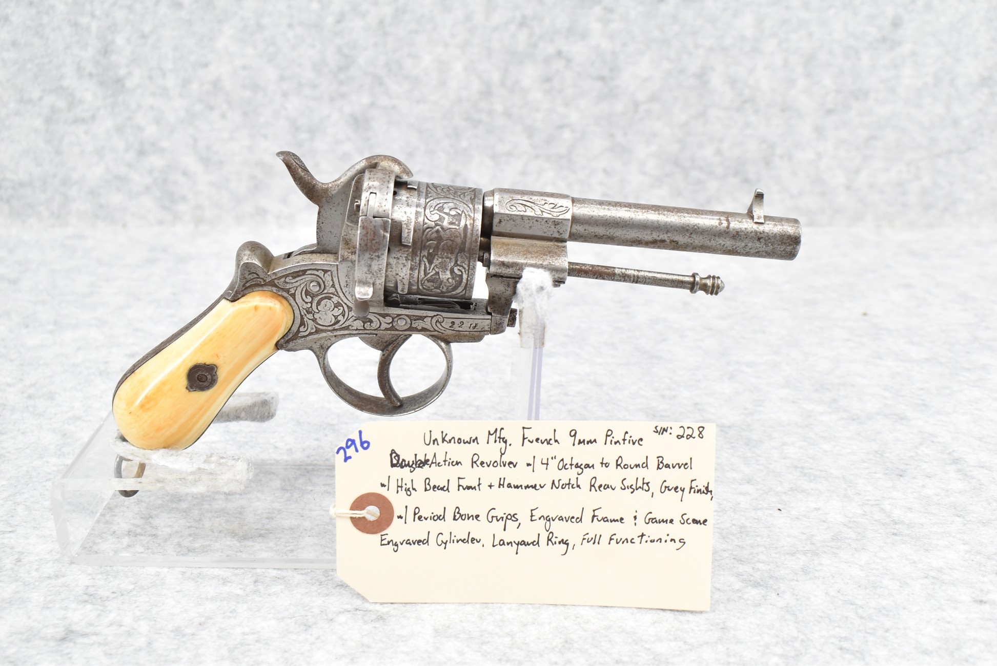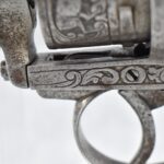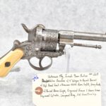 296. Unknown Mfg. – French 9mm Pinfire Double Action Revolver – w/4” Octagon to Round Barrel w/High Bead Front & Hammer Notch Rear Sights – Gray Finish – w/Period Bone Grips – w/Engraved Frame & Game Scene Engraved Cylinder – w/Lanyard Ring – Fully Functional