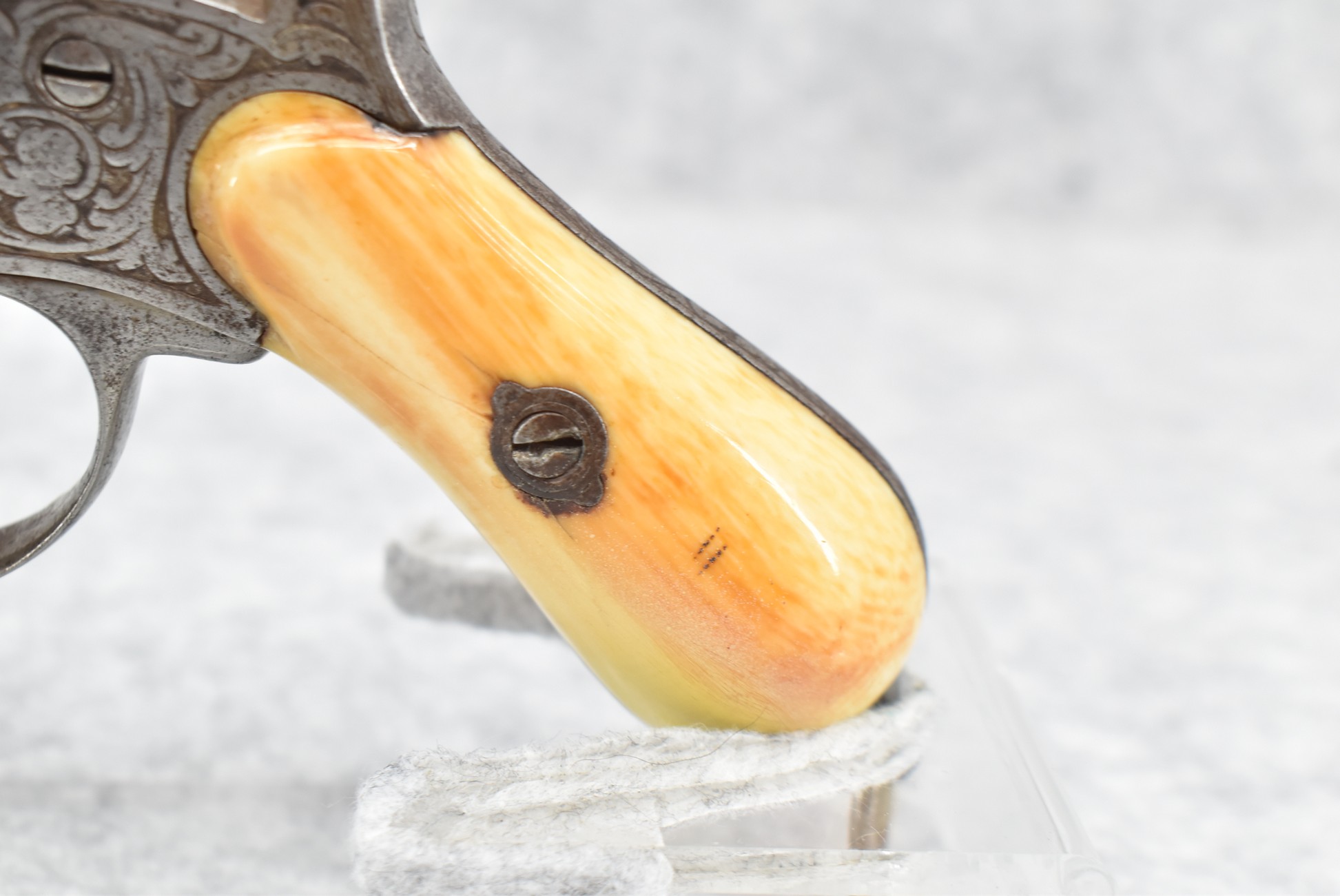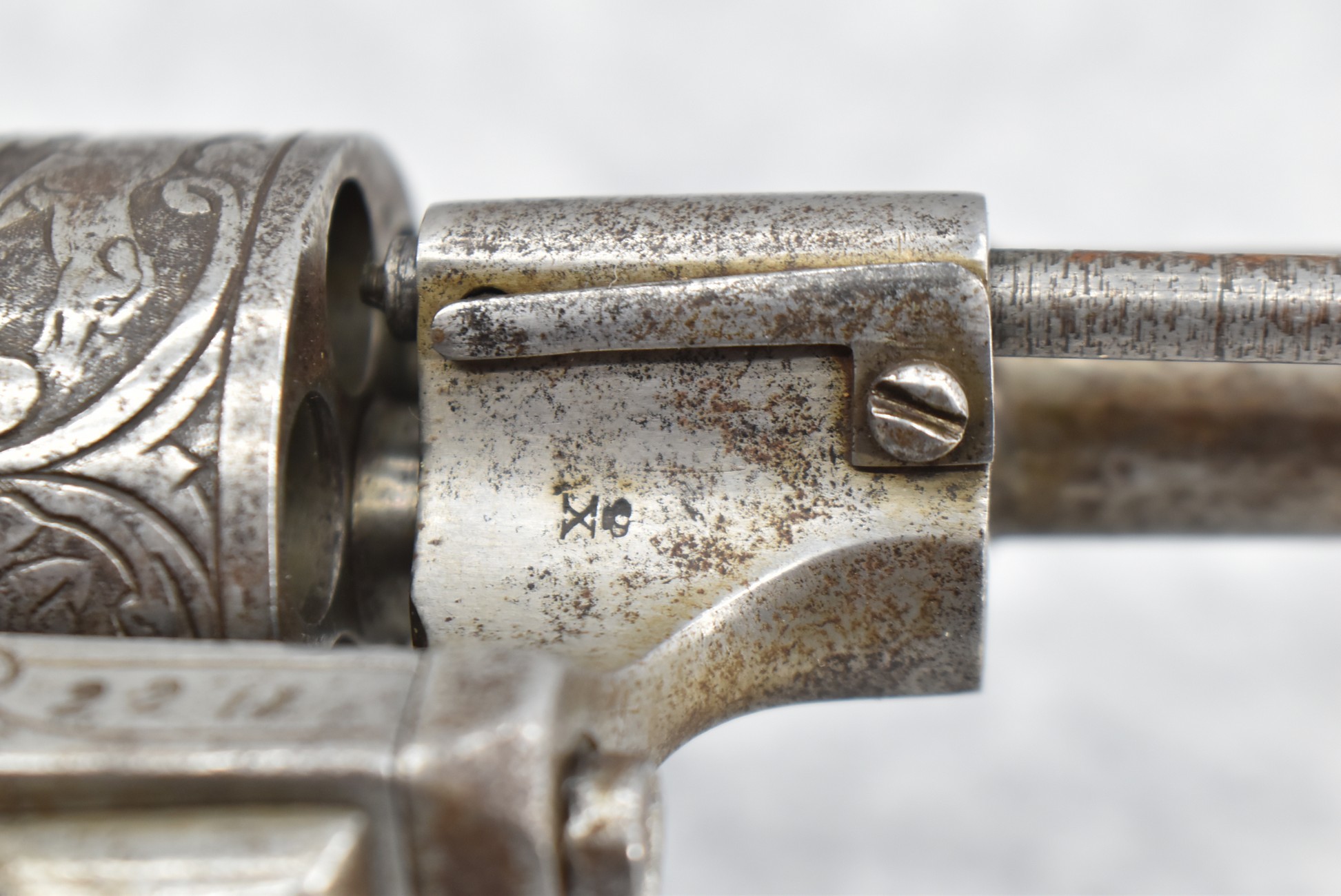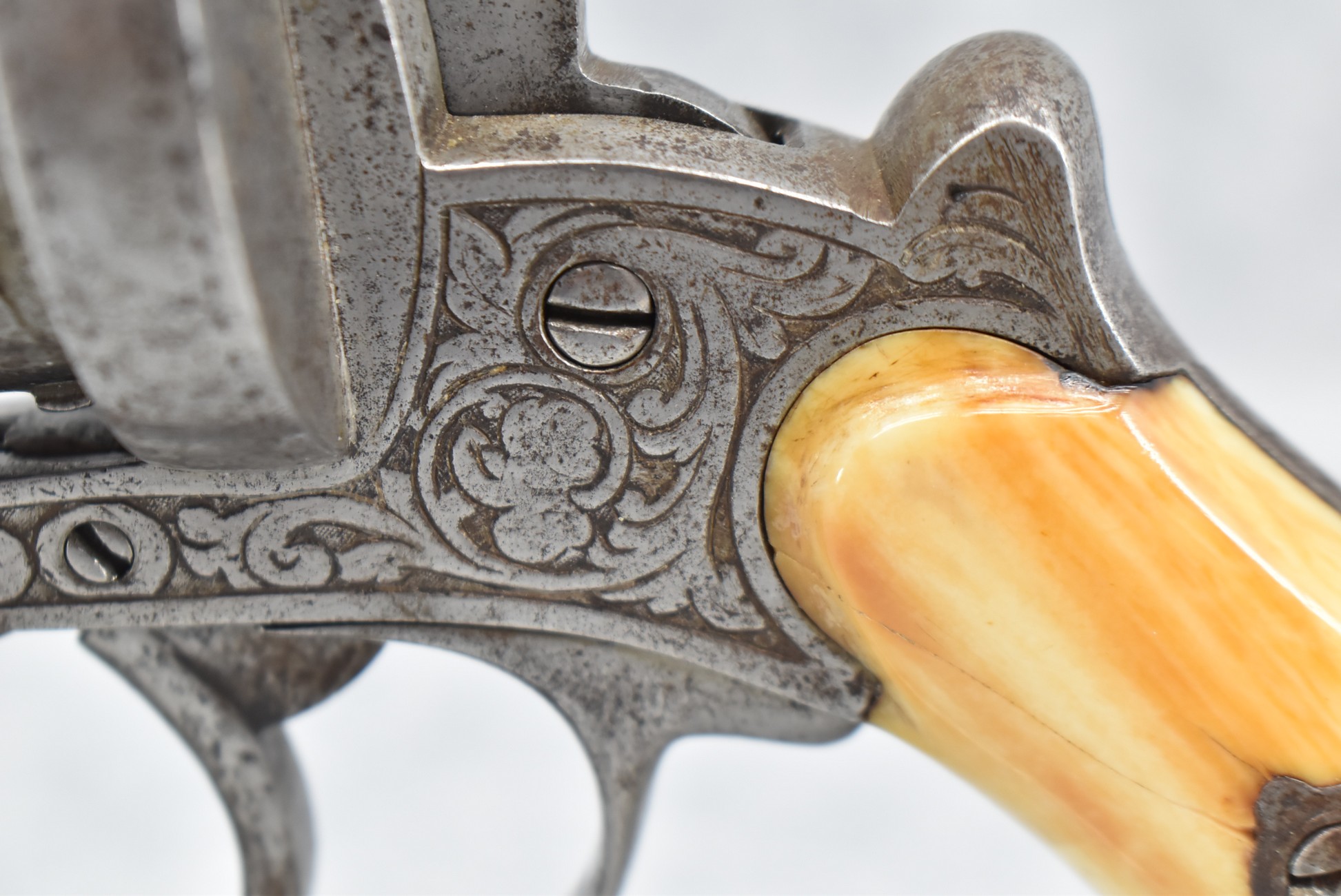 296. Unknown Mfg. – French 9mm Pinfire Double Action Revolver – w/4” Octagon to Round Barrel w/High Bead Front & Hammer Notch Rear Sights – Gray Finish – w/Period Bone Grips – w/Engraved Frame & Game Scene Engraved Cylinder – w/Lanyard Ring – Fully Functional