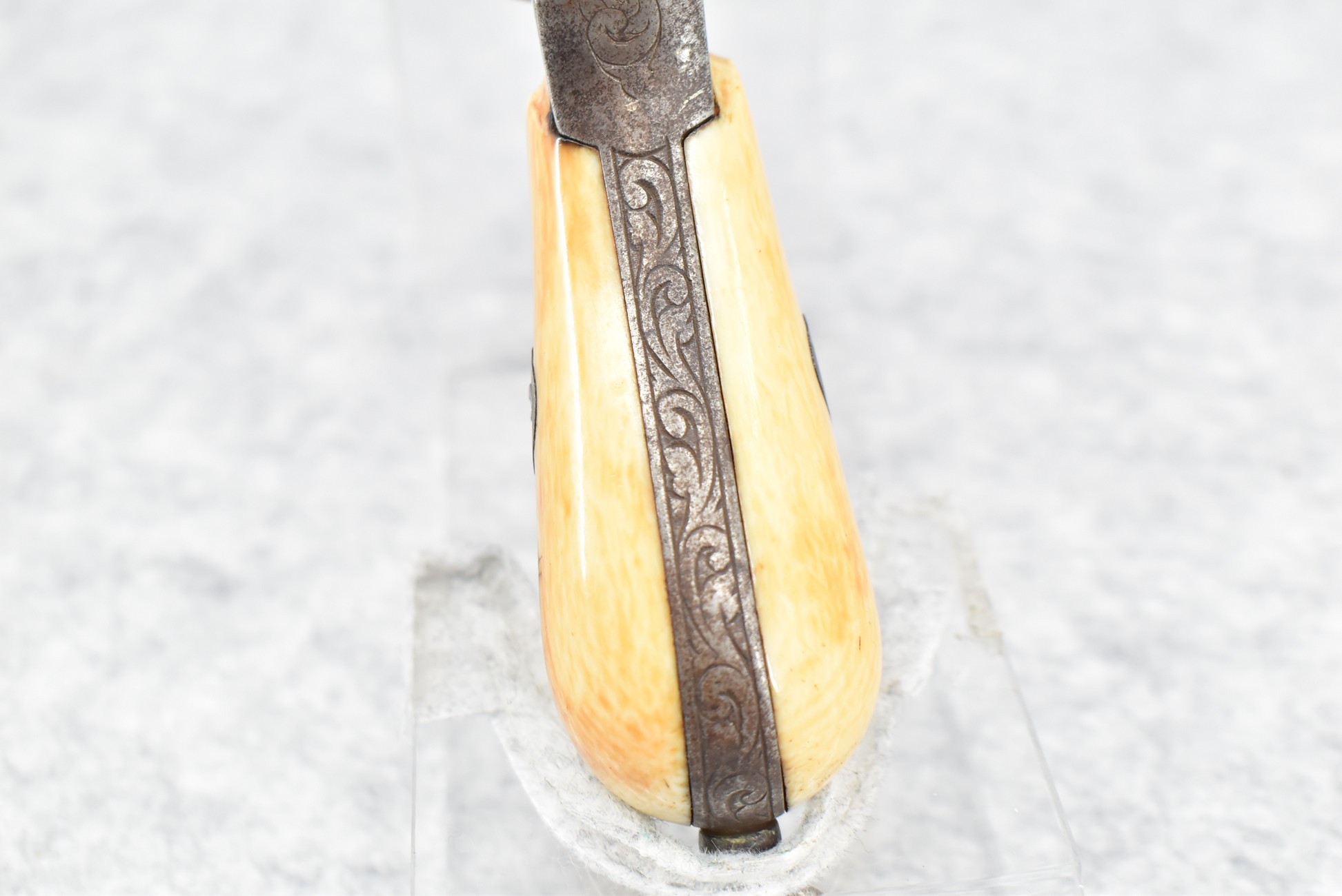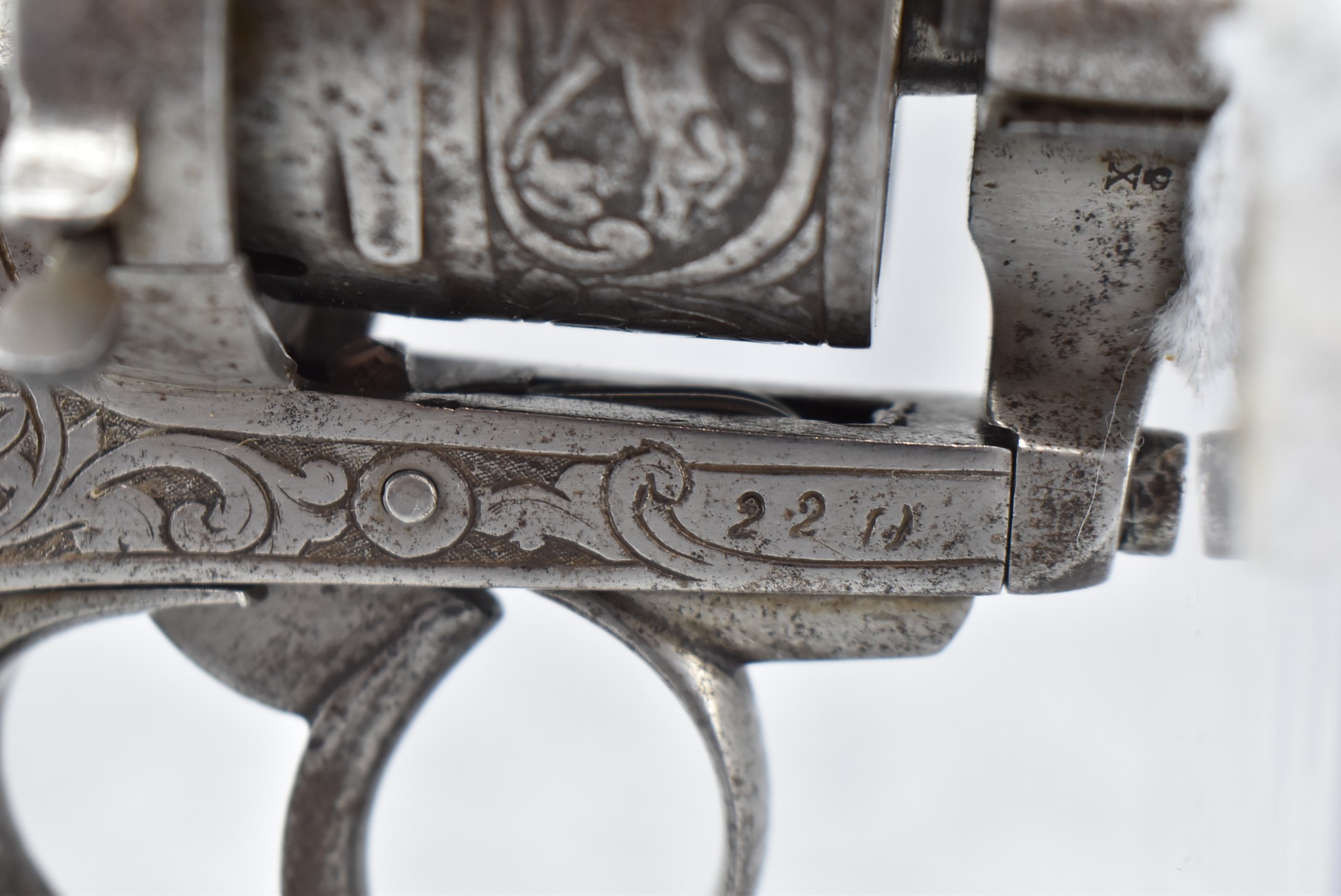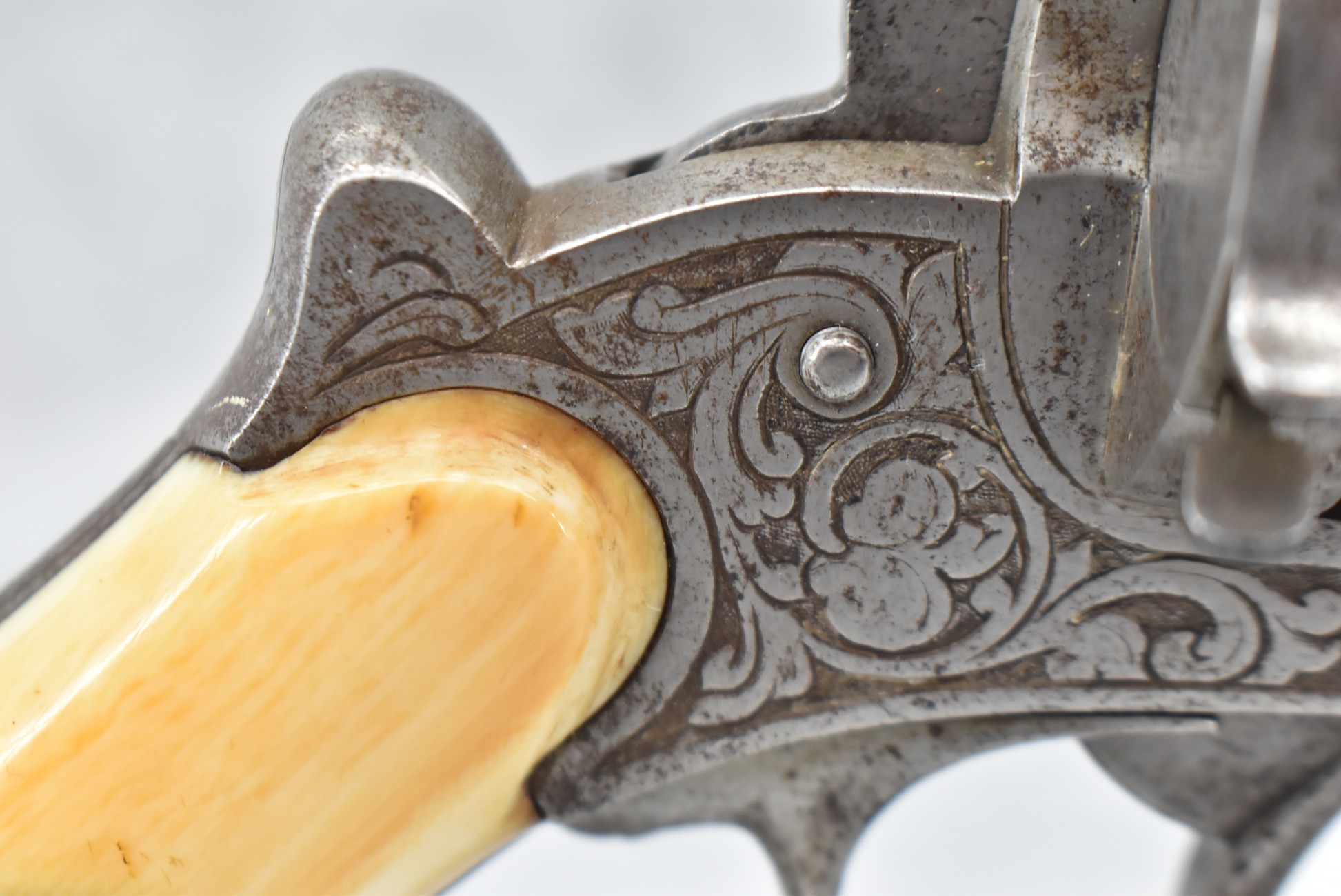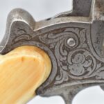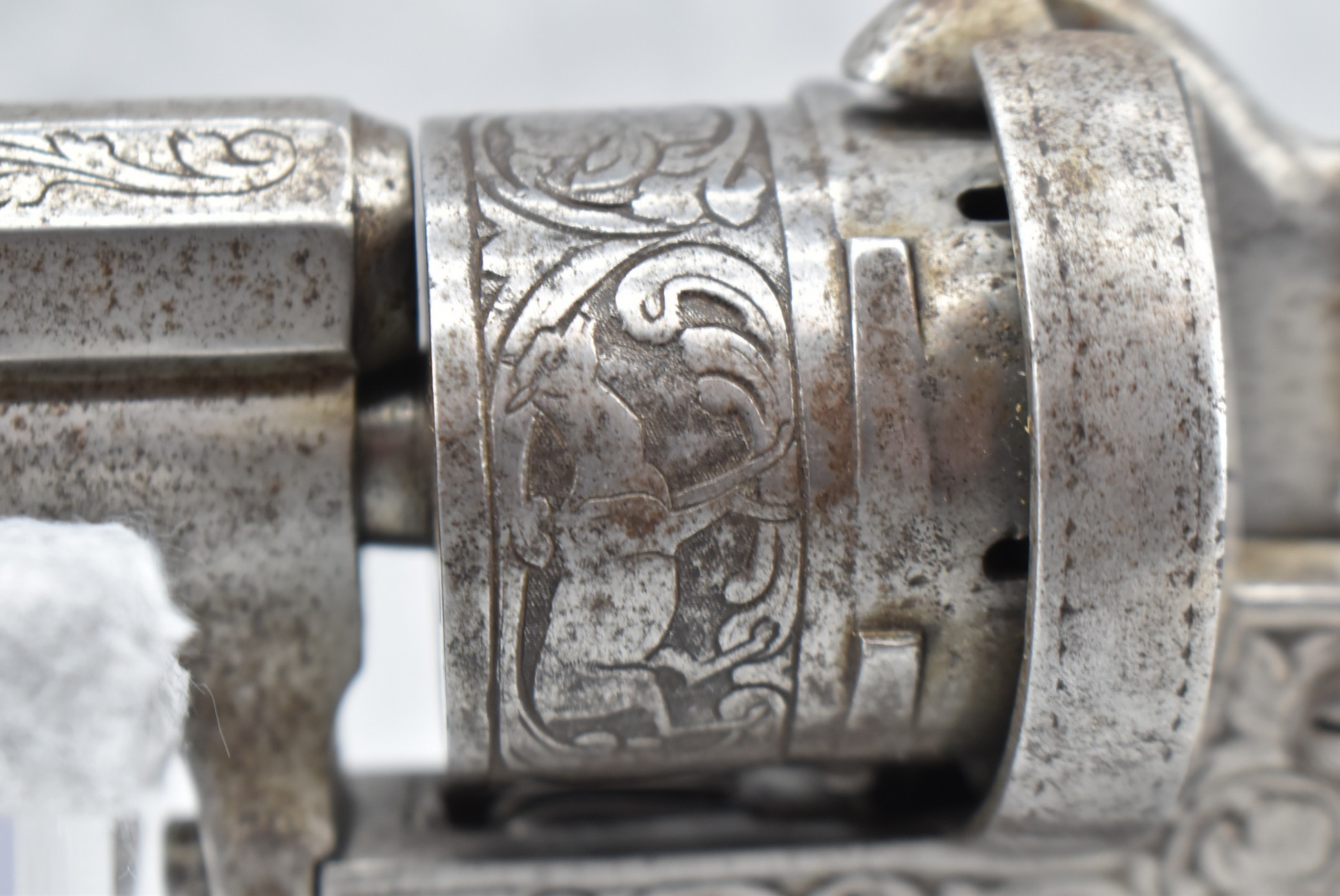 296. Unknown Mfg. – French 9mm Pinfire Double Action Revolver – w/4” Octagon to Round Barrel w/High Bead Front & Hammer Notch Rear Sights – Gray Finish – w/Period Bone Grips – w/Engraved Frame & Game Scene Engraved Cylinder – w/Lanyard Ring – Fully Functional