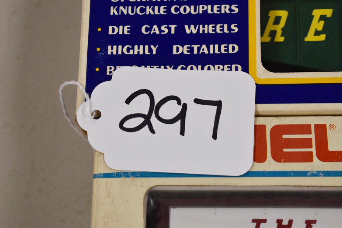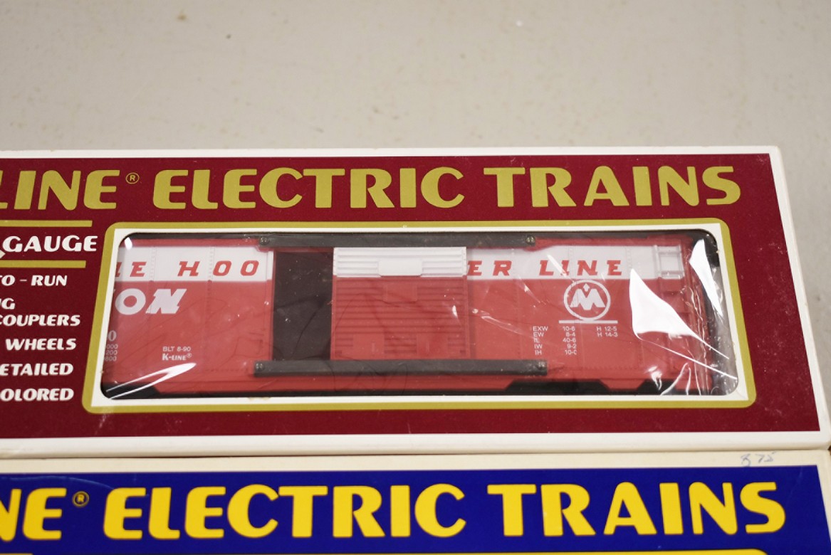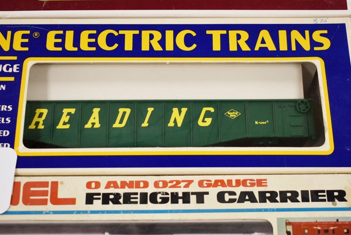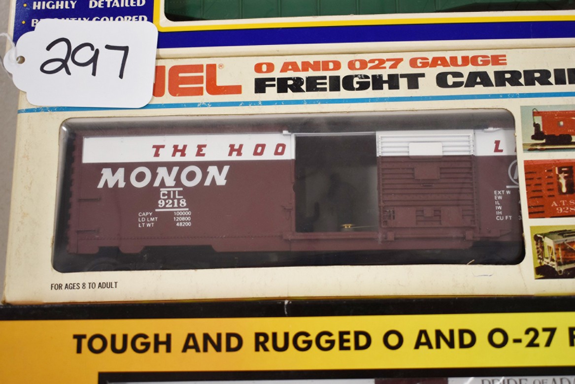 297. Lot of 4 Various Train Cars – Including K-Line Monon Classic Boxcar K-6448, K-Line Reading Gondola K-6515, Lionel Monon Mail Delivery Car 6-9218, and Rail King Adams County Apples Modern Reefer Car 30-78118 – All w/Boxes