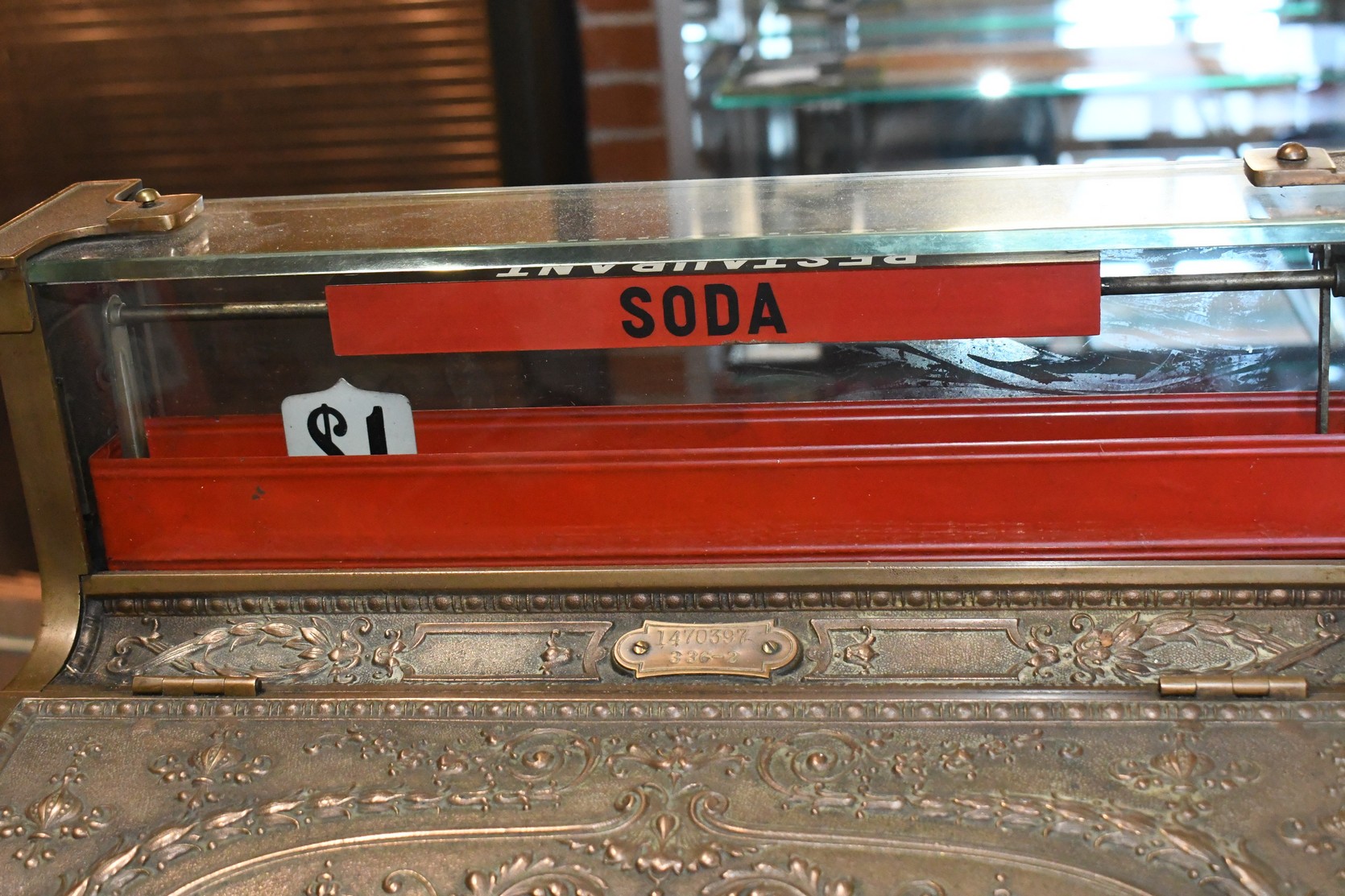297. National Cash Register Co. Heavy Brass and Glass Cash Register w/Marble Tray – Item has a Wooden Base