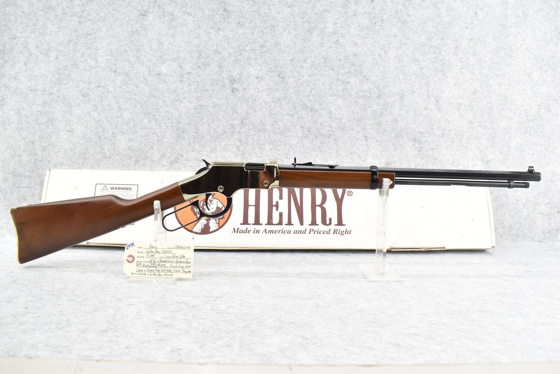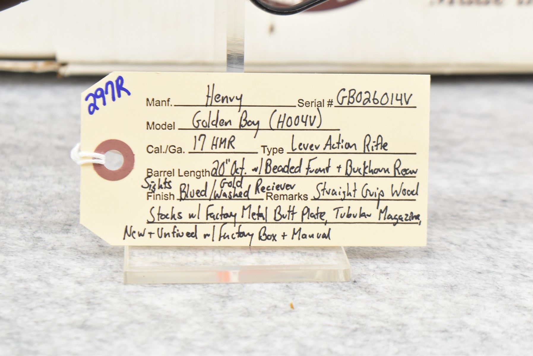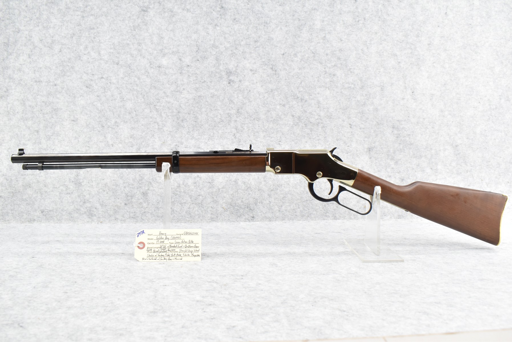 297R. Henry – Mod. Golden Boy (H004V) – 17 HMR Cal. Lever Action Rifle – w/20” Octagon Barrel w/Beaded Front & Buckhorn Rear Sights w/Tubular Magazine – Blued Finish w/Brass Receiver – w/Straight Grip Wood Stocks w/Factory Metal Butt Plate – New & Unfired w/Factory Box & Manual