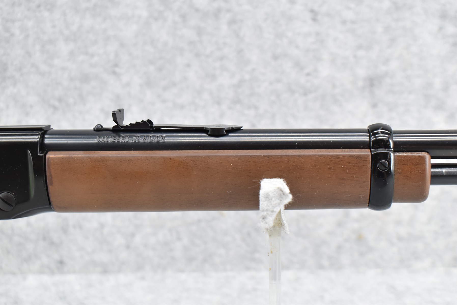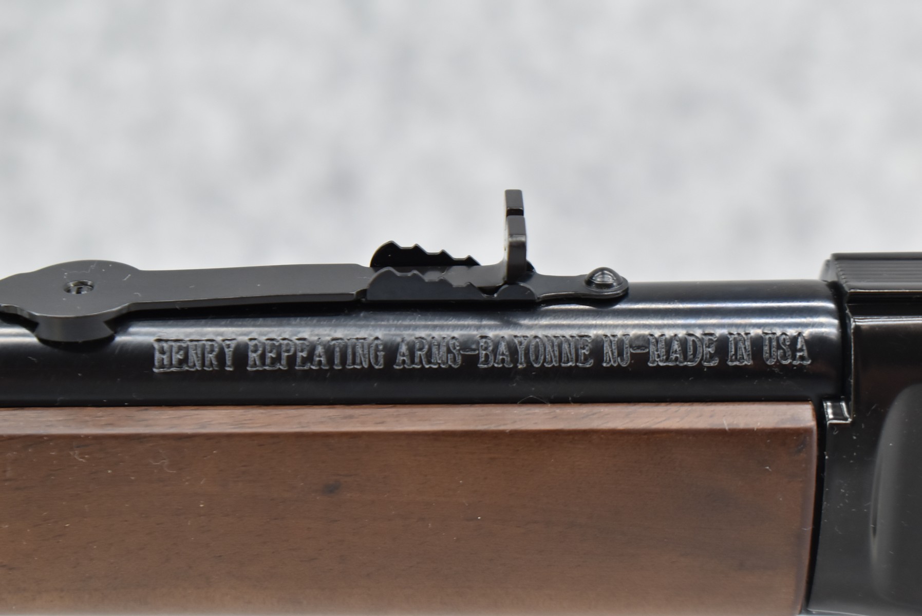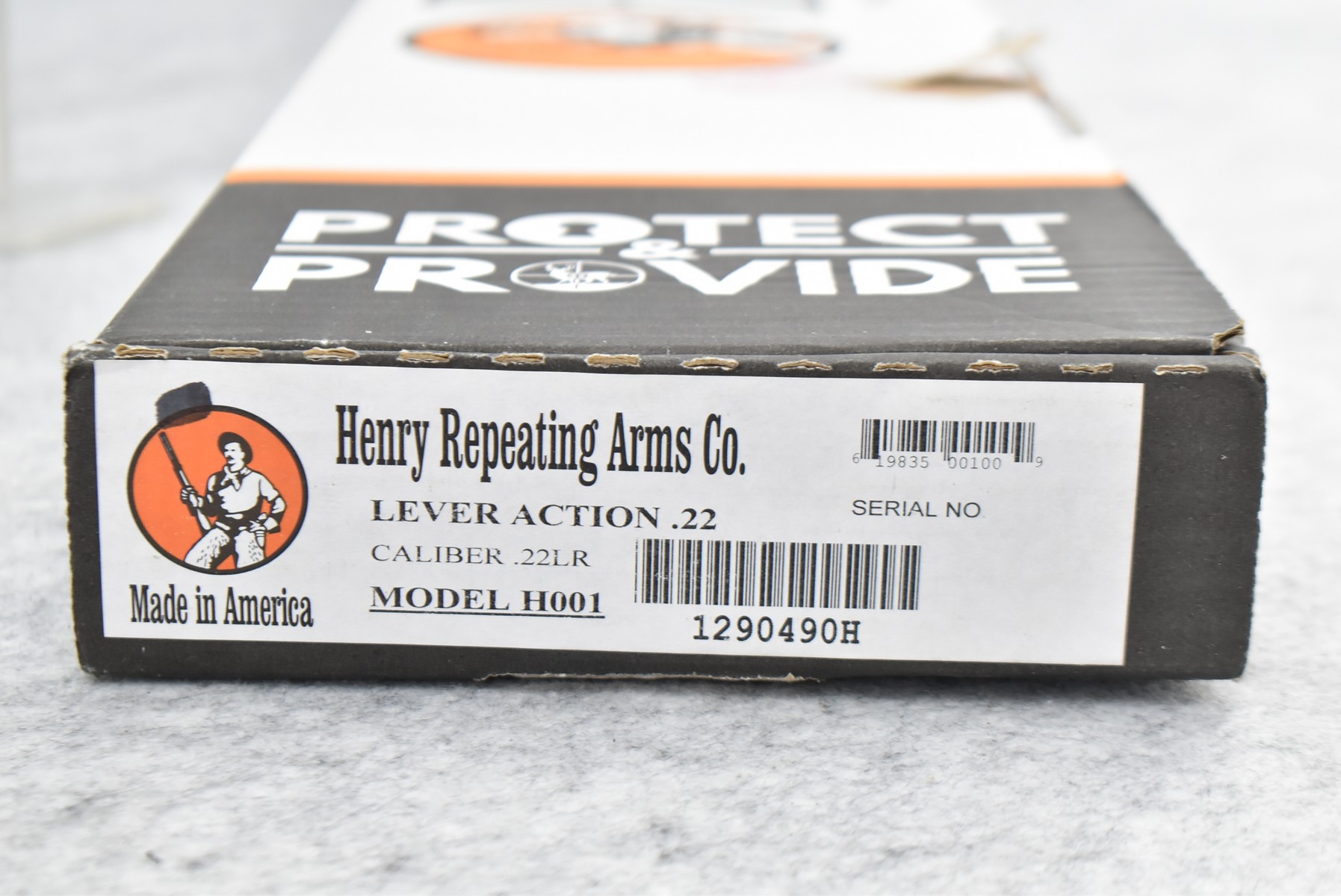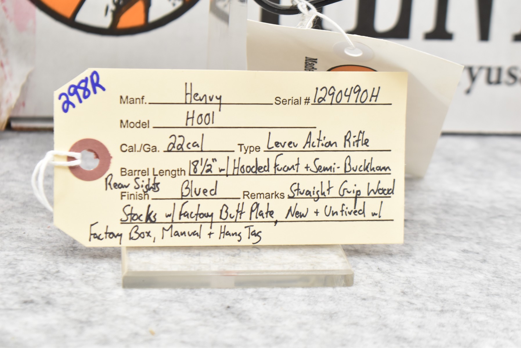 298R.     Henry – Mod. H001 – 22 Cal. Lever Action Rifle – w/18 ½” Barrel w/Hooded Front & Semi-Buckhorn Rear Sights – Blued Finish – w/Straight Grip Wood Stocks w/Factory Butt Plate – New & Unfired w/Factory Box, Manual & Hang Tag