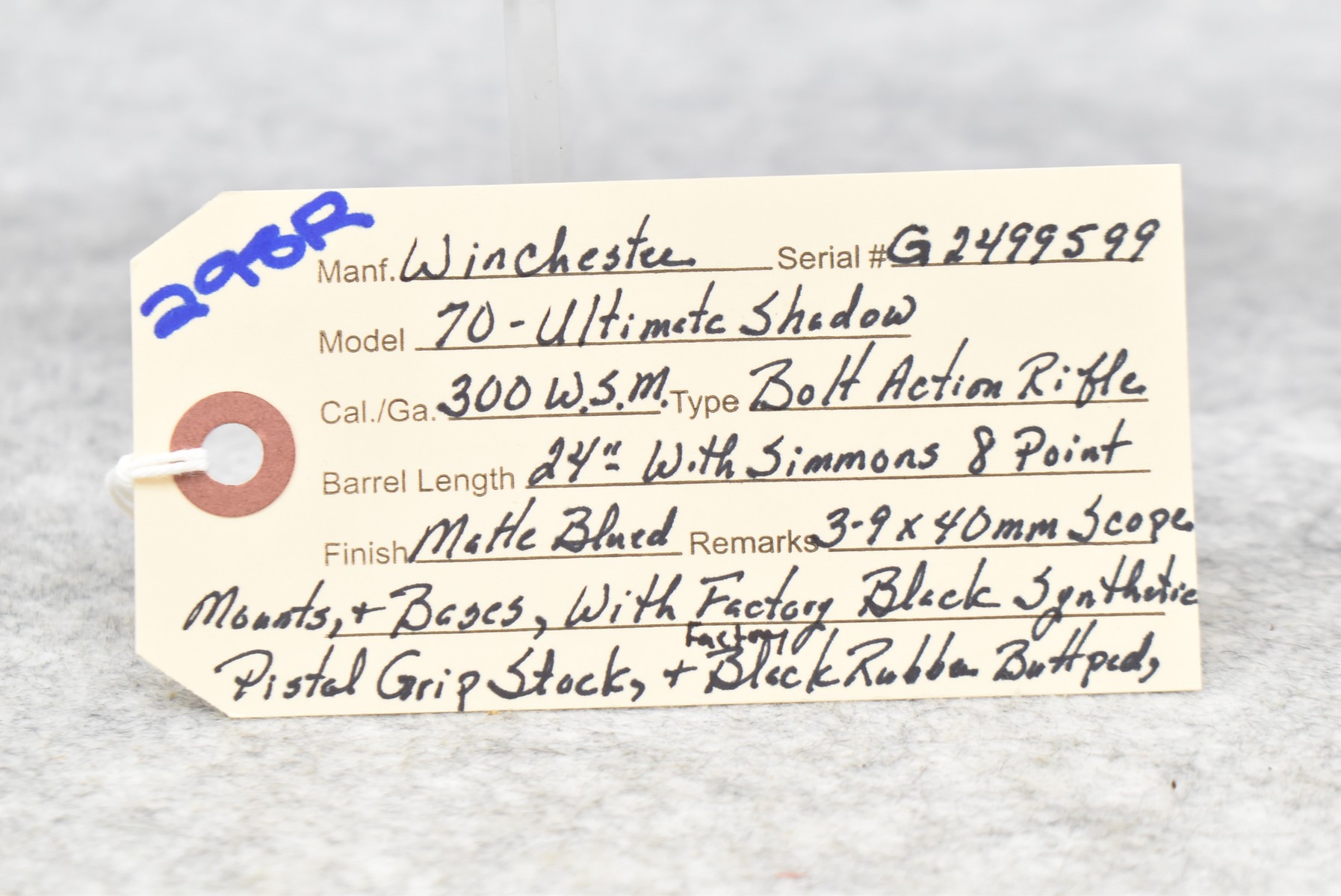 298R. Winchester – Mod. 70 Ultimate Shadow – 300 WSM Cal. Bolt Action Rifle – w/24” Barrel – Matte Blued Finish – w/Factory Black Synthetic Pistol Grip Stock w/Factory Butt Pad – w/Simmons 8 Point 3-9x40mm Scope Mounts & Bases
