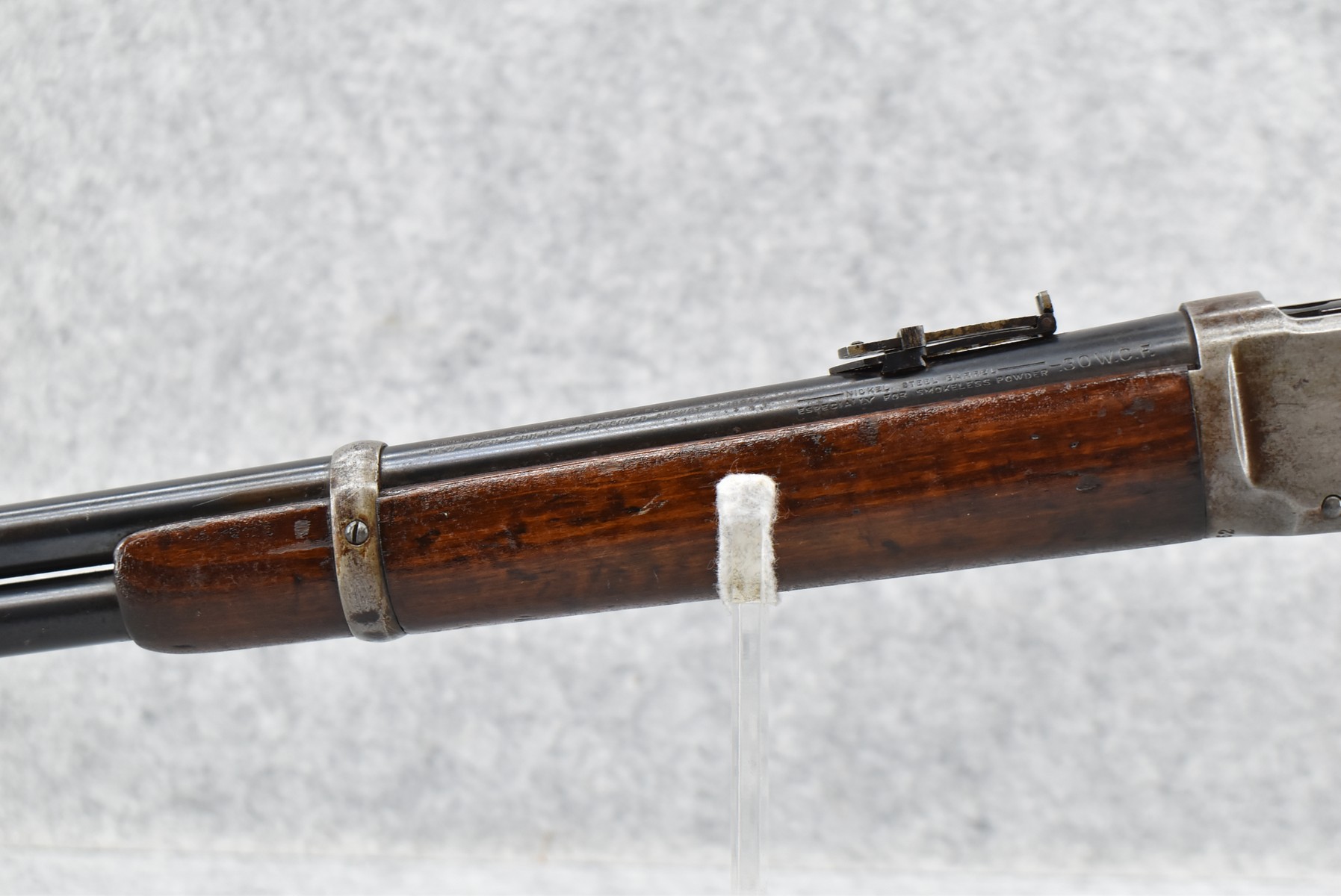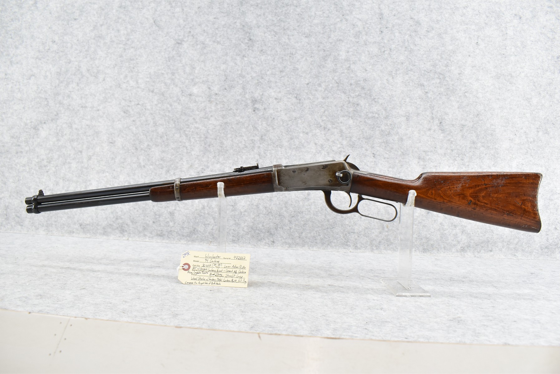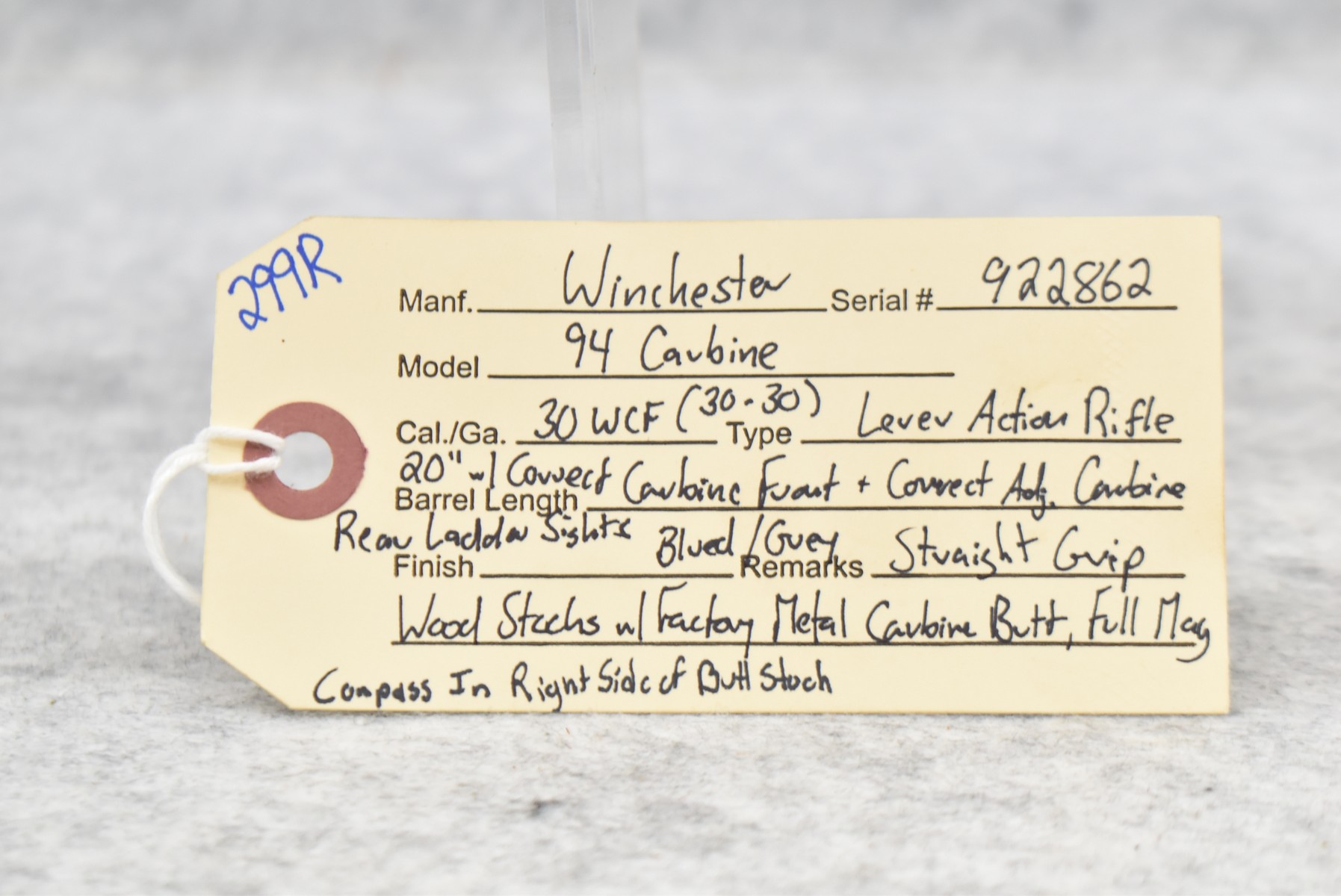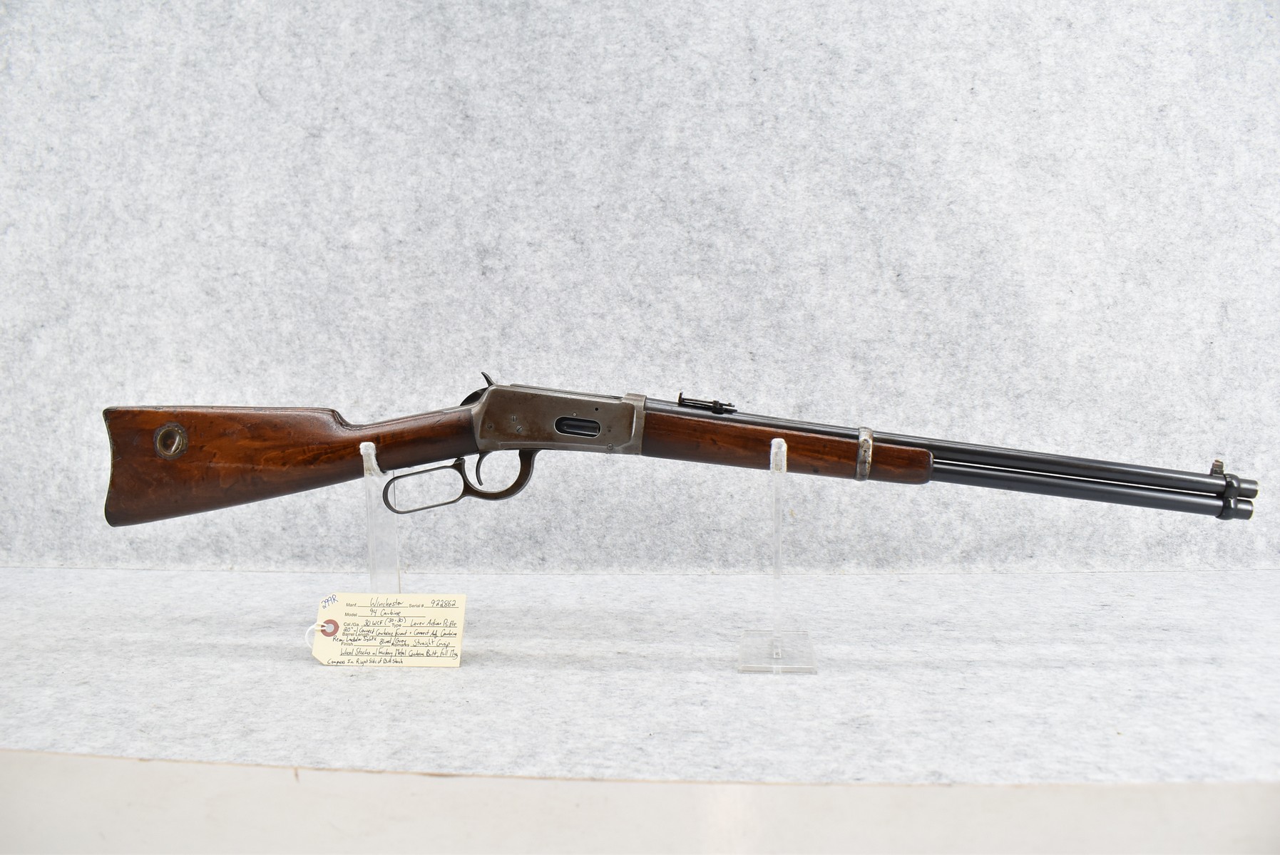 299R. Winchester – Mod. 94 Carbine – 30 WCF (30-30) Cal. Lever Action Rifle – w/20” Barrel w/Correct Carbine Front & Correct Adj. Carbine Rear Ladder Sights w/Full Mag. – Blued/Gray Finish – w/Straight Grip Wood Stocks w/Factory Metal Carbine Butt Plate w/Compass in Right Side of Butt Stock