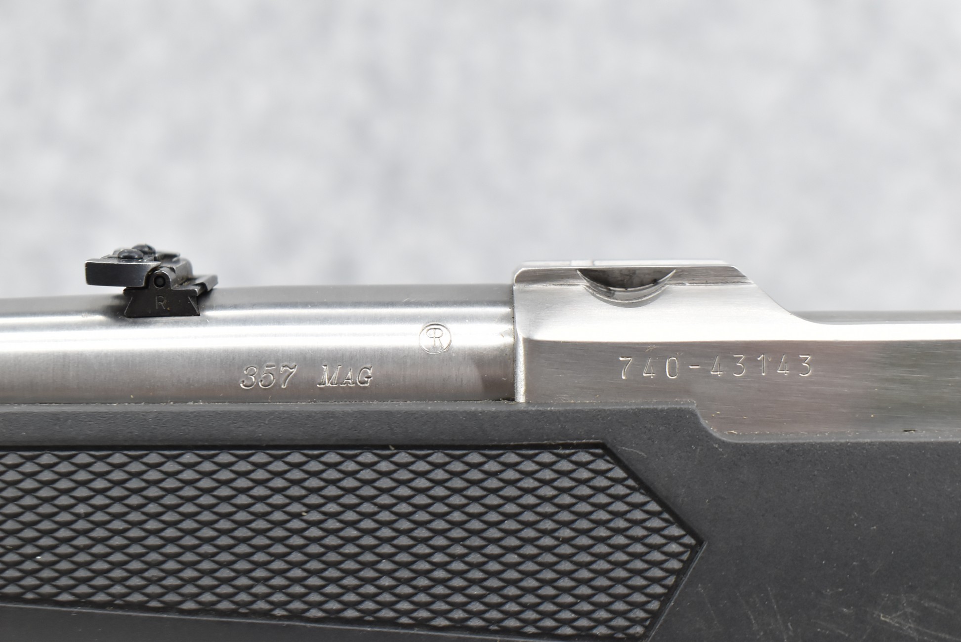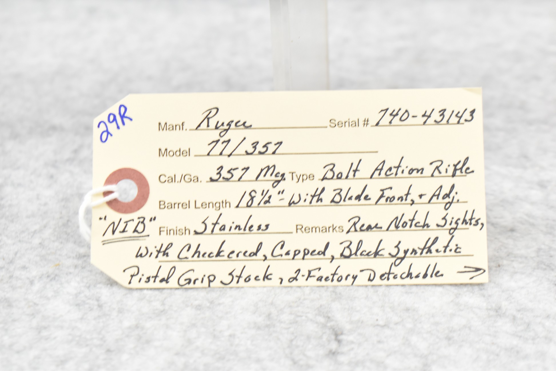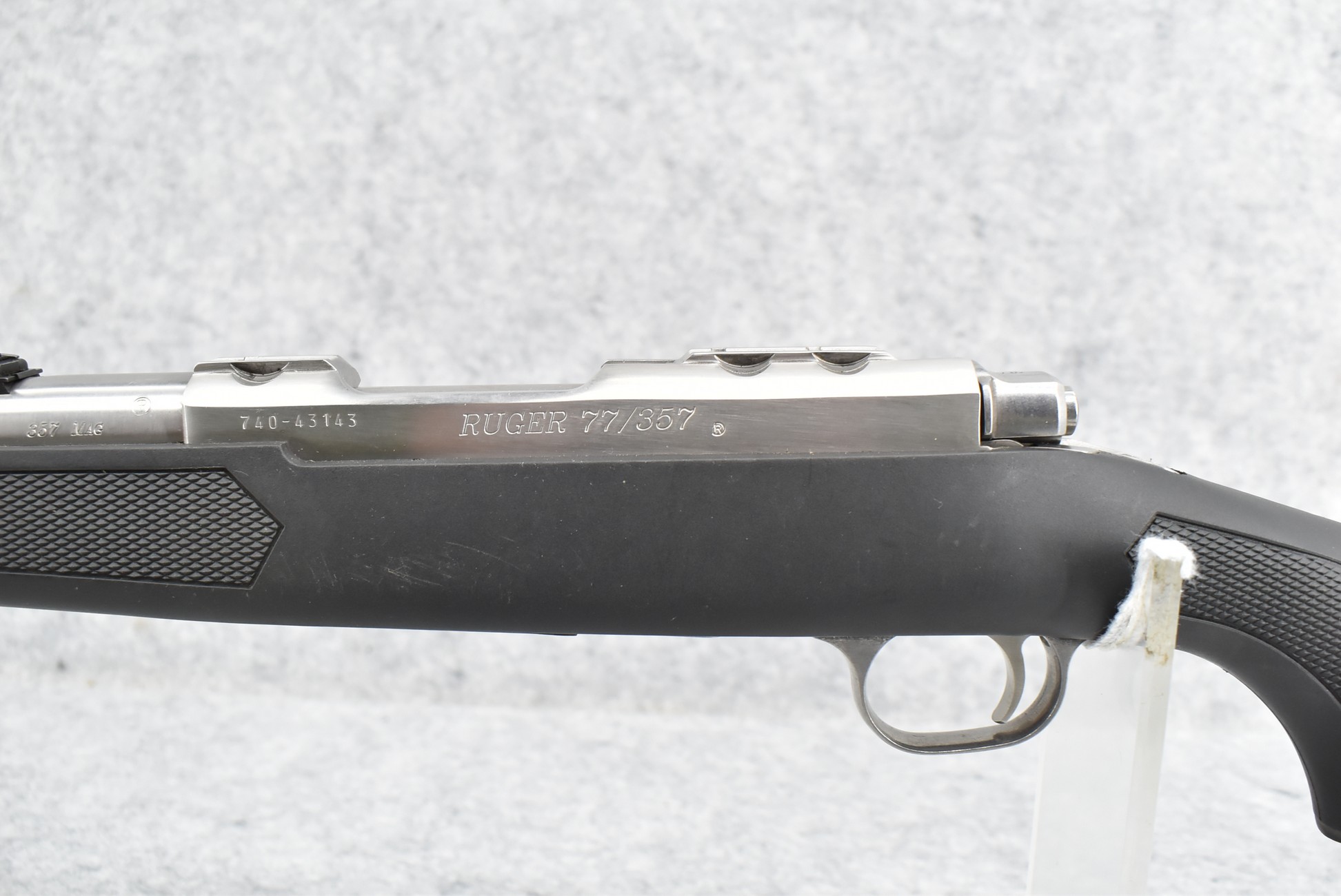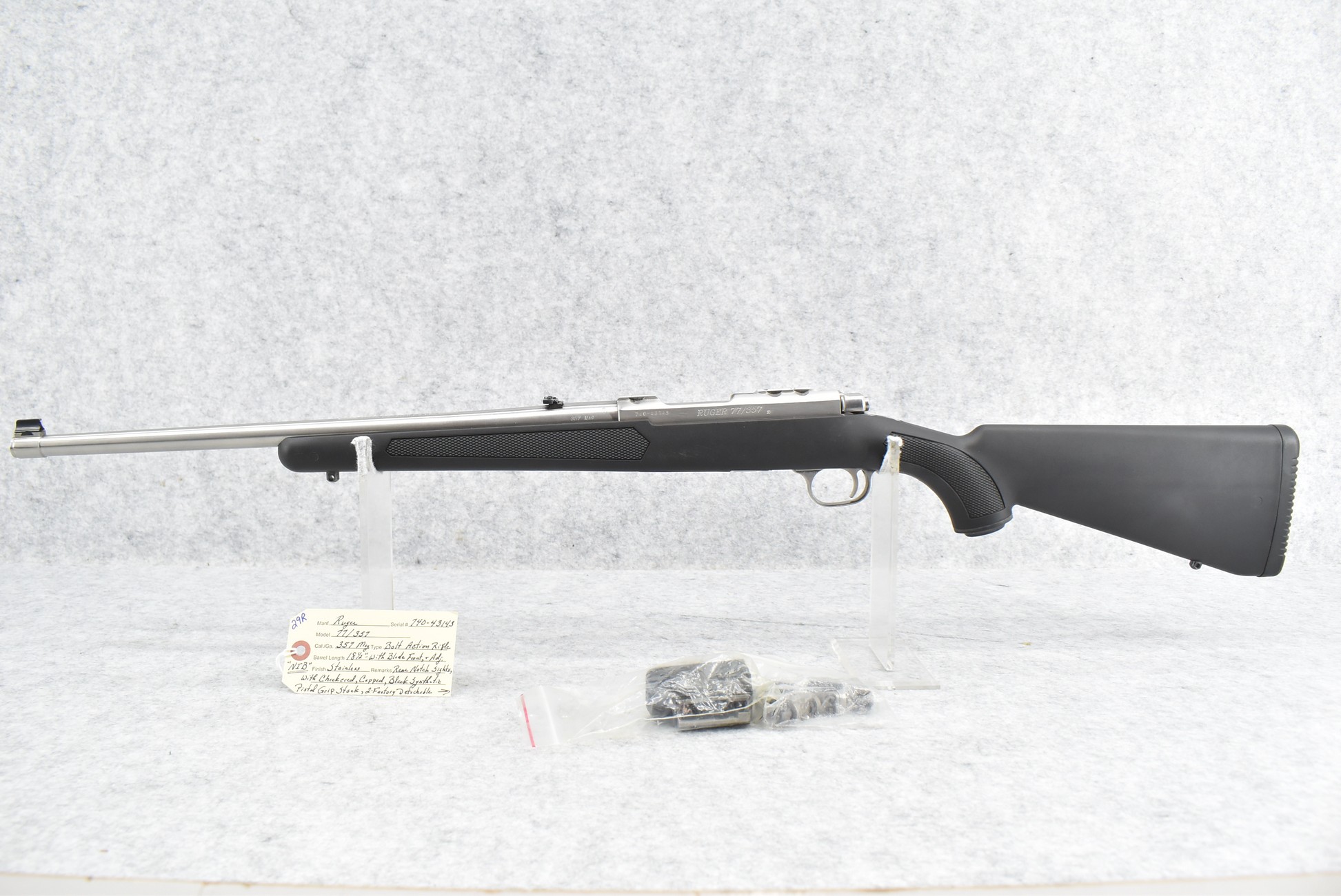 29R. Ruger – Mod. 77/357 – 357 Mag. Cal. Bolt Action Rifle – w/18½” Barrel w/Blade Front and Adjustable Rear Notch Sights – Stainless Finish – w/Checkered Capped Black Synthetic Pistol Grip Stock w/Black Rubber Butt Pad – New in Factory Box w/2 Factory Detachable Magazines, Ruger Rings, Manual, and Accessories