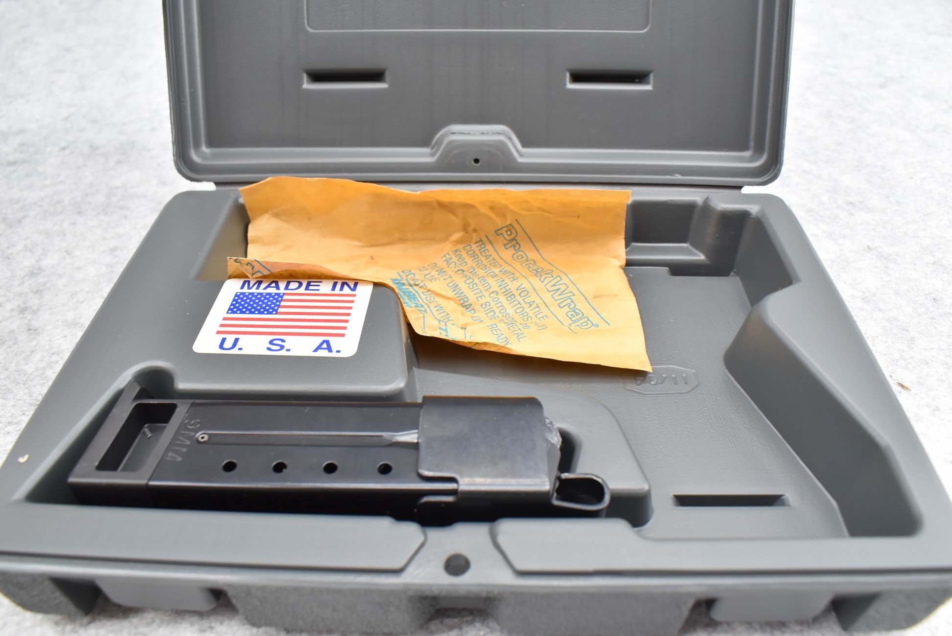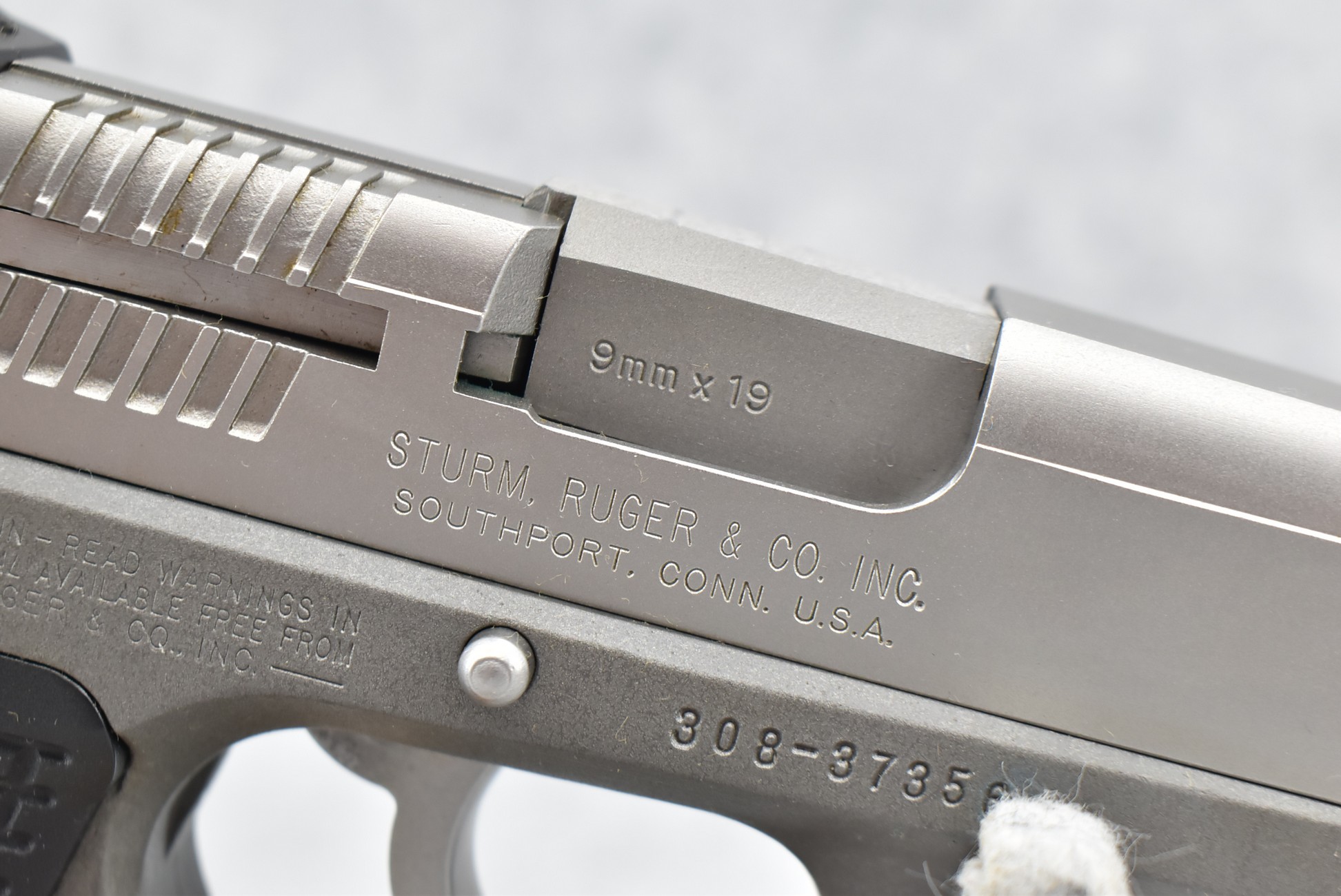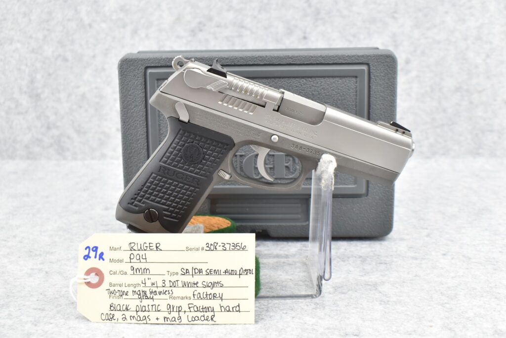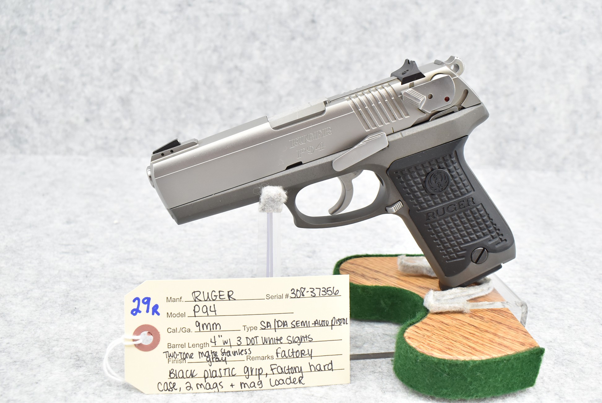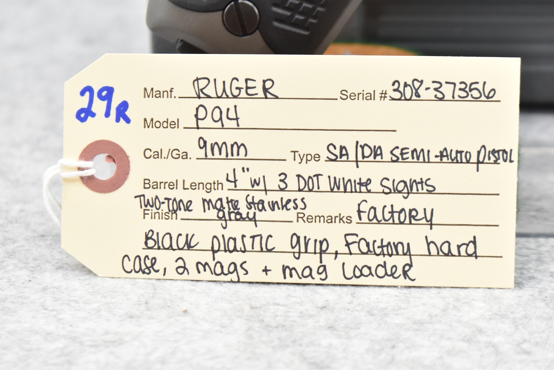 29R.       Ruger – Mod. P94 – 9mm Cal. Semi-Auto Pistol – w/4” Barrel w/3-Dot White Sights – Matte Stainless/Gray Two-Tone Finish – w/Factory Black Plastic Grip – w/Factory Hard Case, 2 Mags & Mag Loader