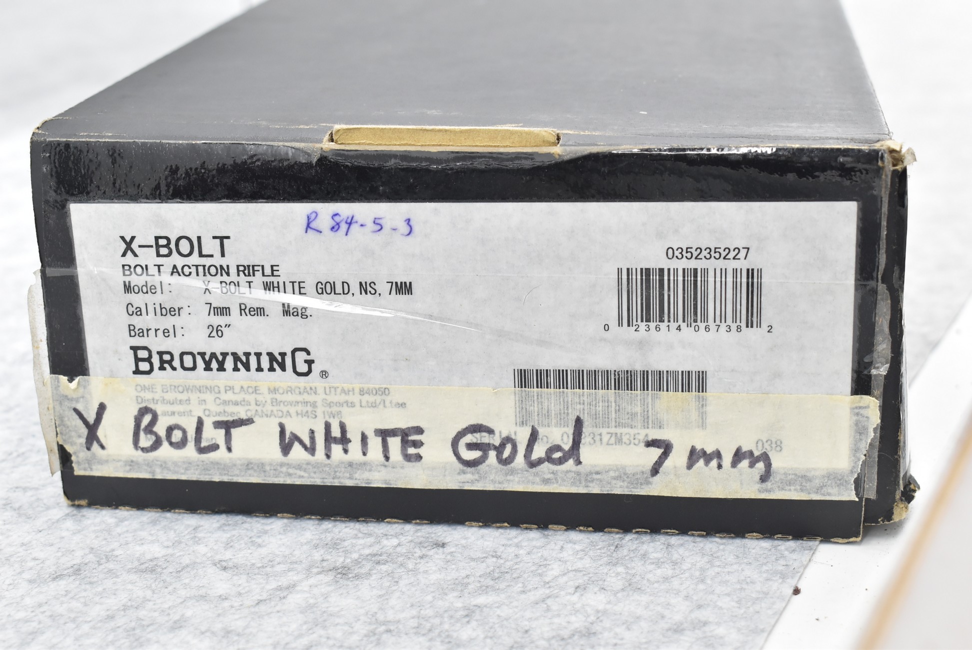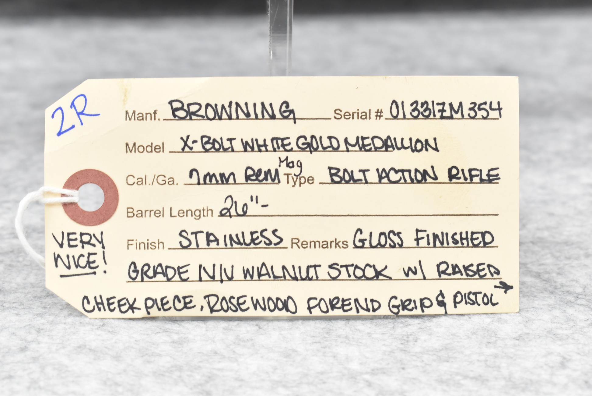 2R. Browning – Mod. X-Bolt White Gold Medallion – 7mm Rem. Mag. Cal. Bolt Action Rifle – w/26” Barrel – Stainless Finish – w/Gloss Finished Grade IV/V Walnut Stock w/Raised Cheek Rest and Rosewood Forend Grip and Pistol Grip Cap w/Inflex Recoil Pad – w/Detachable Rotary Magazine – w/Scroll Engraving on Receiver – w/Sling Swivels – Appears Unfired w/Box