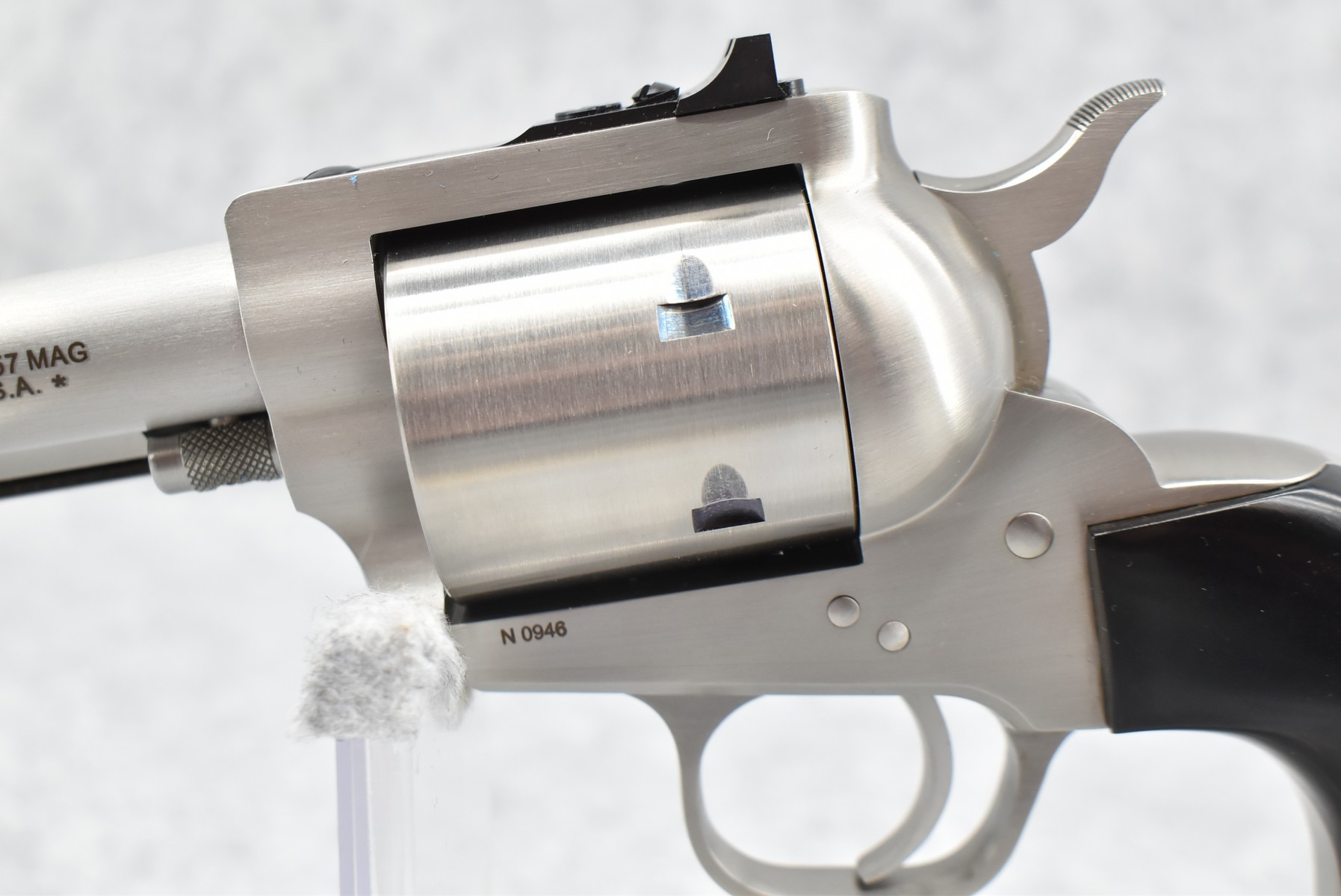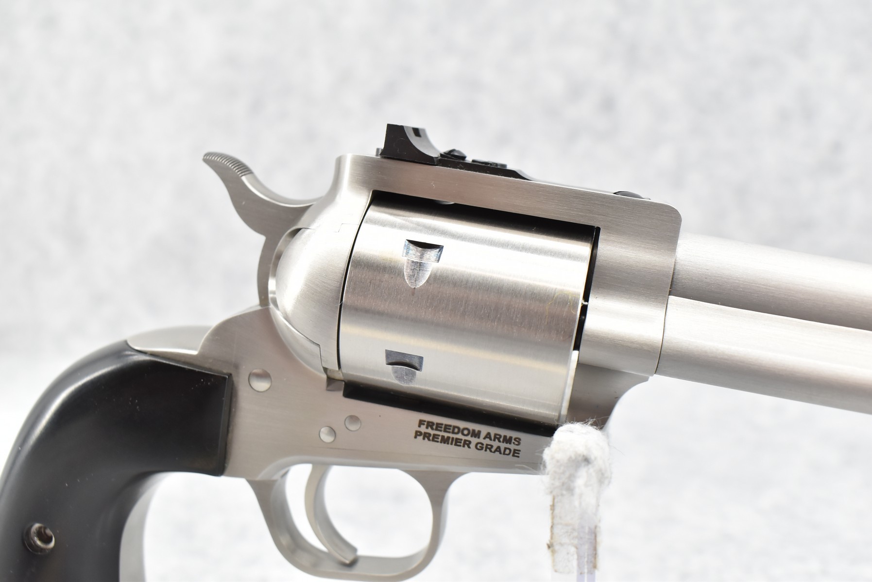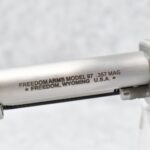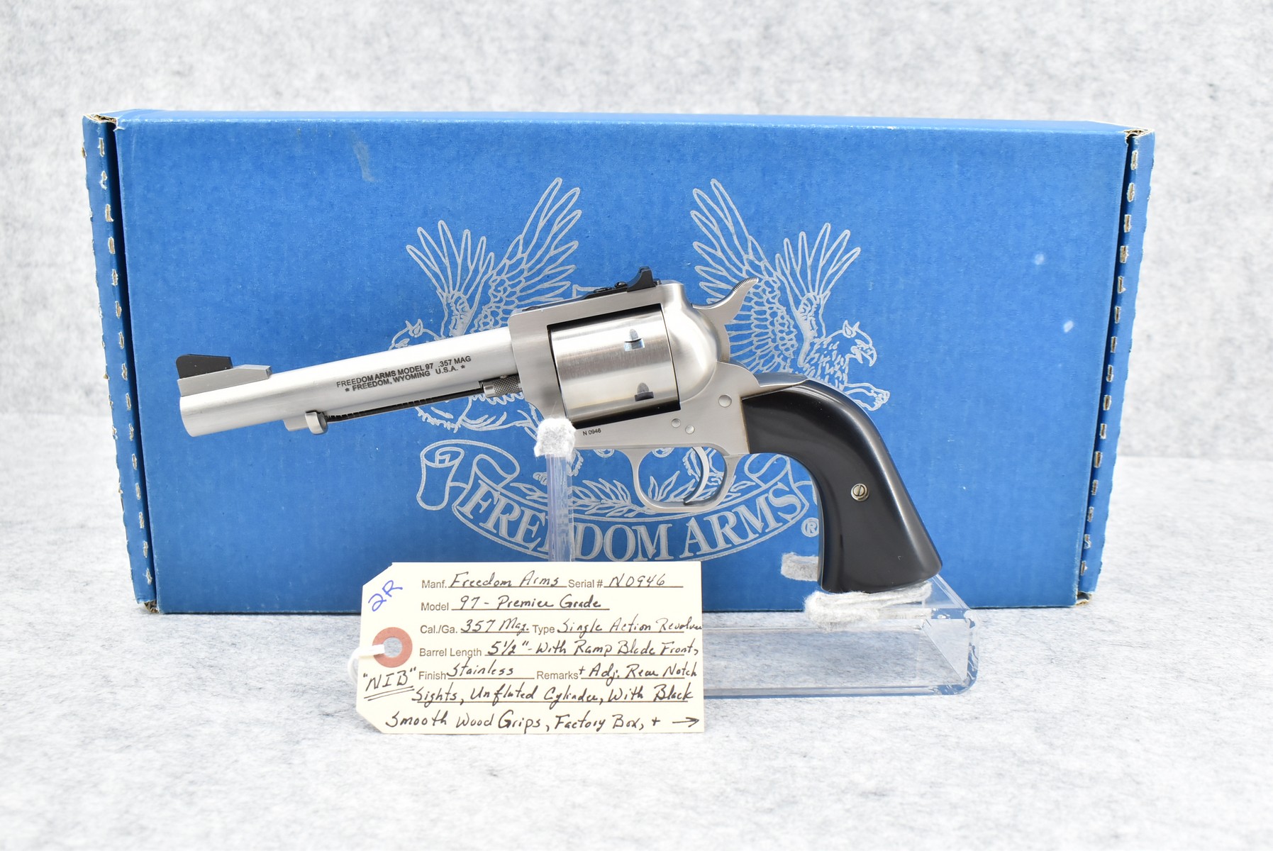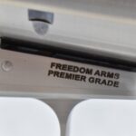 2R. Freedom Arms – Mod. 97 Premier Grade – 357 Mag. Cal. Single Action Revolver – w/5½” Barrel w/Ramp Blade Front and Adjustable Rear Notch Sights – Stainless Finish – w/Black Smooth Hard Wood Grips and Unfluted Cylinder – New in Factory Box w/Pamphlets and Test Target