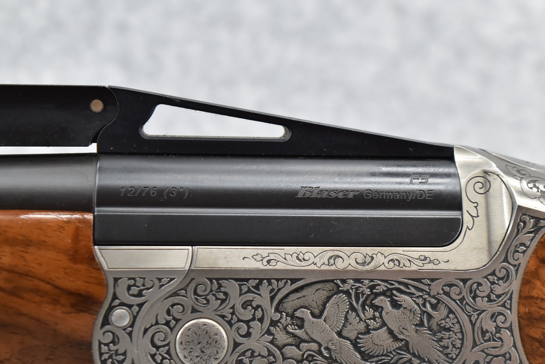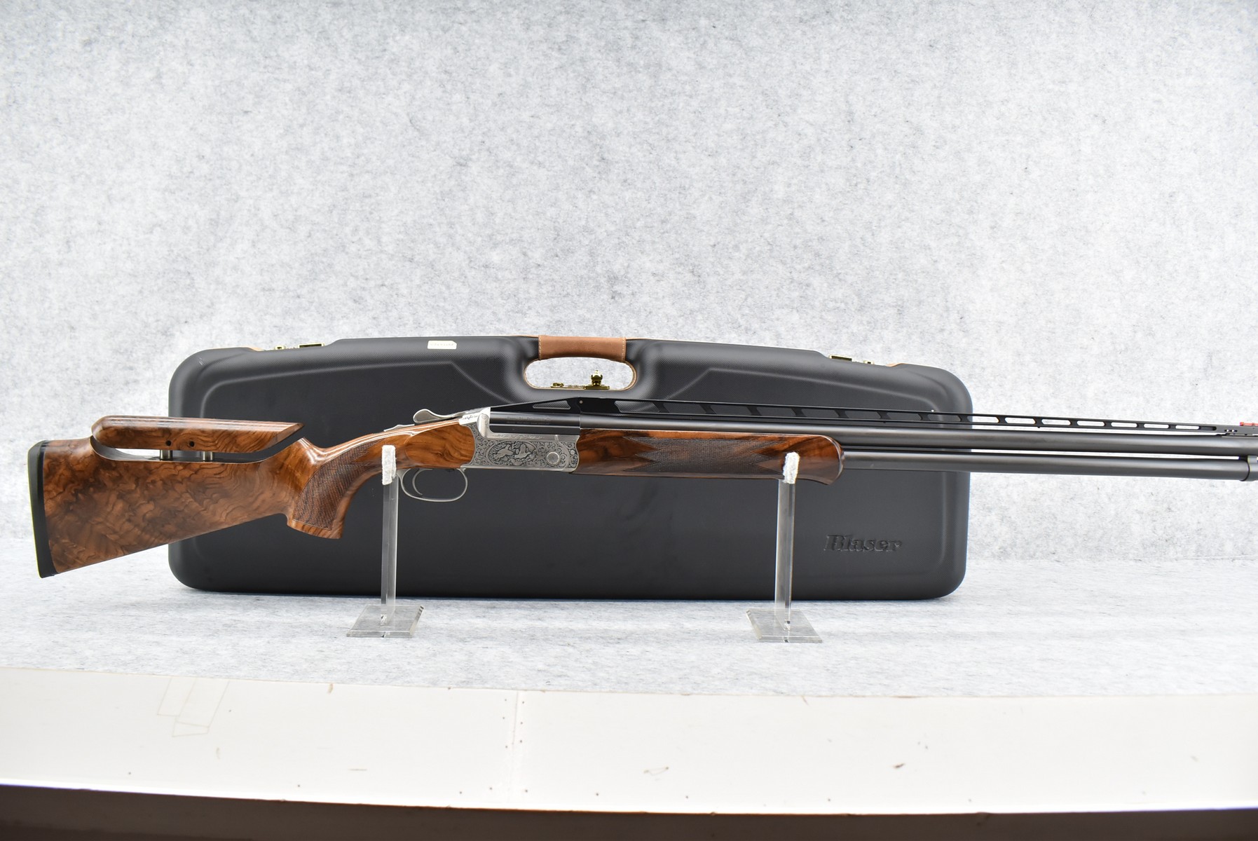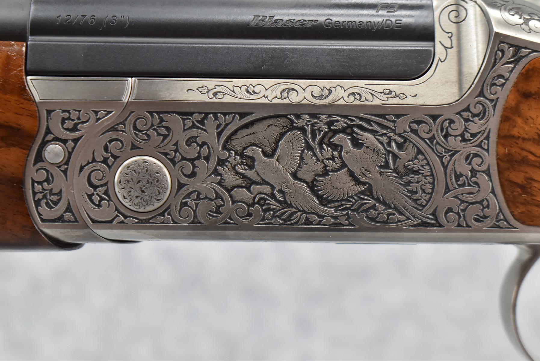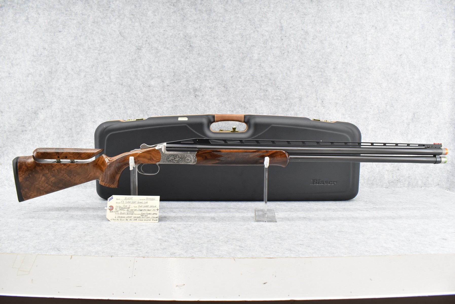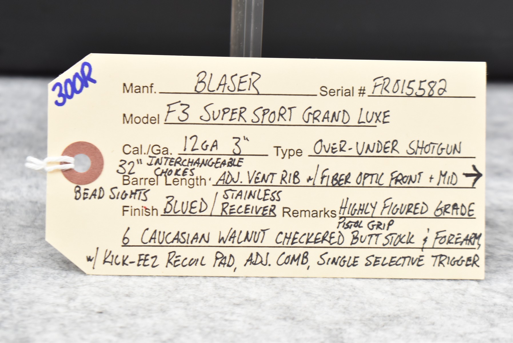 300R. Blaser – Mod. F3 Super Sport Grand Luxe – 12ga 3” Over-Under Shotgun – w/32’ Interchangeable Chokes, Adj. Vent-Rib Barrels w/Fiber Optic Front & Mid Bead Sights – Blued Finish w/Stainless Receiver – Receiver is Highly Relief Engraved on Both Sides w/Scroll Work, Partridges & Pheasants – w/Highly Figured Grade 6 Caucasian Walnut Checkered Pistol Grip Butt Stocks w/Kick-EEZ Recoil Pad w/Adj. Comb – w/Single Selective Trigger – Gun Comes w/A Total of 5 Briley Chokes Including the 2 Currently in the Gun (SK & TC) & 3 Extra Including Light Mod., Imp. Mod. & Mod. – w/Factory Takedown Case, Manual, Fiber Optic Sight Replacements, Tooling & Barrel Balancers – Great Set Up!! A Must See!
