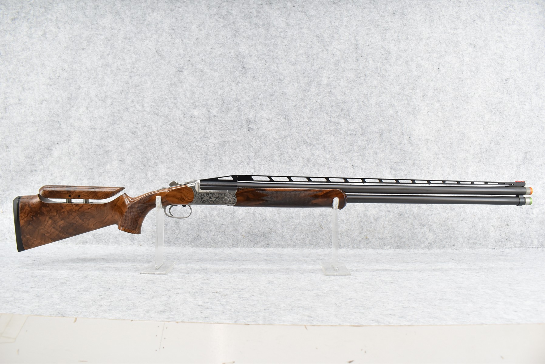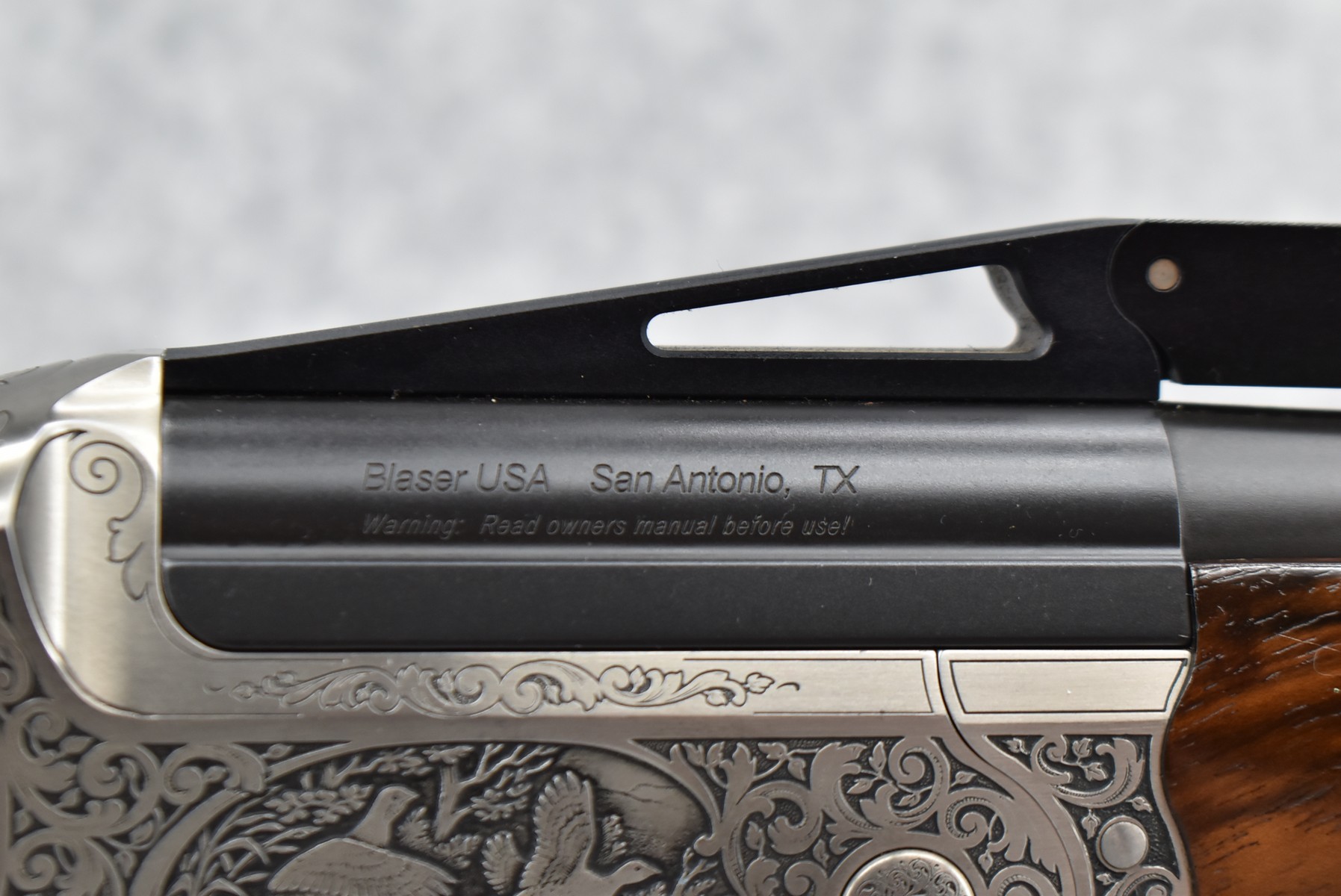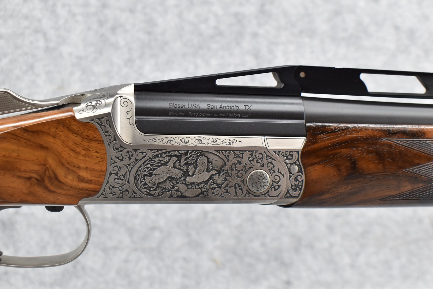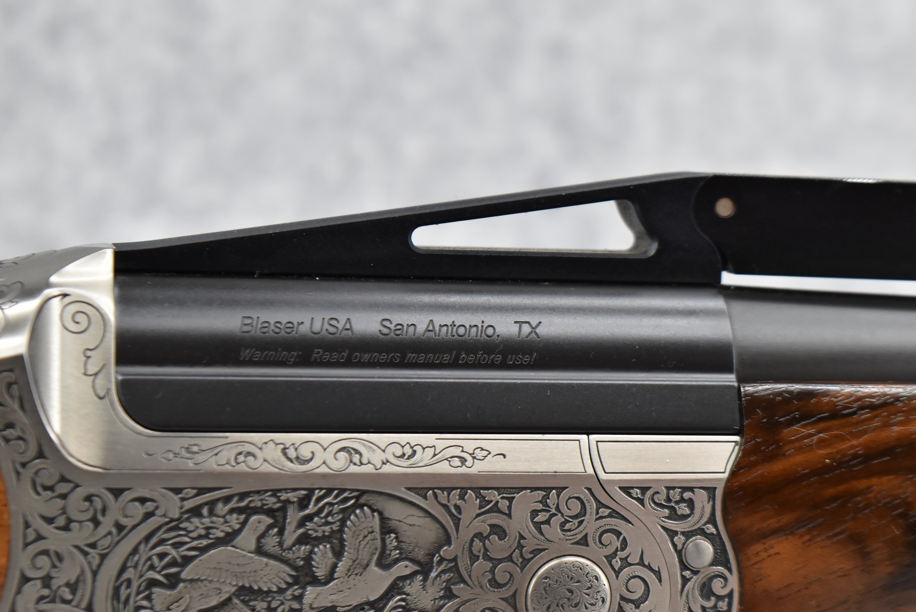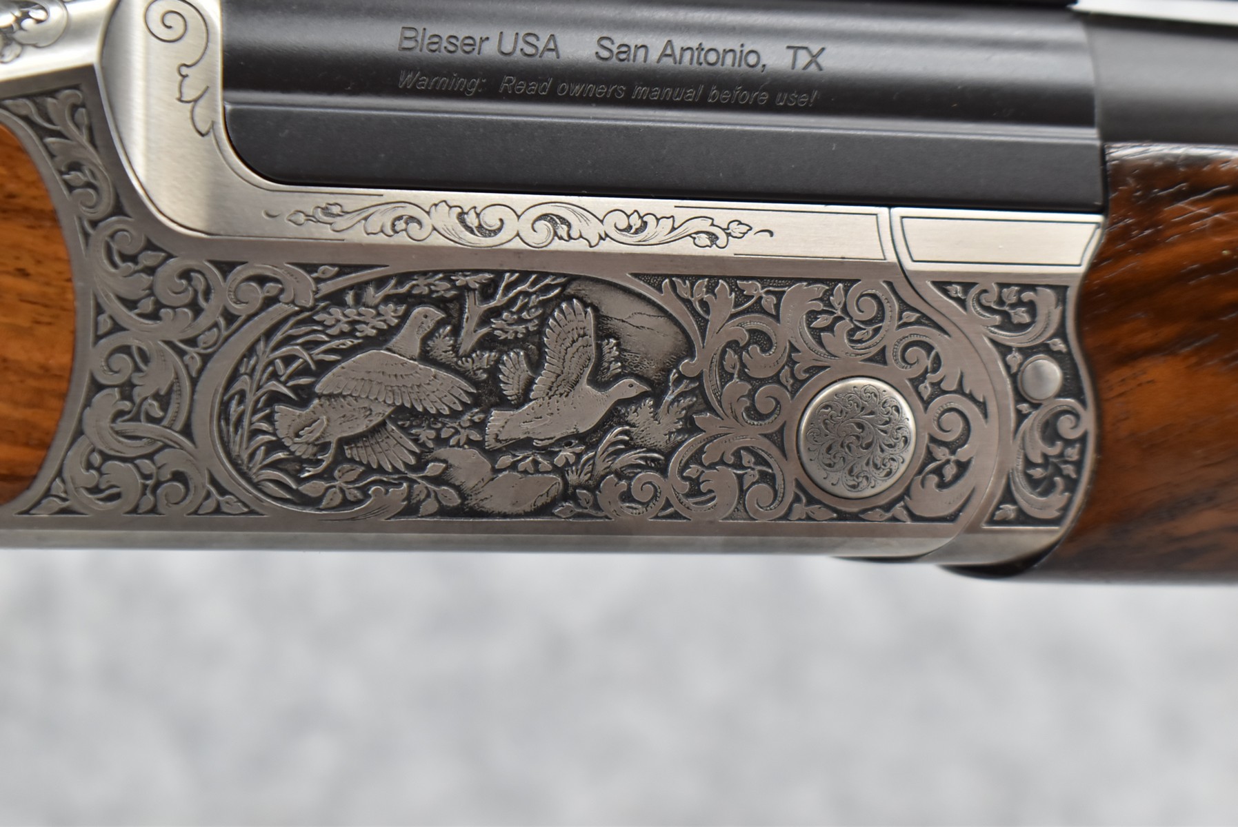 300R. Blaser – Mod. F3 Super Sport Grand Luxe – 12ga 3” Over-Under Shotgun – w/32’ Interchangeable Chokes, Adj. Vent-Rib Barrels w/Fiber Optic Front & Mid Bead Sights – Blued Finish w/Stainless Receiver – Receiver is Highly Relief Engraved on Both Sides w/Scroll Work, Partridges & Pheasants – w/Highly Figured Grade 6 Caucasian Walnut Checkered Pistol Grip Butt Stocks w/Kick-EEZ Recoil Pad w/Adj. Comb – w/Single Selective Trigger – Gun Comes w/A Total of 5 Briley Chokes Including the 2 Currently in the Gun (SK & TC) & 3 Extra Including Light Mod., Imp. Mod. & Mod. – w/Factory Takedown Case, Manual, Fiber Optic Sight Replacements, Tooling & Barrel Balancers – Great Set Up!! A Must See!