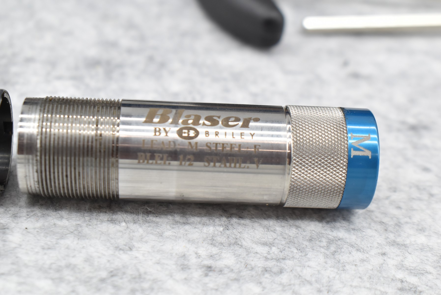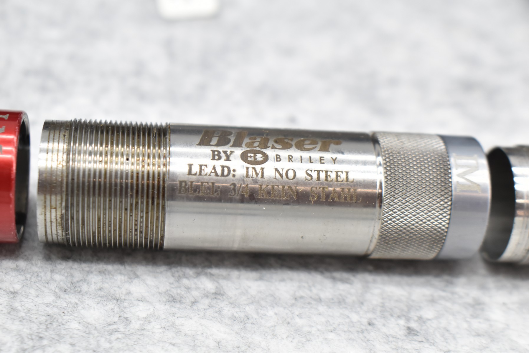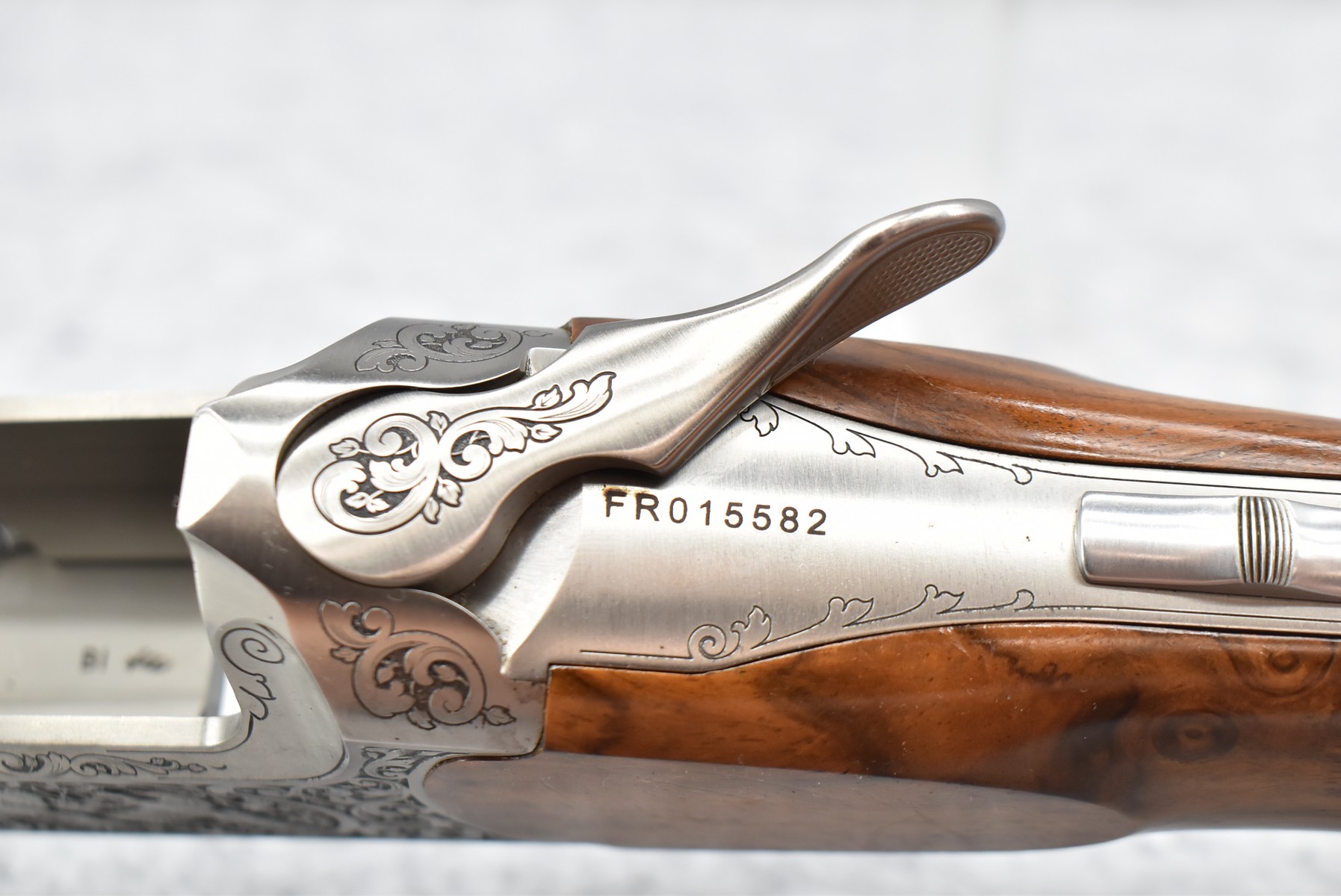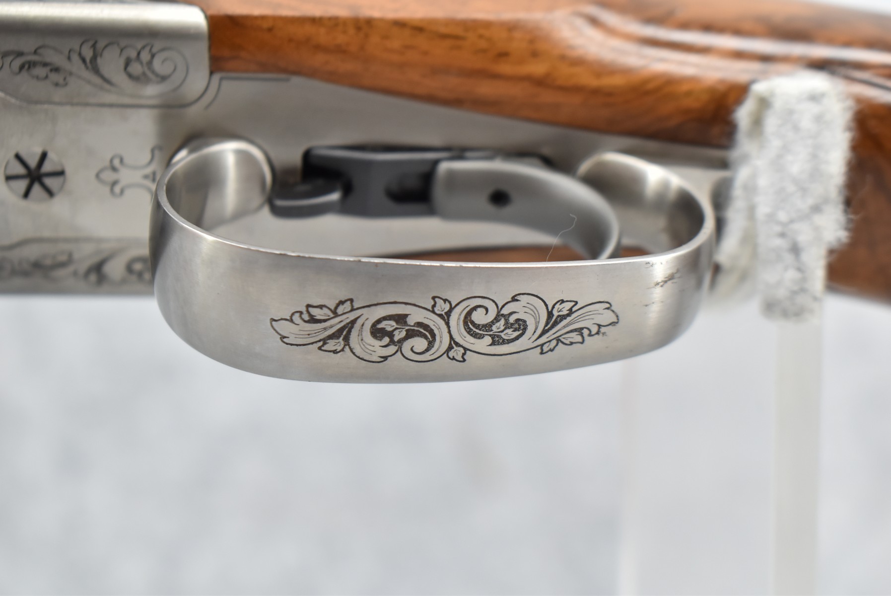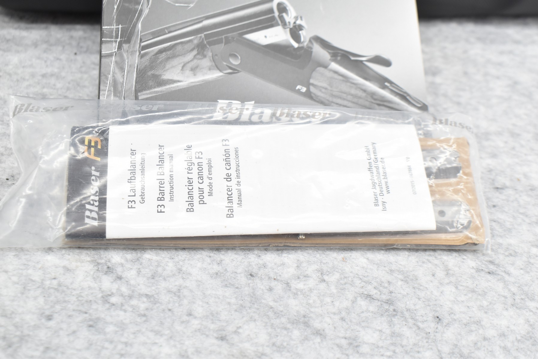 300R. Blaser – Mod. F3 Super Sport Grand Luxe – 12ga 3” Over-Under Shotgun – w/32’ Interchangeable Chokes, Adj. Vent-Rib Barrels w/Fiber Optic Front & Mid Bead Sights – Blued Finish w/Stainless Receiver – Receiver is Highly Relief Engraved on Both Sides w/Scroll Work, Partridges & Pheasants – w/Highly Figured Grade 6 Caucasian Walnut Checkered Pistol Grip Butt Stocks w/Kick-EEZ Recoil Pad w/Adj. Comb – w/Single Selective Trigger – Gun Comes w/A Total of 5 Briley Chokes Including the 2 Currently in the Gun (SK & TC) & 3 Extra Including Light Mod., Imp. Mod. & Mod. – w/Factory Takedown Case, Manual, Fiber Optic Sight Replacements, Tooling & Barrel Balancers – Great Set Up!! A Must See!