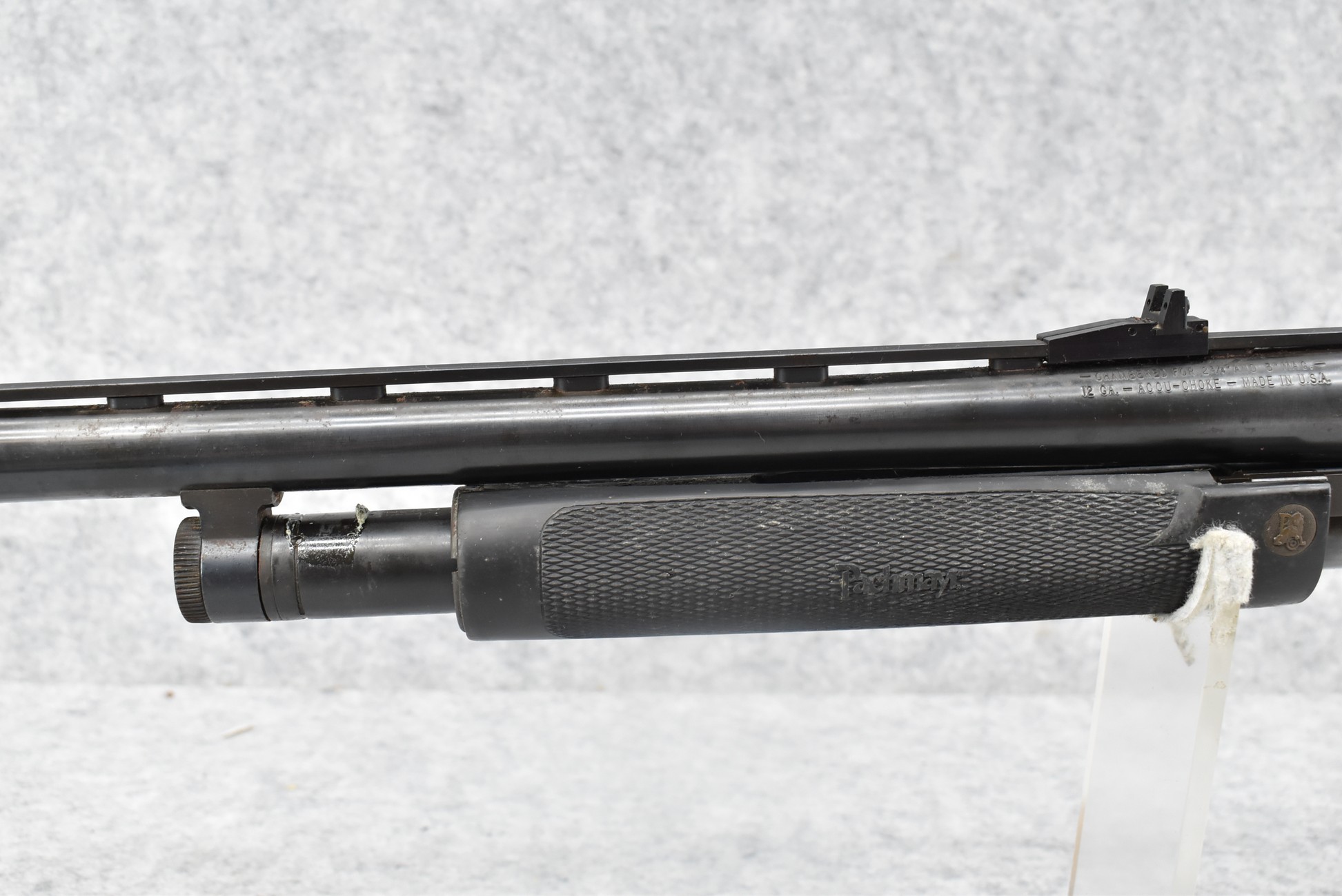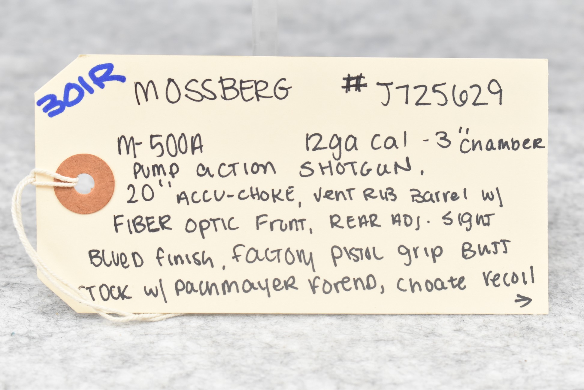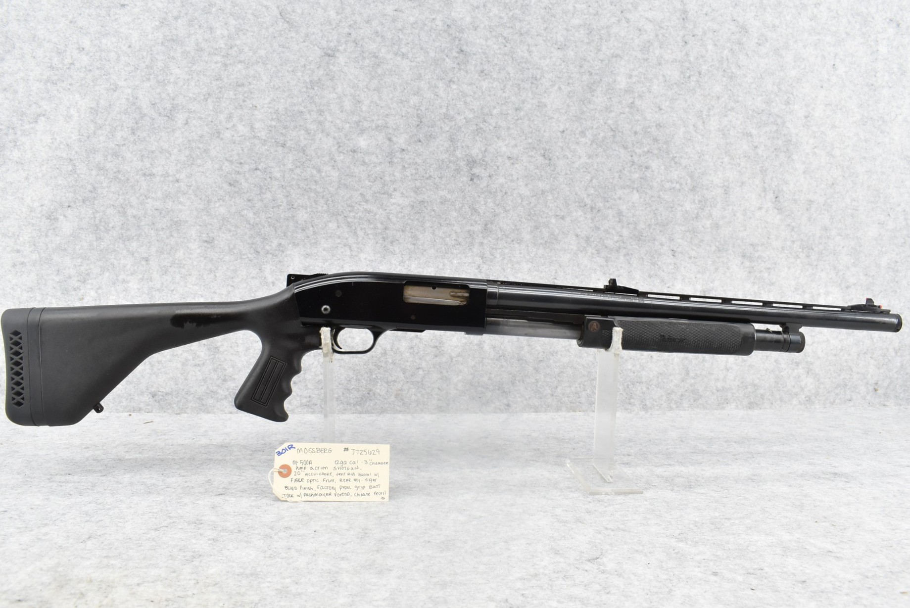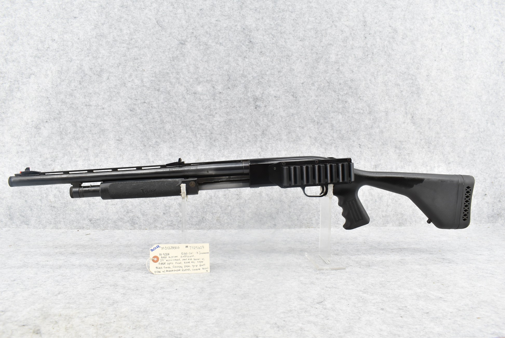 301R. Mossberg – Mod. 500A – 12ga. 3” Pump Action Shotgun – w/20” Accu-Choke, Vent-Rib Barrel w/Fiber Optic Front & Rear Adj. Sights – Blued Finish – w/Synthetic Pistol Grip Butt Stock w/Choate Recoil Pad & Pachmayr Forend – w/Shell Holder on Left Side of Receiver