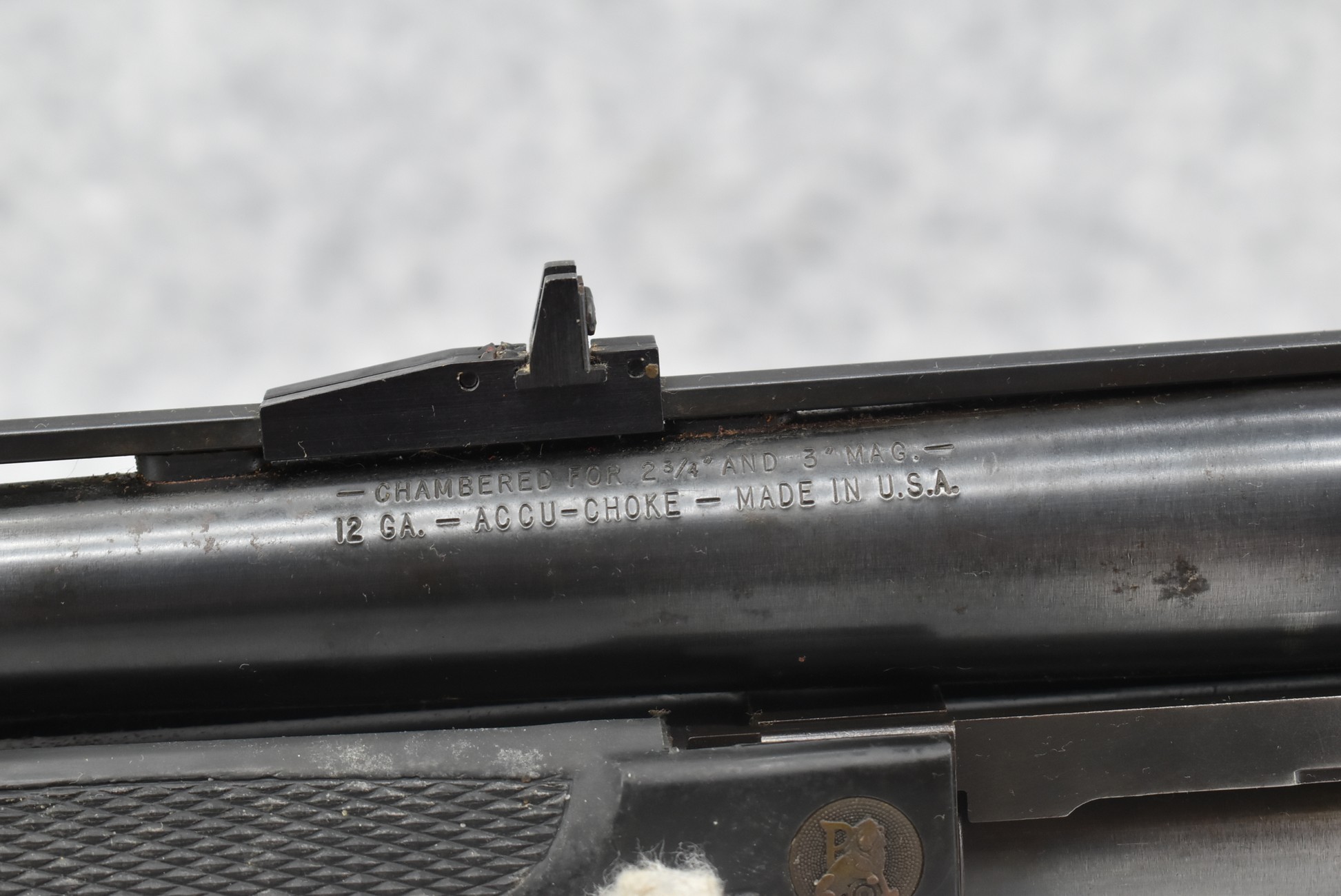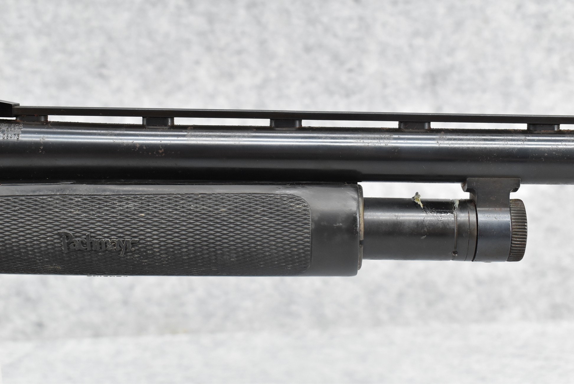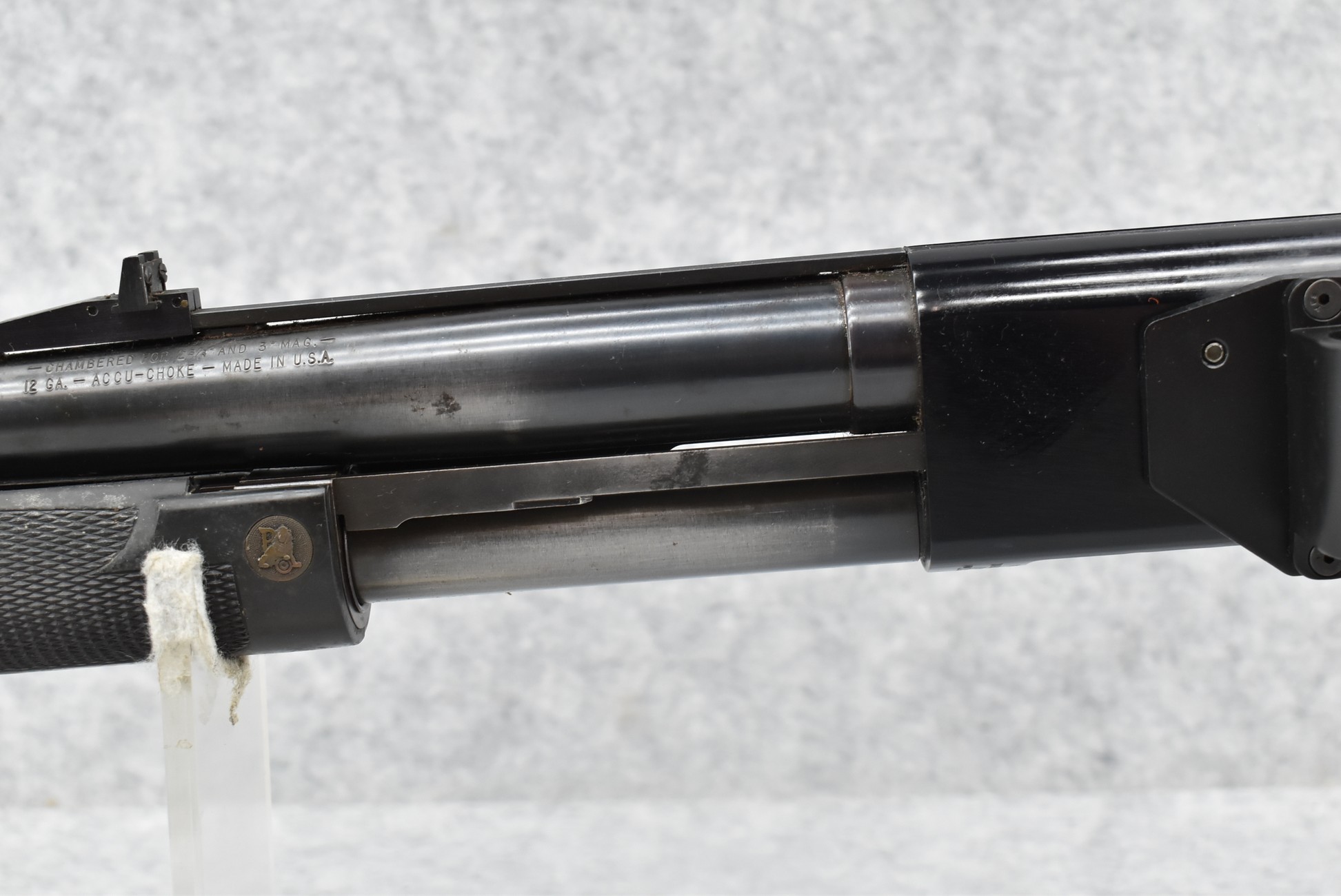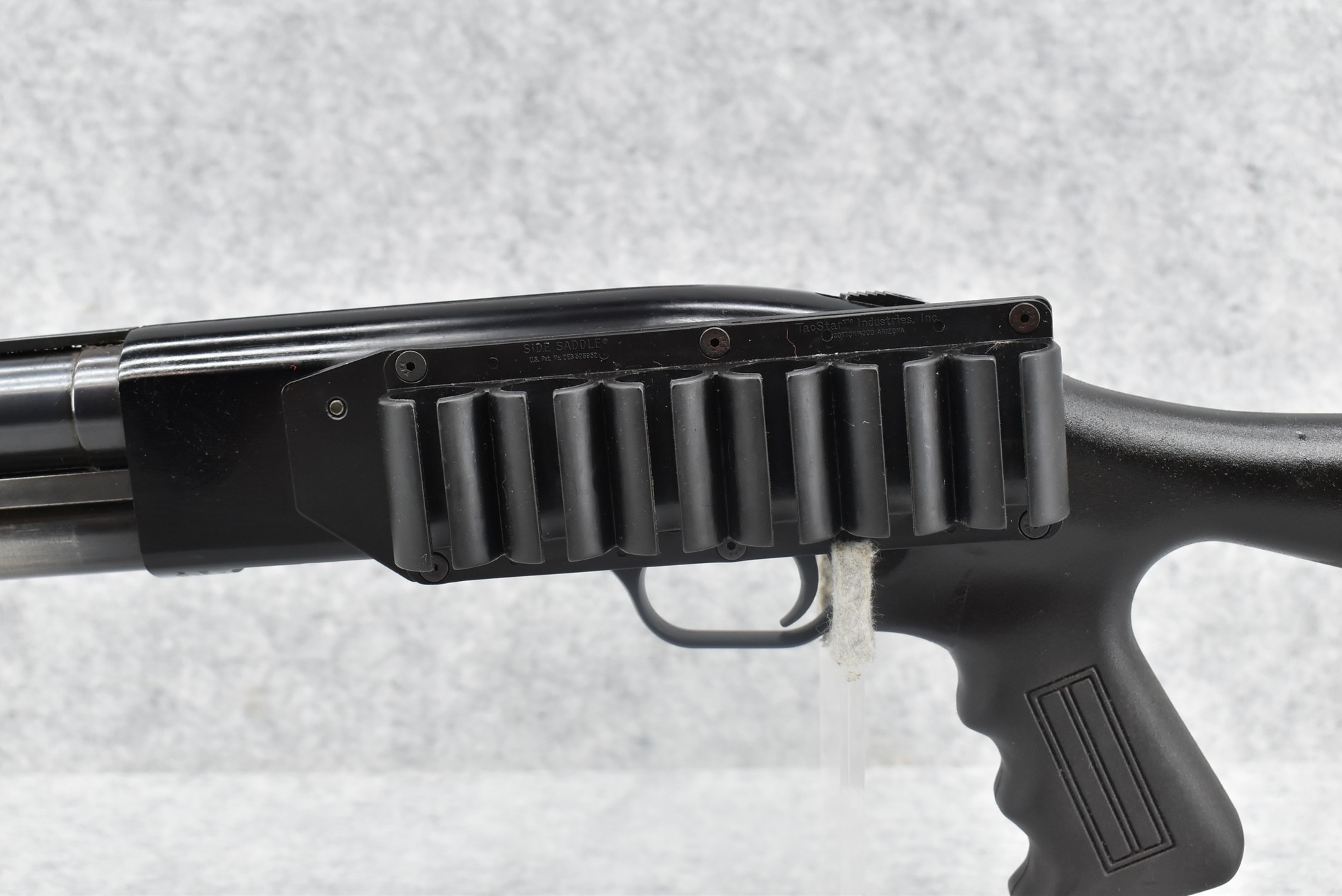 301R. Mossberg – Mod. 500A – 12ga. 3” Pump Action Shotgun – w/20” Accu-Choke, Vent-Rib Barrel w/Fiber Optic Front & Rear Adj. Sights – Blued Finish – w/Synthetic Pistol Grip Butt Stock w/Choate Recoil Pad & Pachmayr Forend – w/Shell Holder on Left Side of Receiver