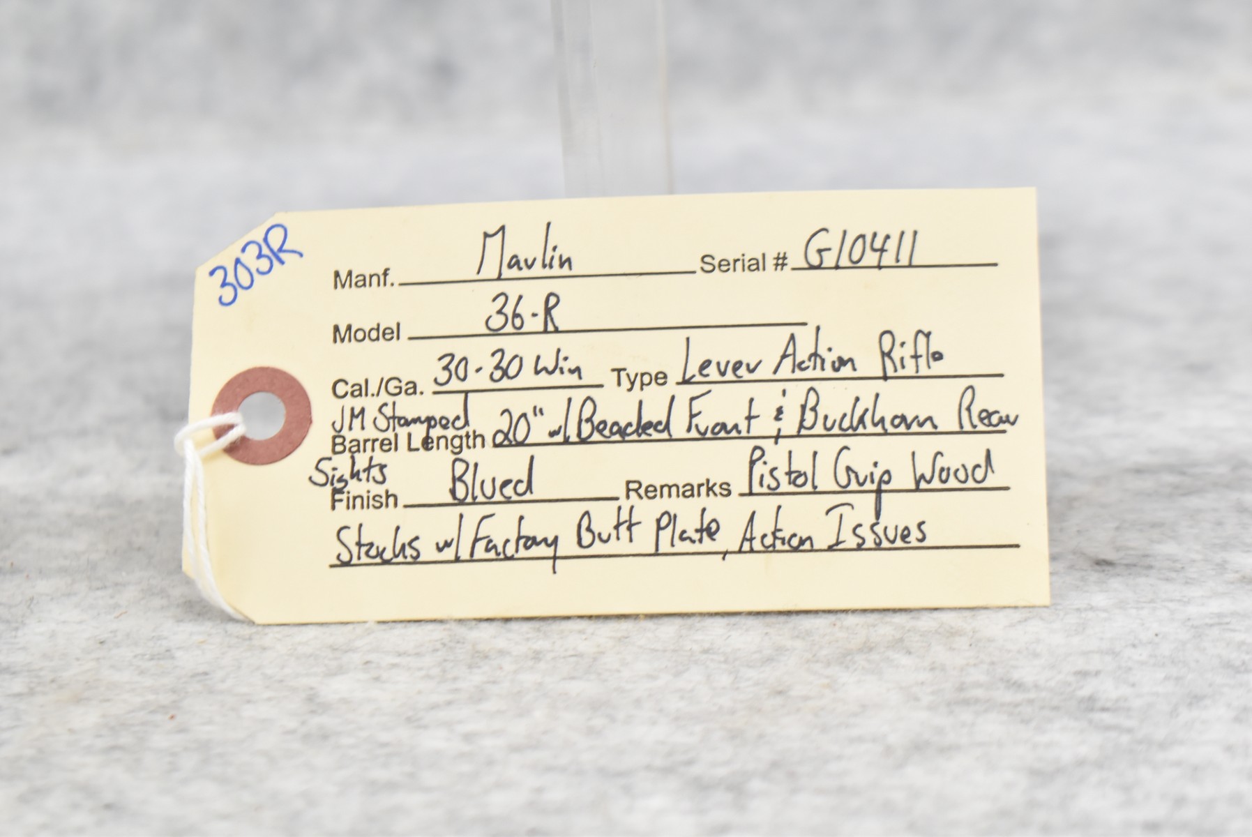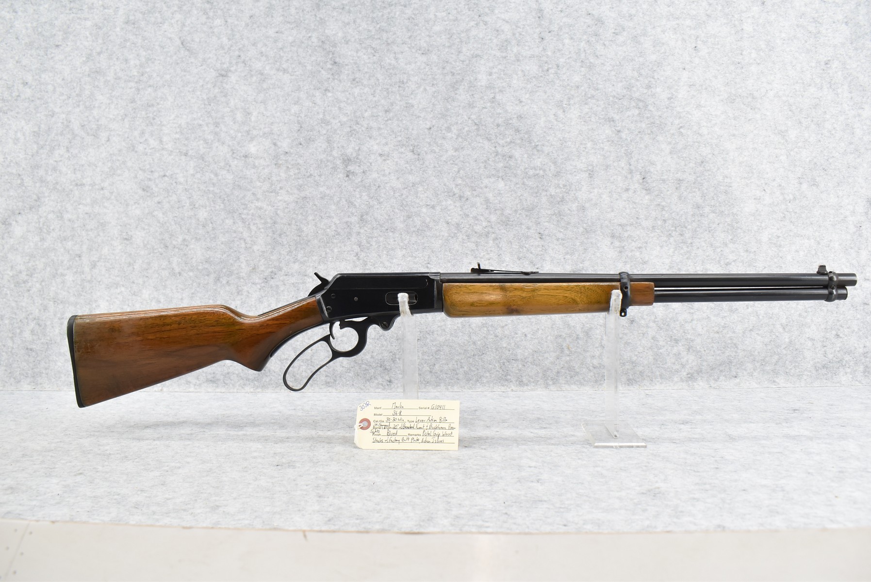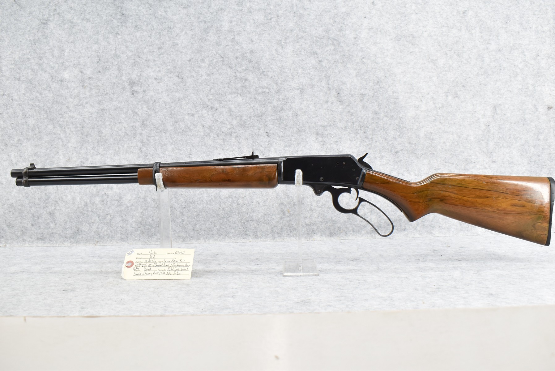 303R. Marlin – Mod. 36-R – 30-30 Win. Cal. Lever Action Rifle – w/20” JM Stamped Barrel w/Beaded Front & Buckhorn Rear Sights – Blued Finish – w/Pistol Grip Wood Stocks w/Factory Butt Plate – Note: Action Issues
