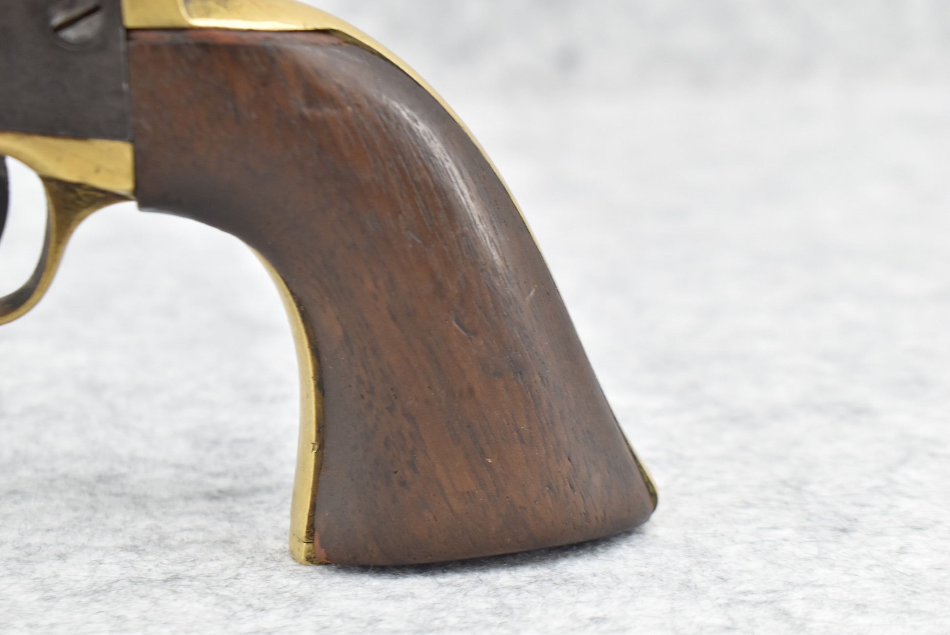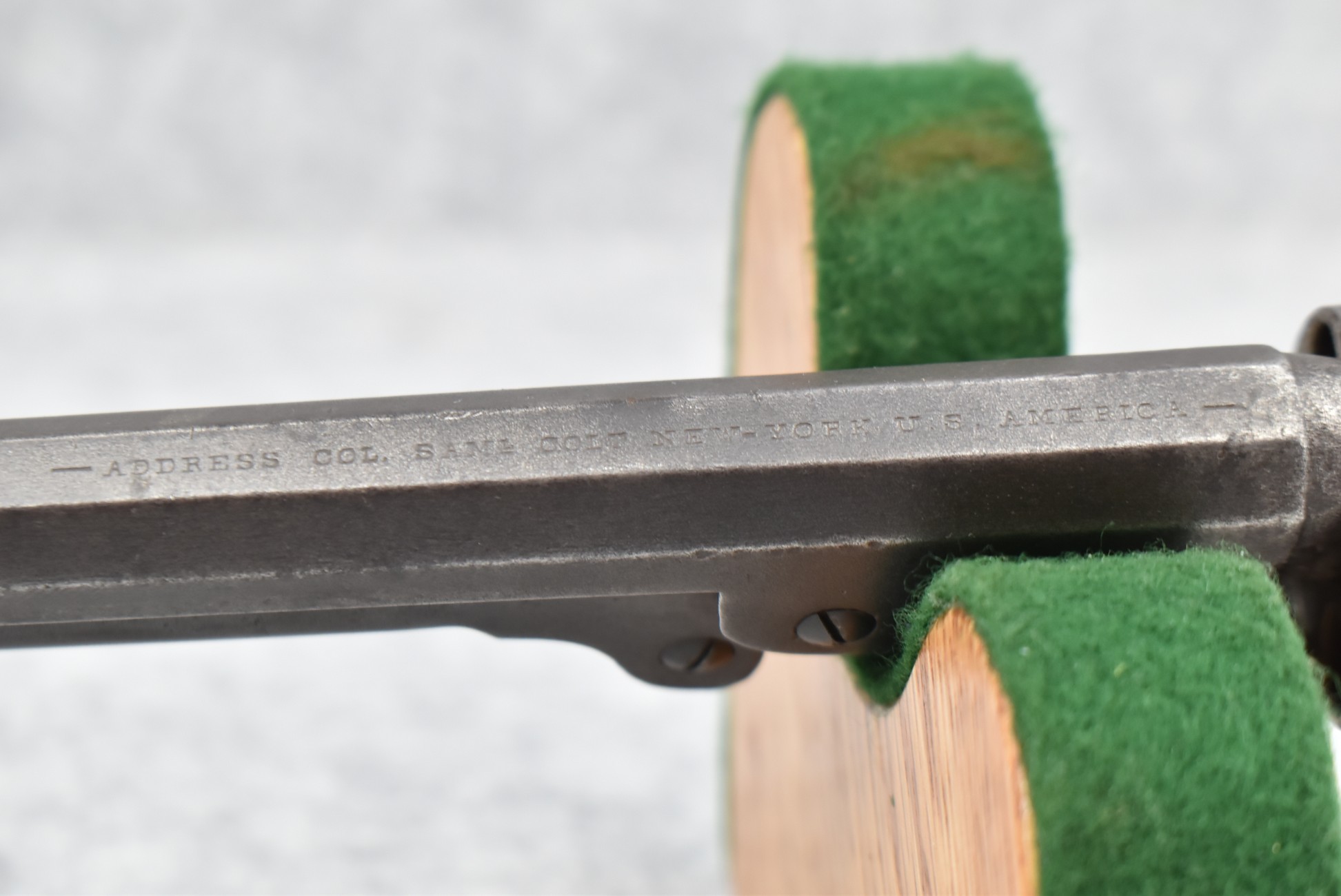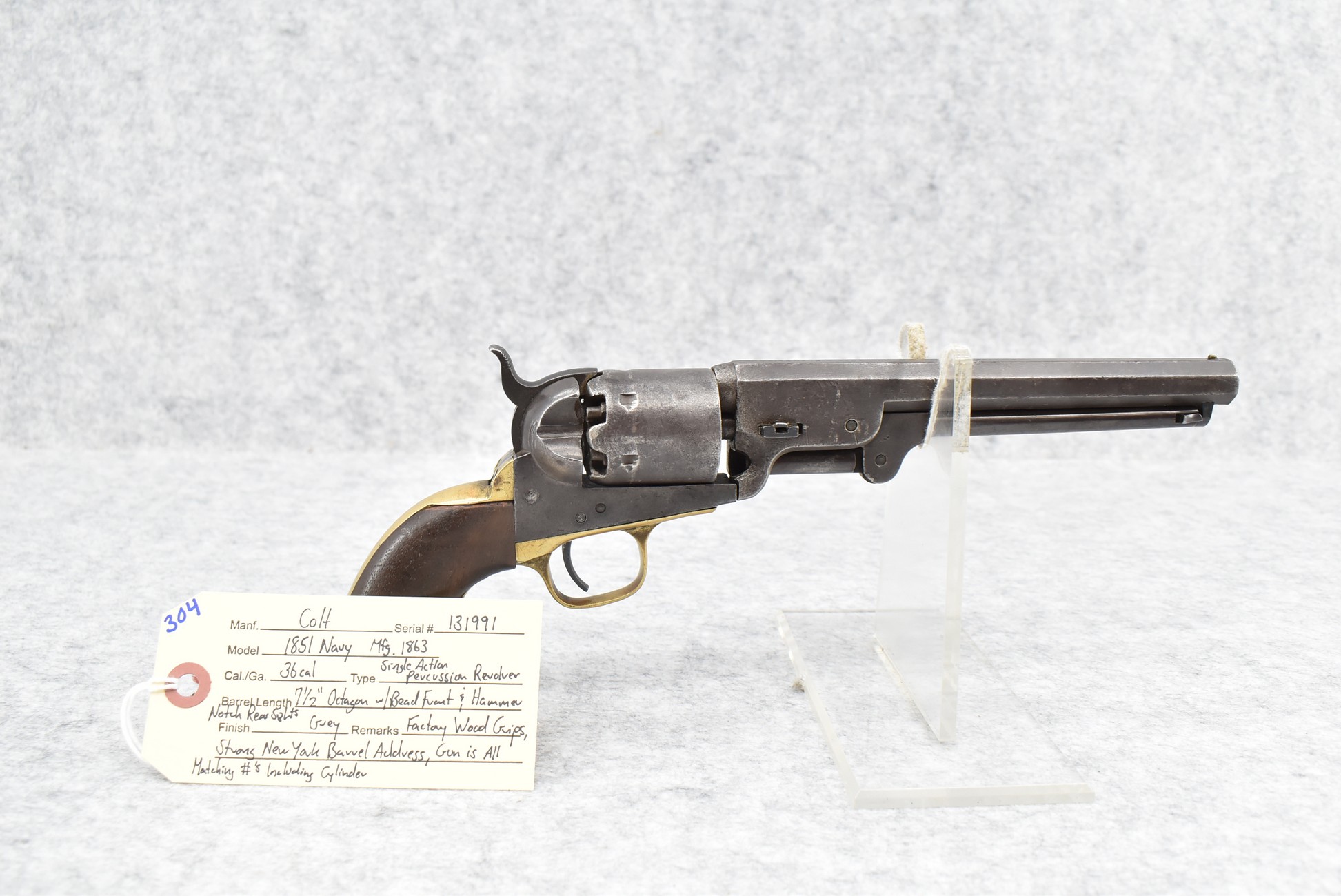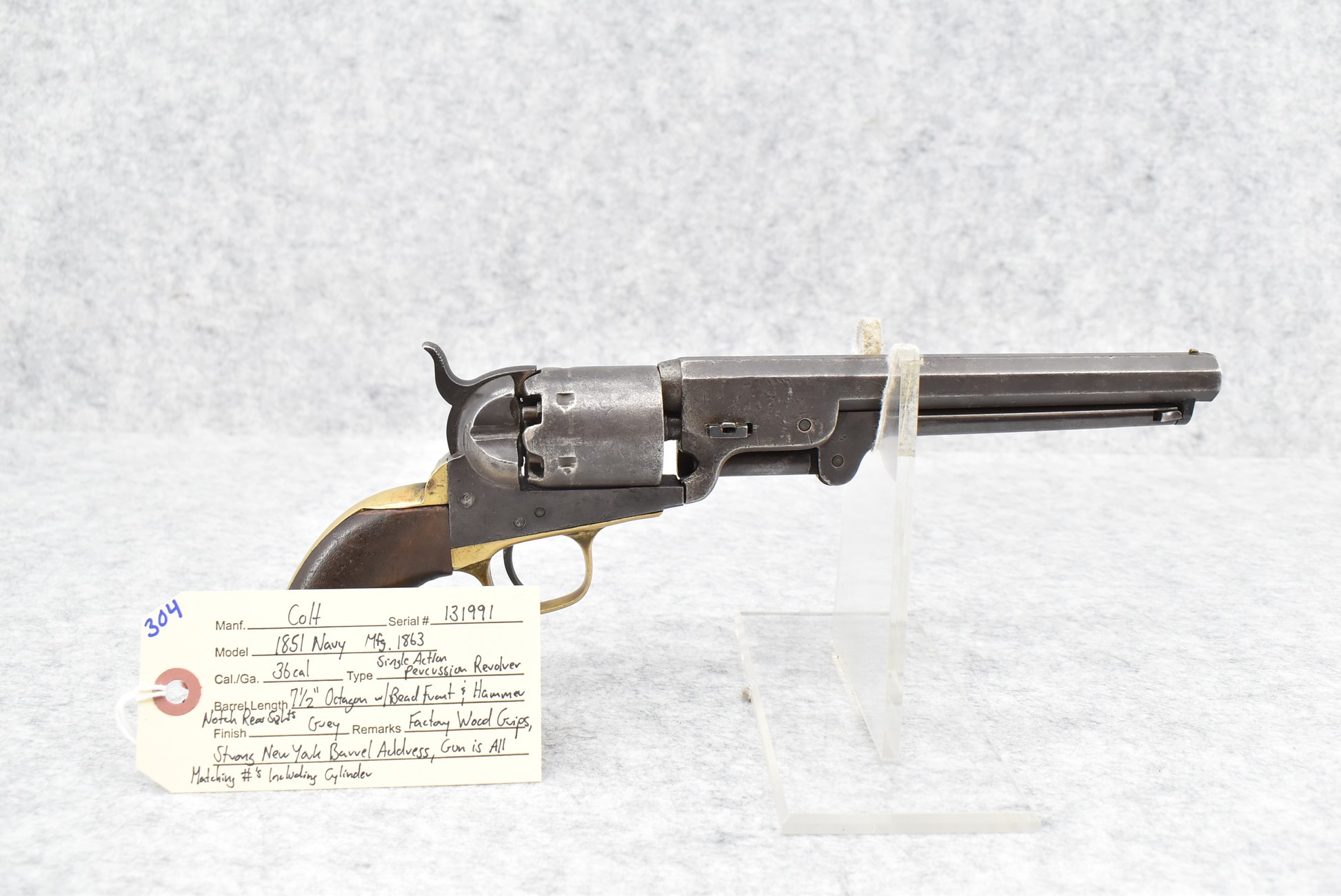 304. Colt – Mod. 1851 Navy – 36 Cal. Percussion Single Action Revolver – w/7 ½” Octagon Barrel w/Bead Front & Hammer Notch Rear Sights – Gray Finish – w/Factory Wood Grips – w/Strong New York Barrel Address – Gun is All Matching Numbers Including the Cylinder – Mfg. 1863