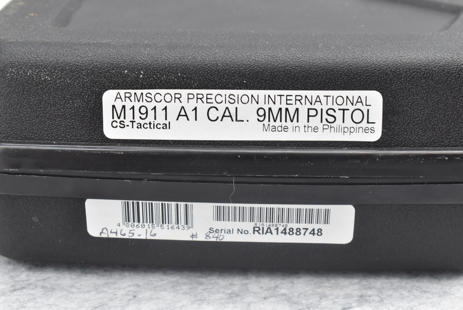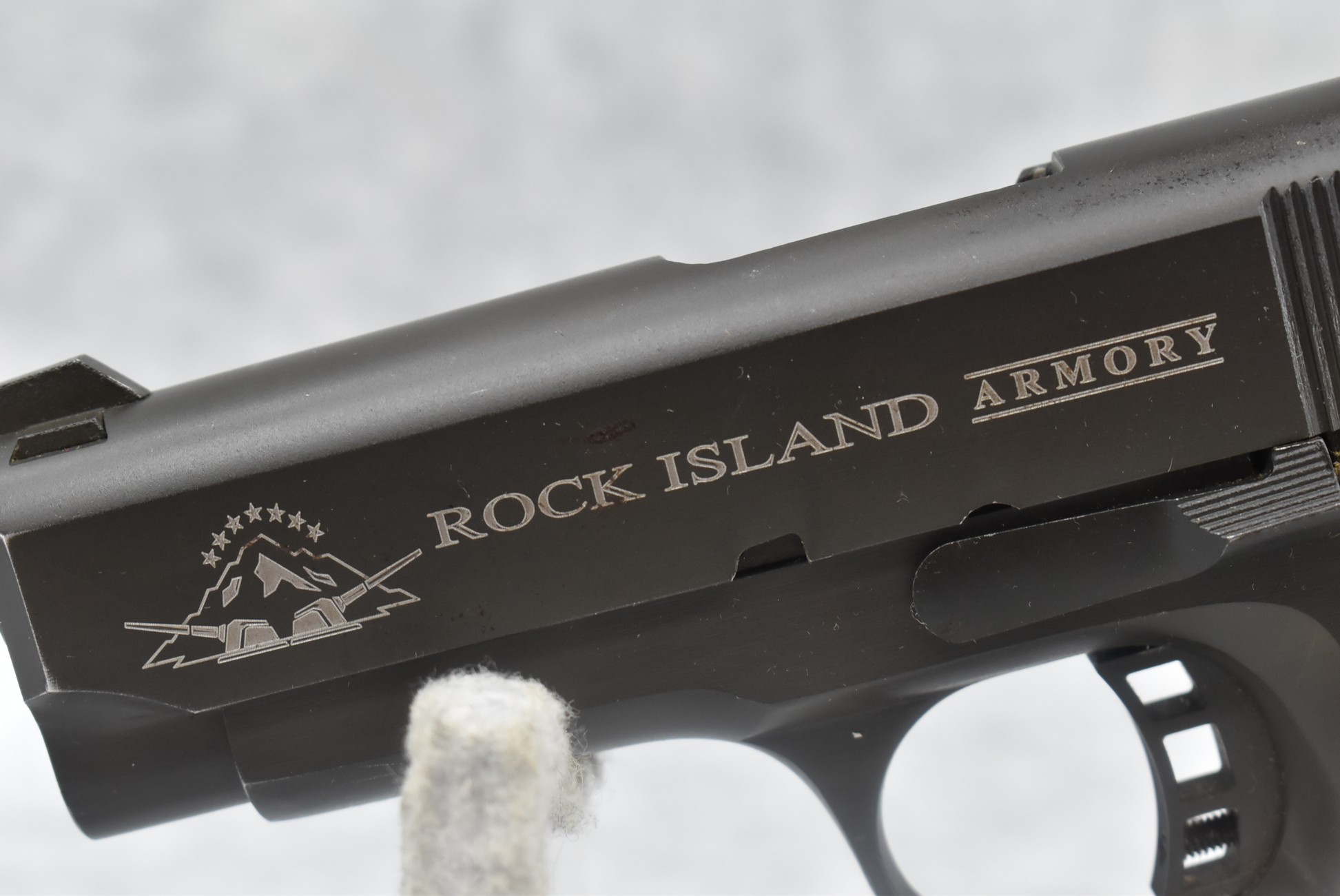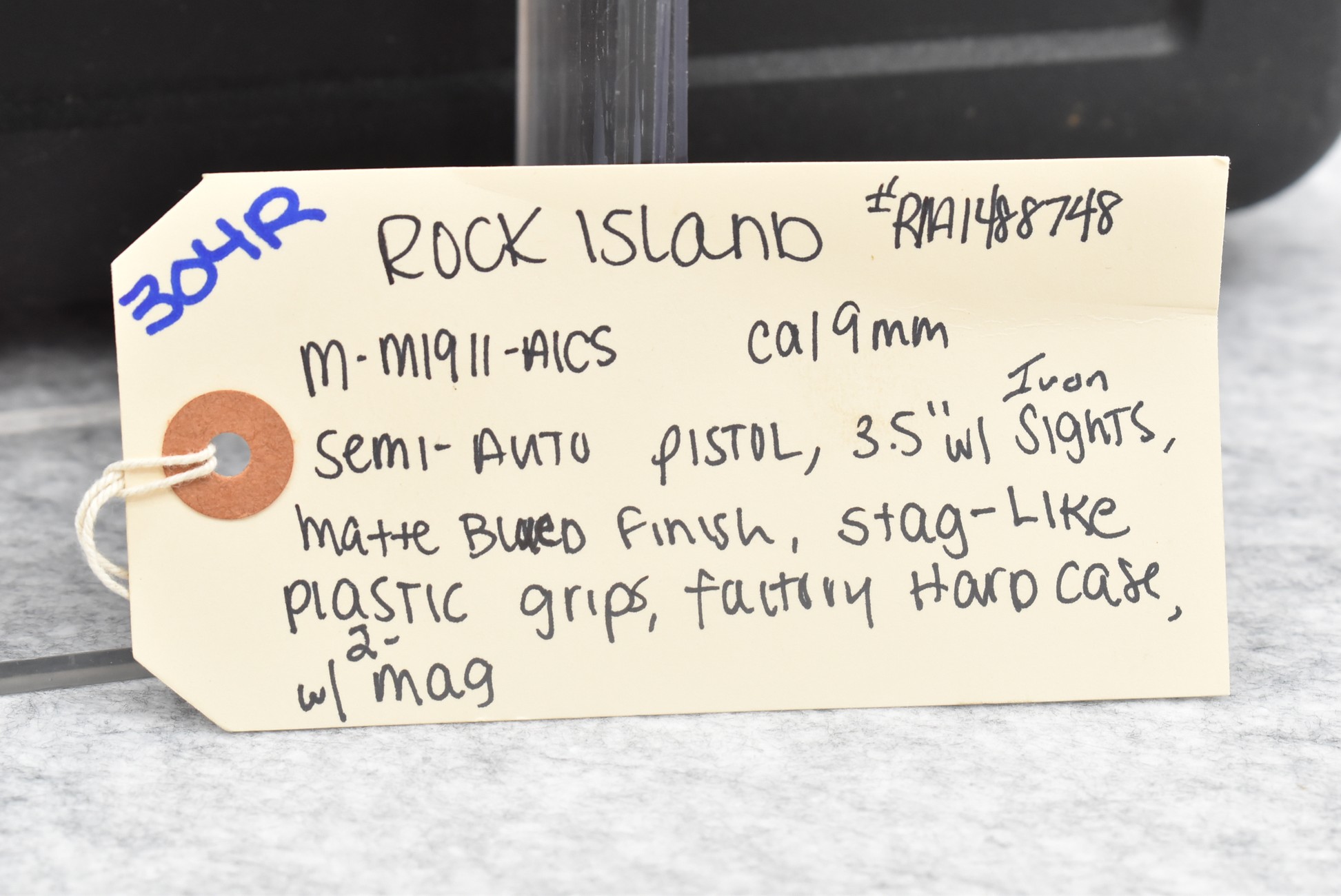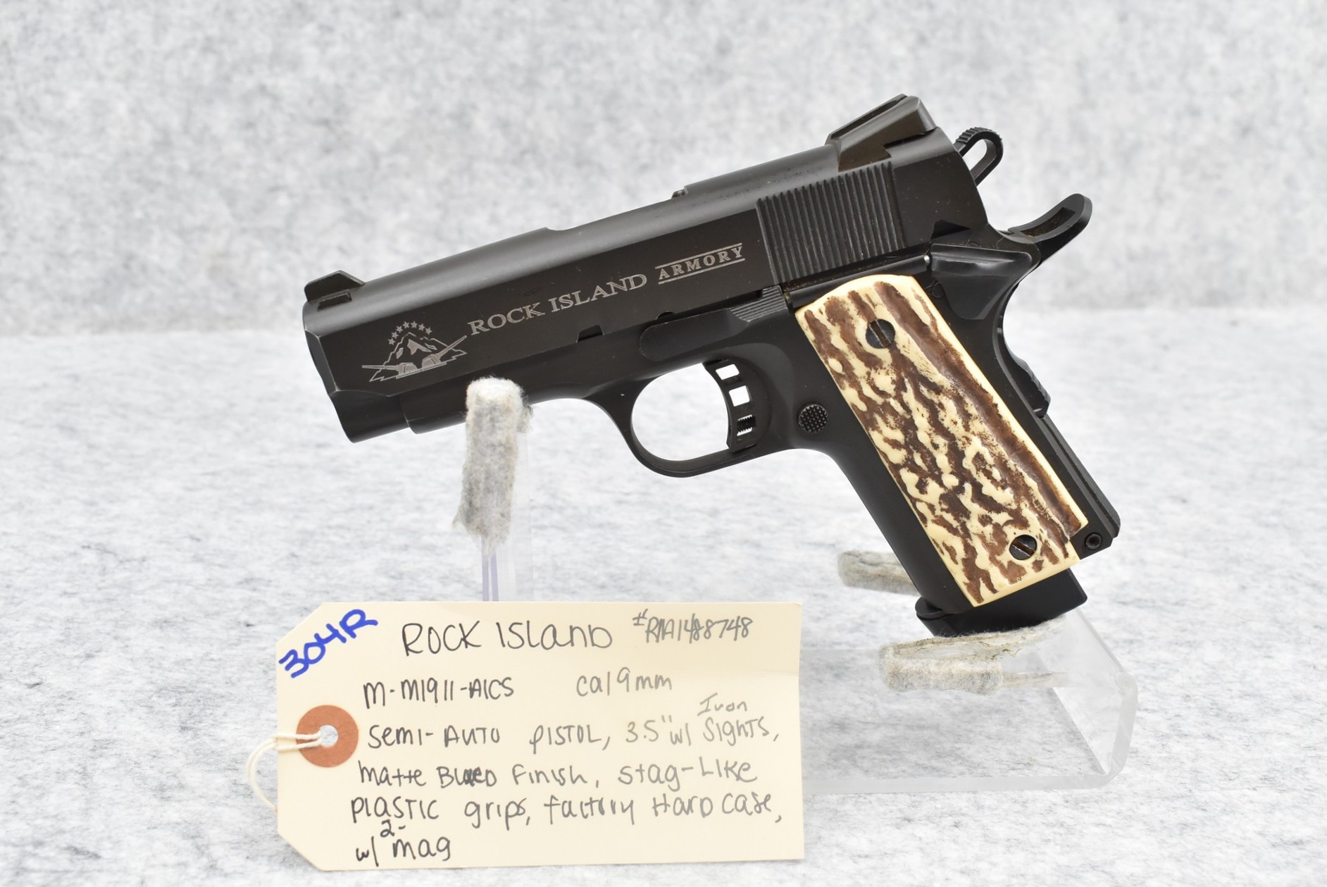 304R. Rock Island – Mod. M1911-A1CS – 9mm Cal. Semi-Auto Pistol – w/3.5” Barrel w/Iron Sights – Matte Blued Finish – w/Stag-Like Plastic Grips – w/Factory Hard Case & 2 Mags