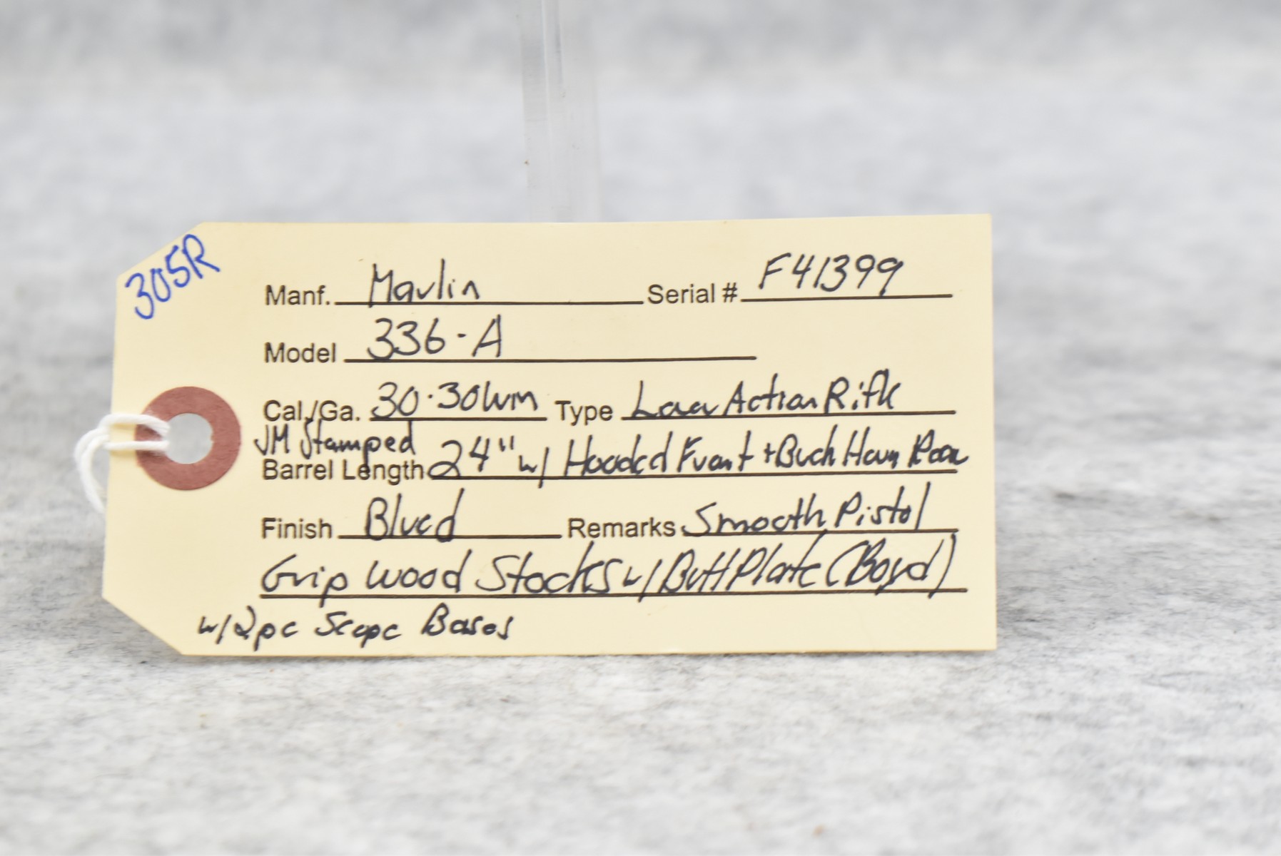 305R. Marlin – Mod. 336-A – 30-30 Win. Cal. Lever Action Rifle – w/24” JM Stamped Barrel w/Hooded Front & Buckhorn Rear Sights – Blued Finish – w/Smooth Pistol Grip Wood Stocks w/Boyd Butt Plate – w/2pc. Scope Bases