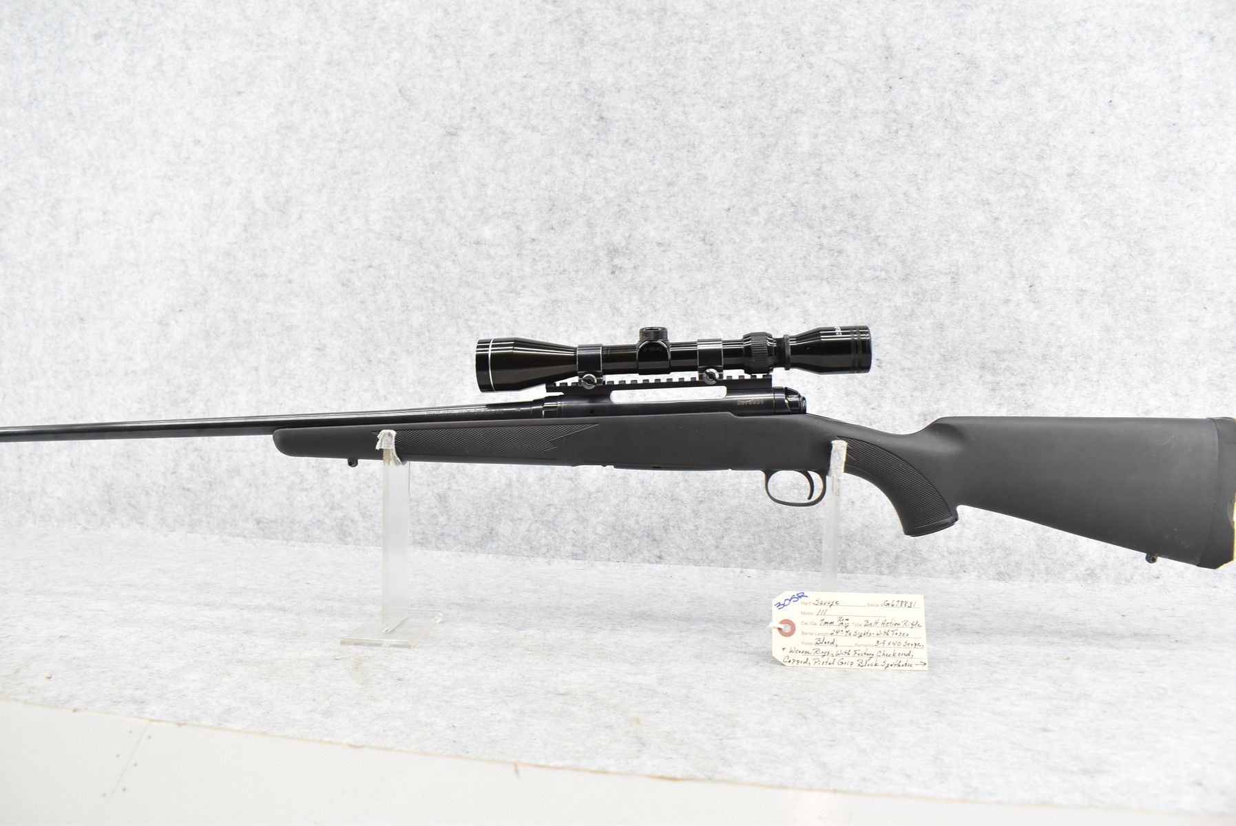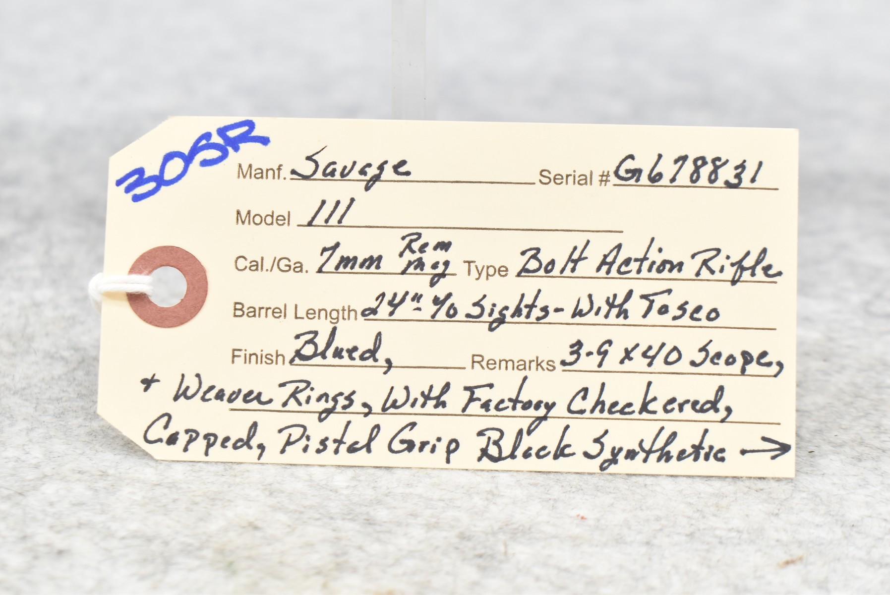 305R. Savage – Mod. 111 – 7mm Rem. Mag. Cal. Bolt Action Rifle – w/24” Barrel (No Sights) – Blued Finish – w/Factory Checkered Capped Pistol Grip Black Synthetic Stock w/Butt Pad – w/Factory Detachable Magazine – w/Tasco 3-9×40 Scope – w/Weaver Rings