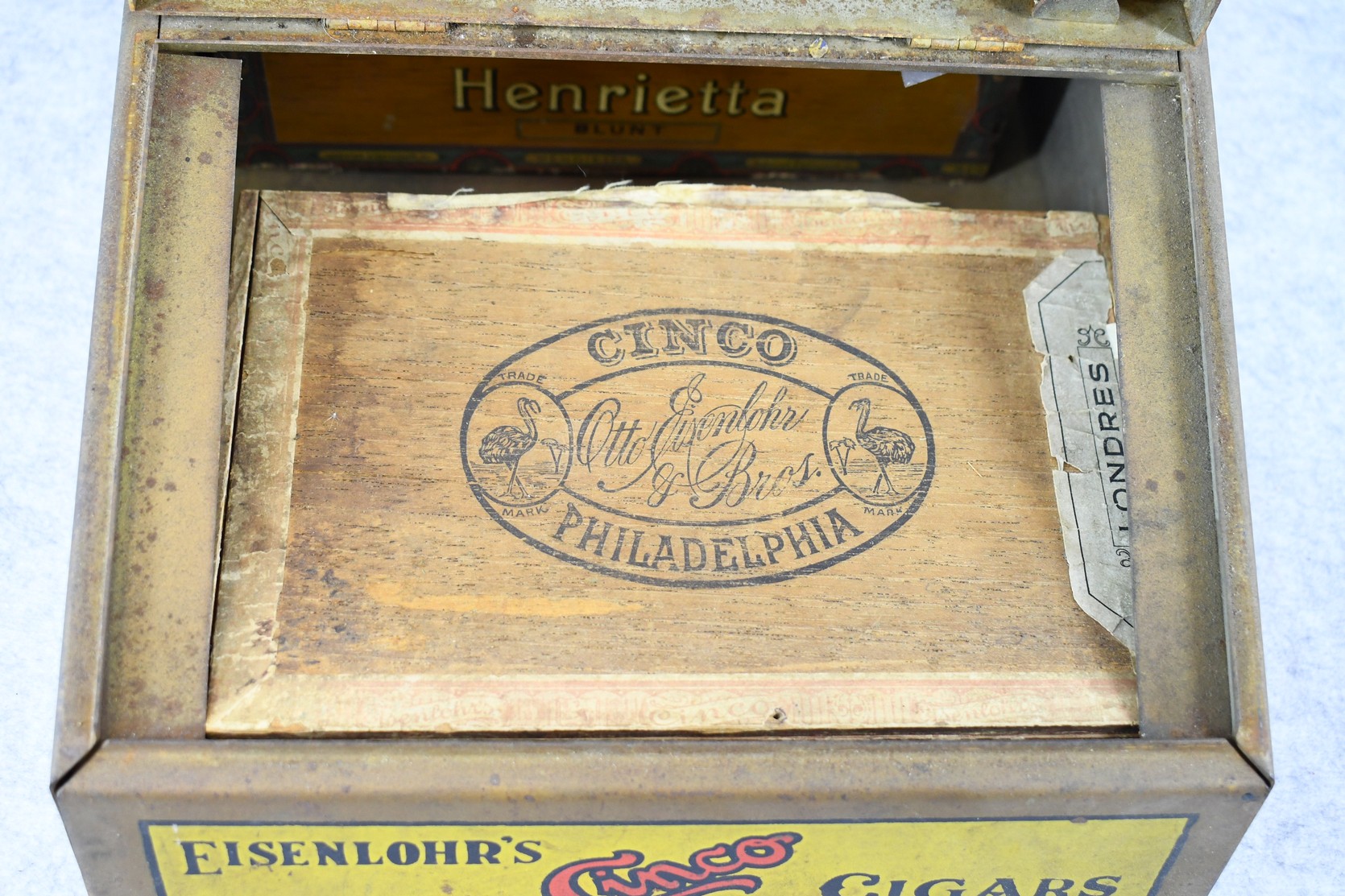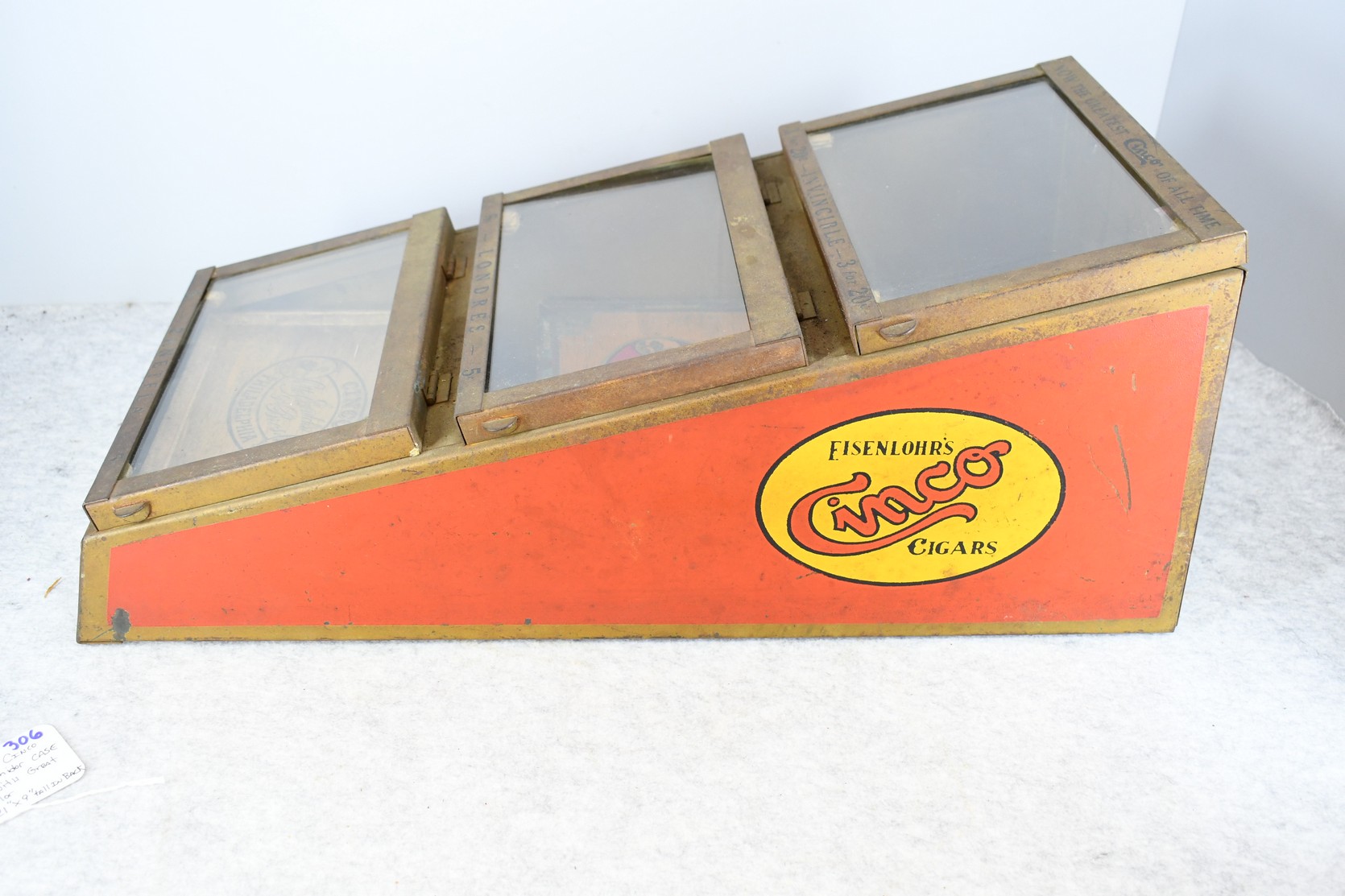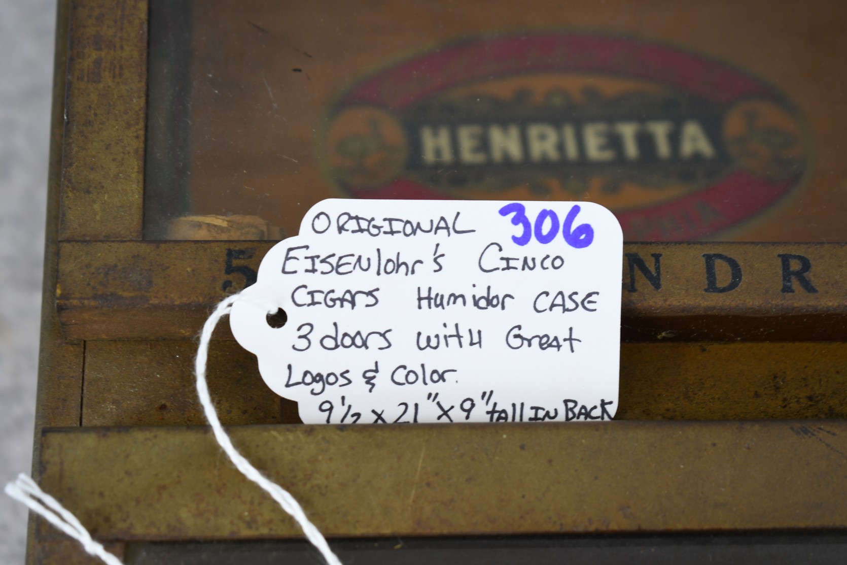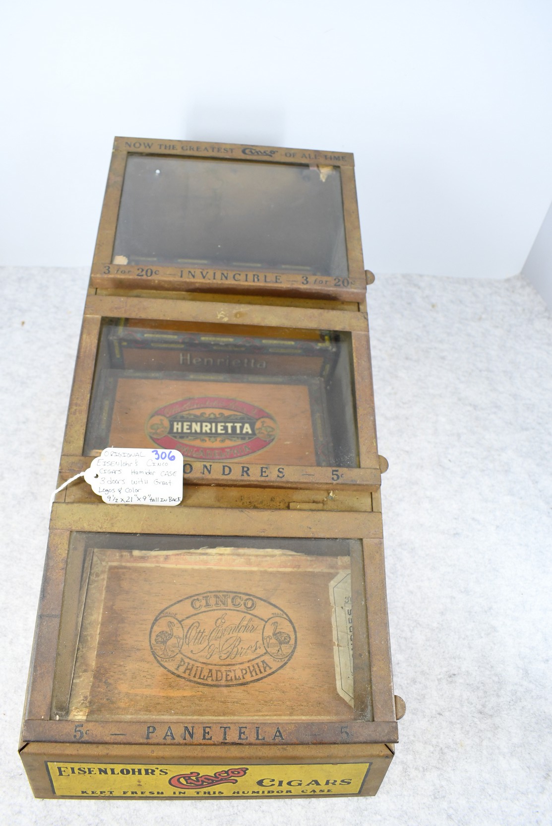 306. Original Eisenlohr’s Cinco Cigars Store Advertising Display Humidor Case – Display Shows Three Different Cigar Types – Item has 3 Great Color Logo’s – Unique item.