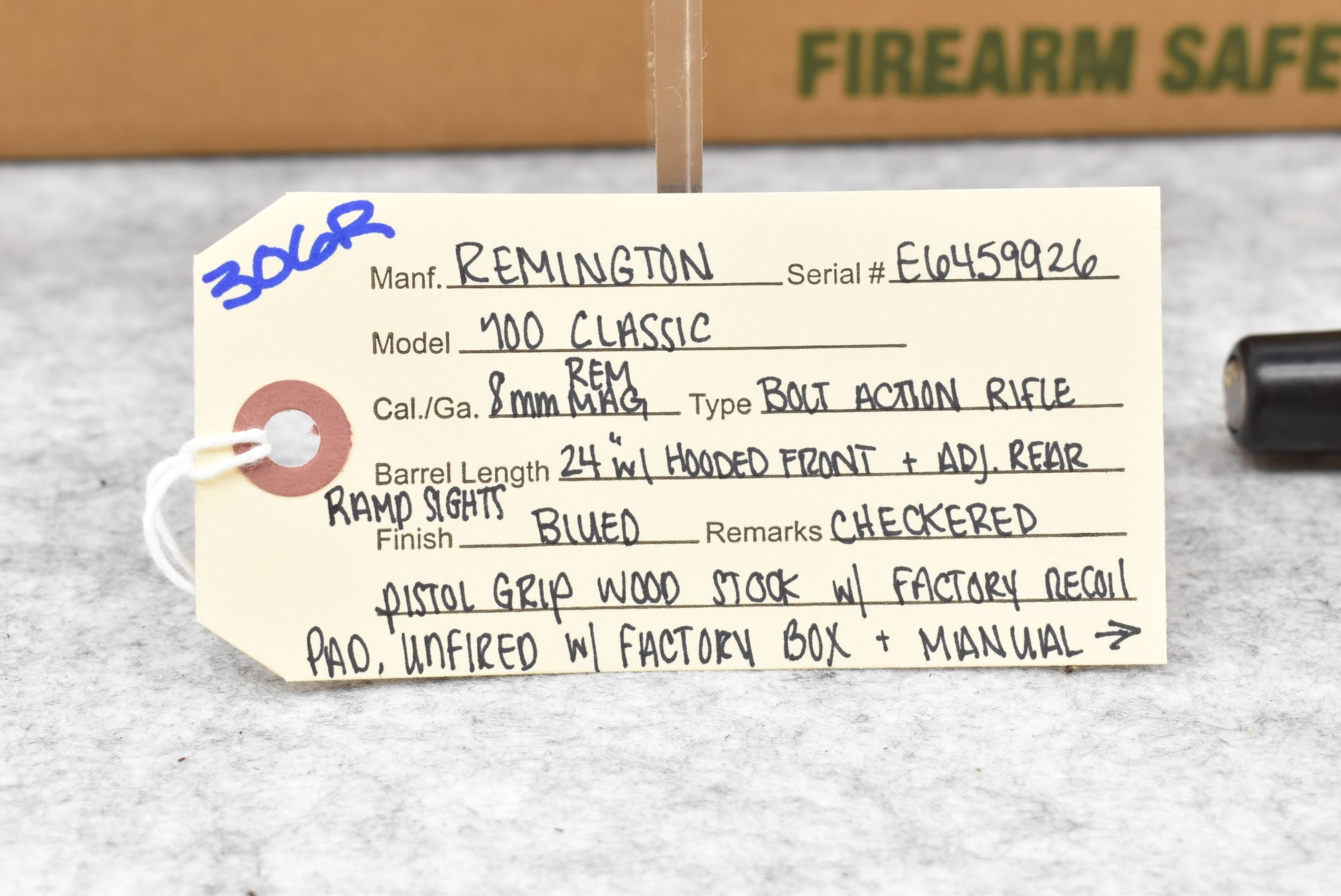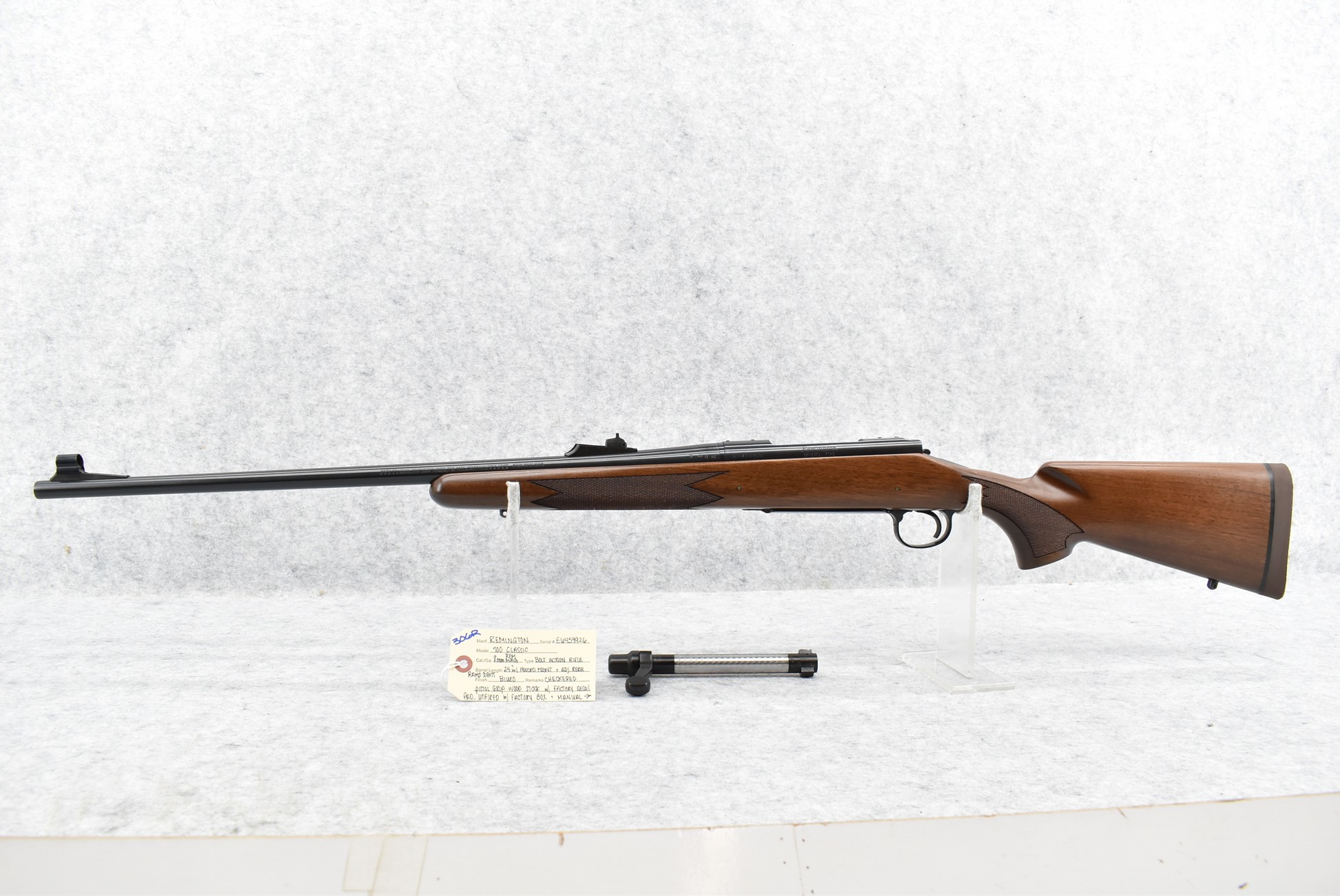 306R. Remington – Mod. 700 Classic – 8mm Rem. Mag. Cal. Bolt Action Rifle – w/24” Barrel w/Hooded Front & Adj. Rear Ramp Sights – Blued Finish – w/Checkered Pistol Grip Wood Stock w/Factory Recoil Pad – Unfired w/Factory Box & Manual – 8mm Rem. Mag. Cal. Was 1998 Caliber of the Year