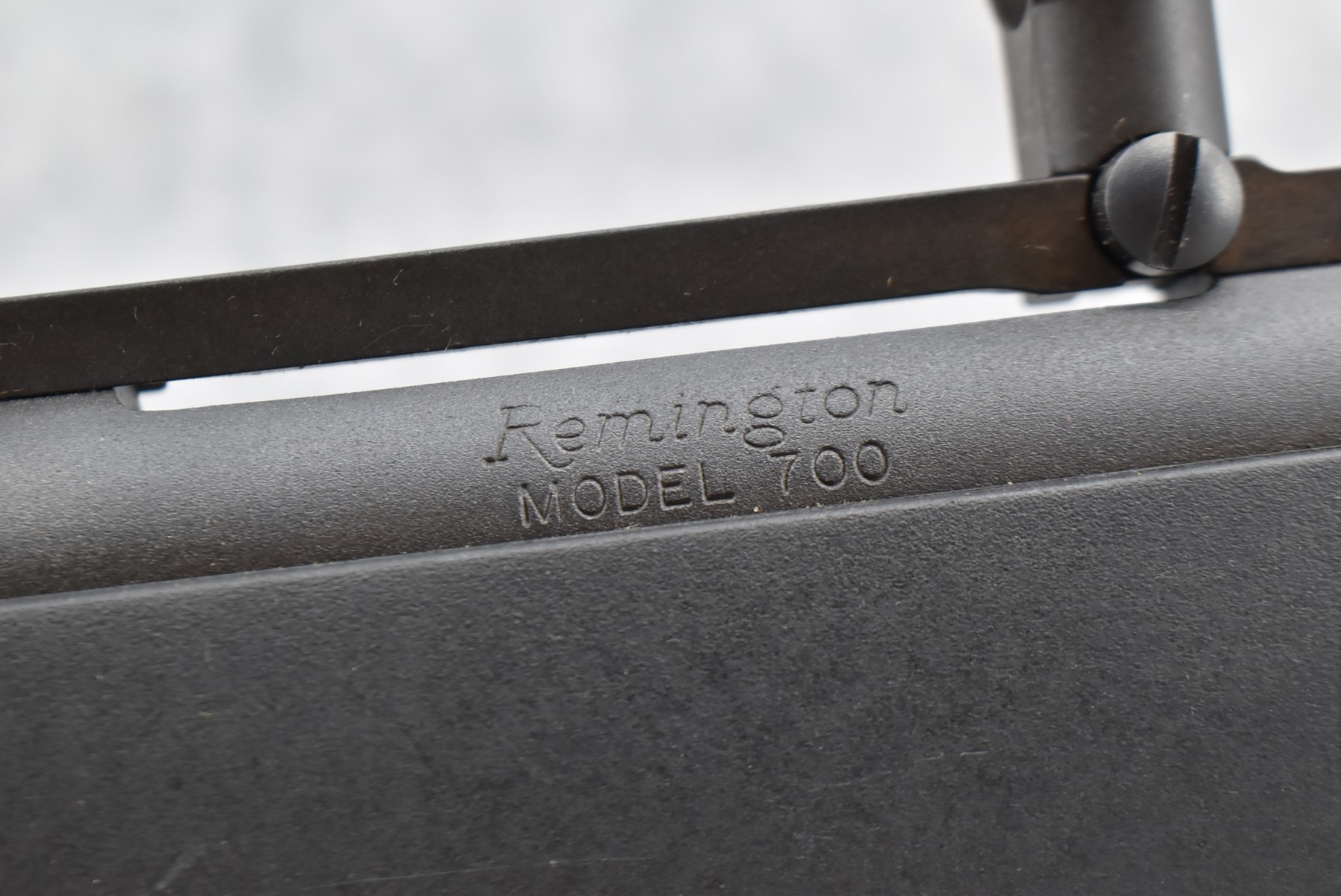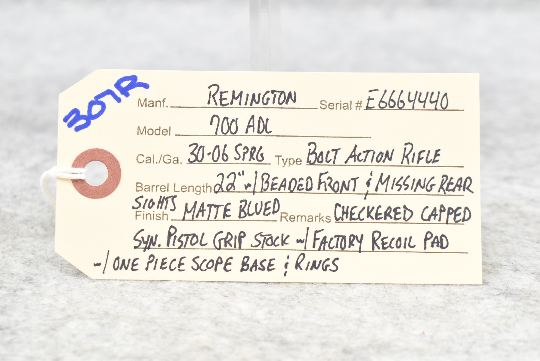 307R. Remington – Mod. 700 ADL – 30-06 Sprg. Cal. Bolt Action Rifle – w/22” Barrel w/Beaded Front Sight (Missing Rear Sights) – Matte Blued Finish – w/Checkered Capped Synthetic Pistol Grip Stock w/Factory Recoil Pad – w/Leupold 1pc. Scope Base & Rings